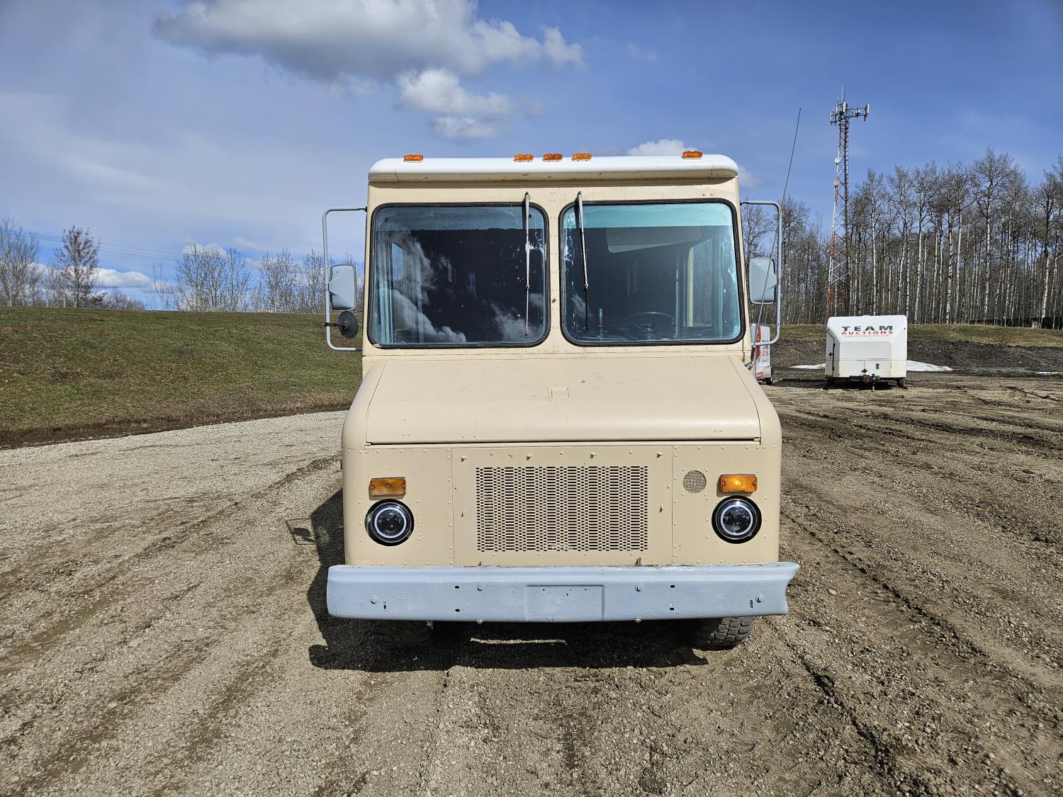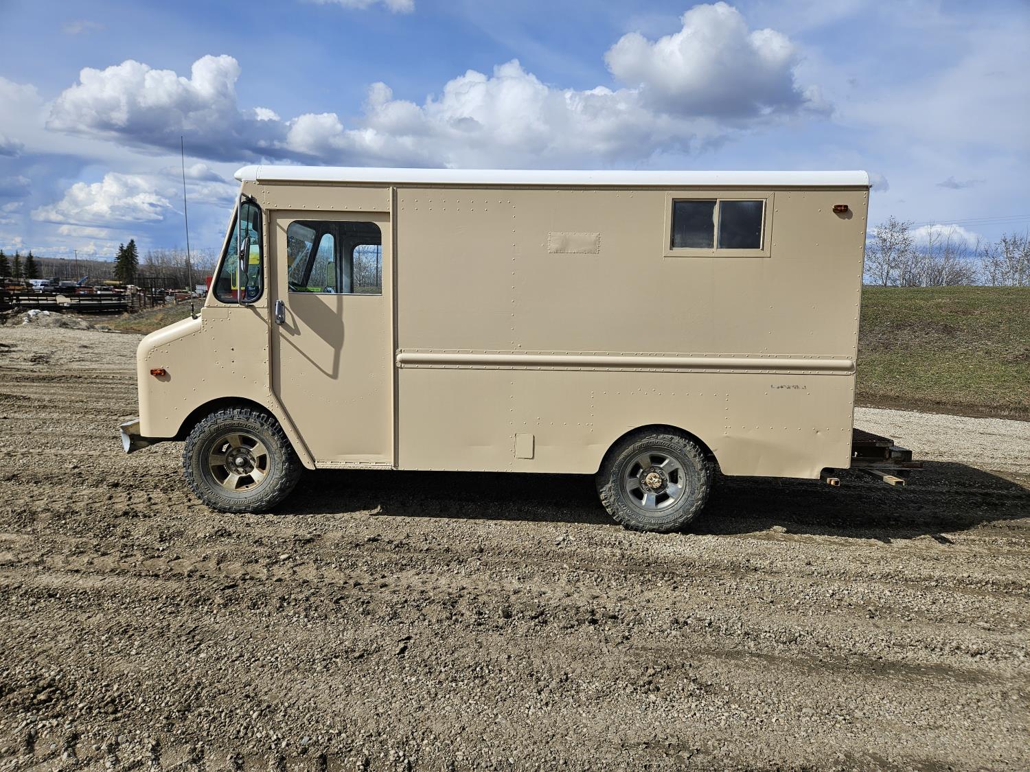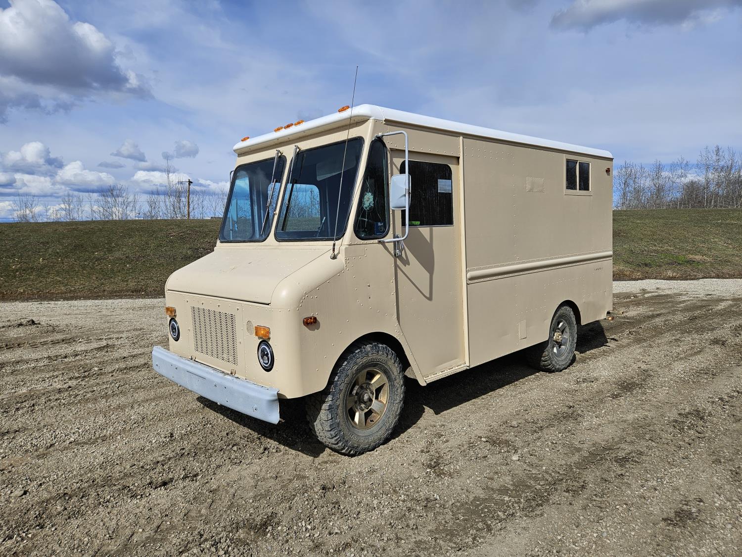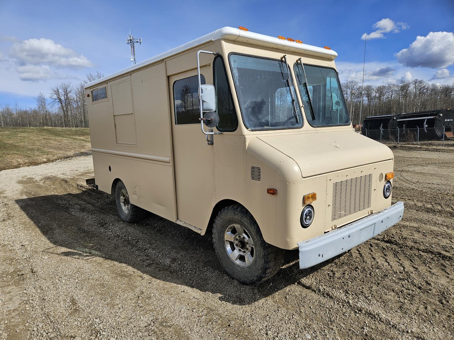 292 cu in, 6 cylinder, gas, 4 speed manual transmission, 410 carrier rear end, ceiling fan, leather captain seat not installed, diesel furnace not installed, spare tire, 33X12.50R17 tires