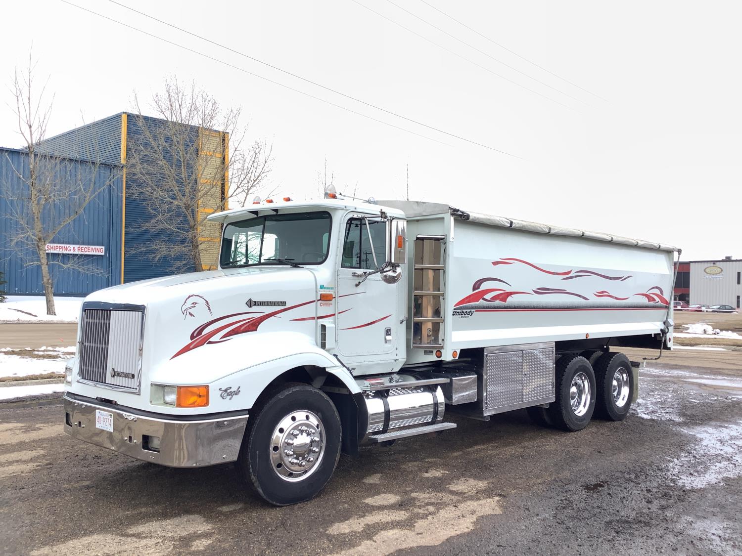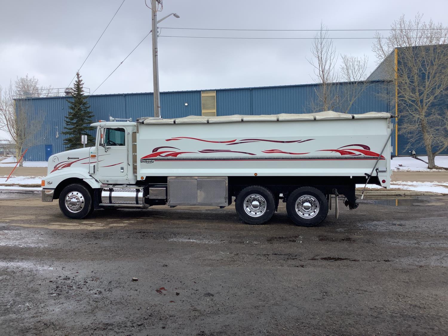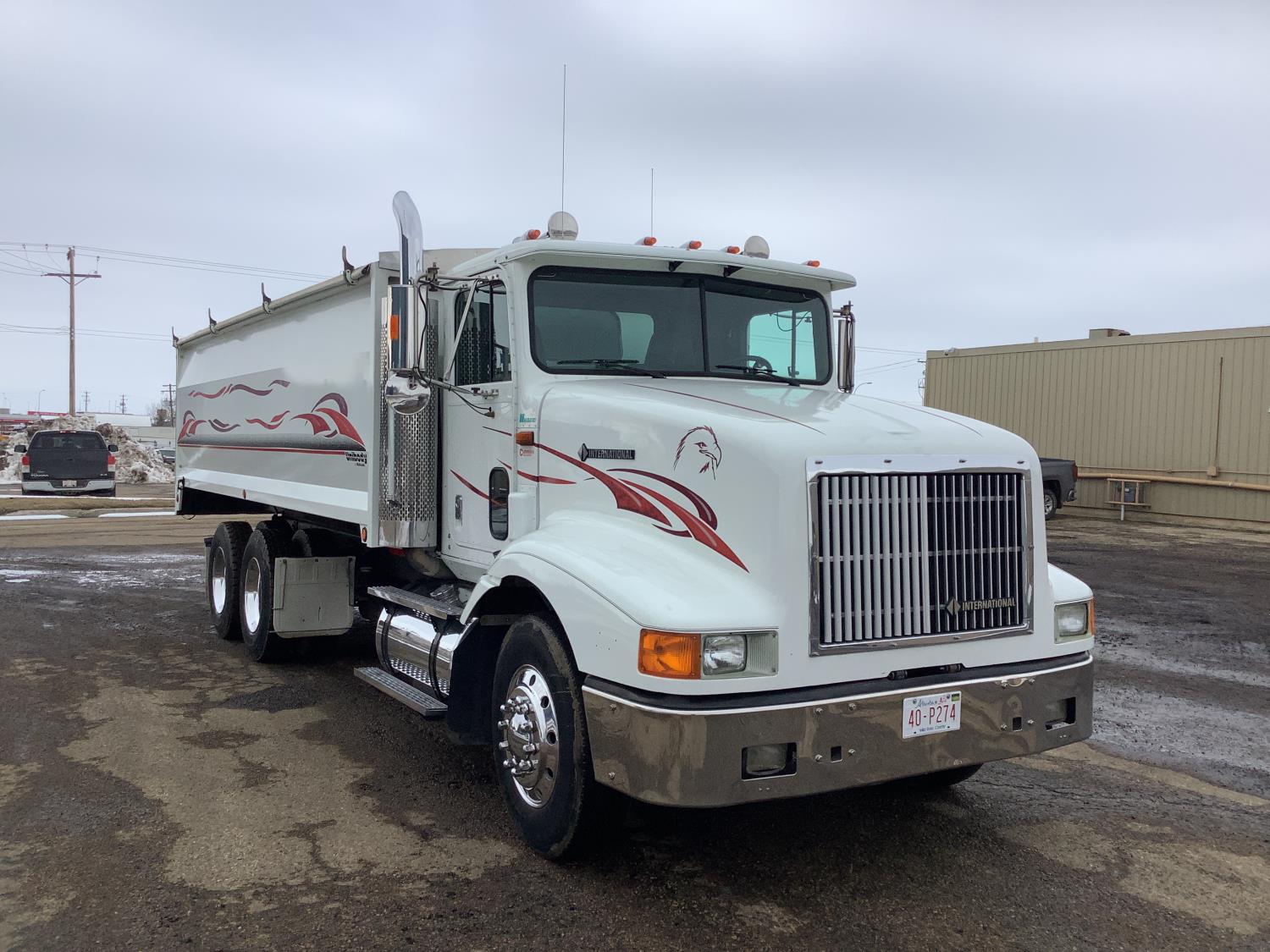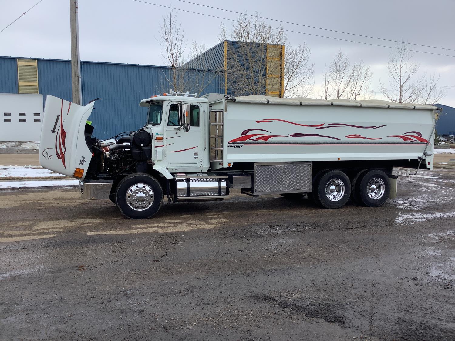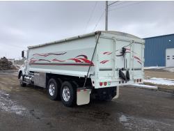 Cummins M11 6 cylinder 370 HP engine, engine brake, 10 speed manual transmission, A/C, cruise control, air ride driver seat, radio, Eagle interior package , air shift PTO, side mount tool box, 20 ft Midland Unibody grain box, roll tarp, Harsh hoist, 3 piece tailgate, wireless remote for hoist and rear tailgate chute, air brake control, pintle hitch, air ride suspension, 12,500 lb front axle, 40,000 lb rear axles, 3 way diff locks, all aluminum wheels, 11R22.5 tires