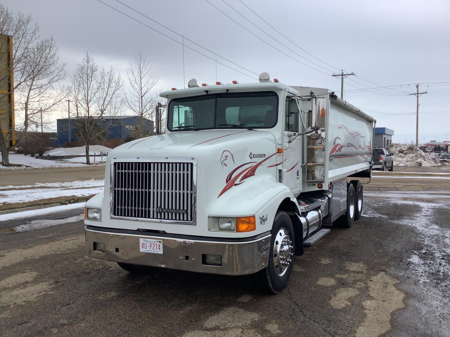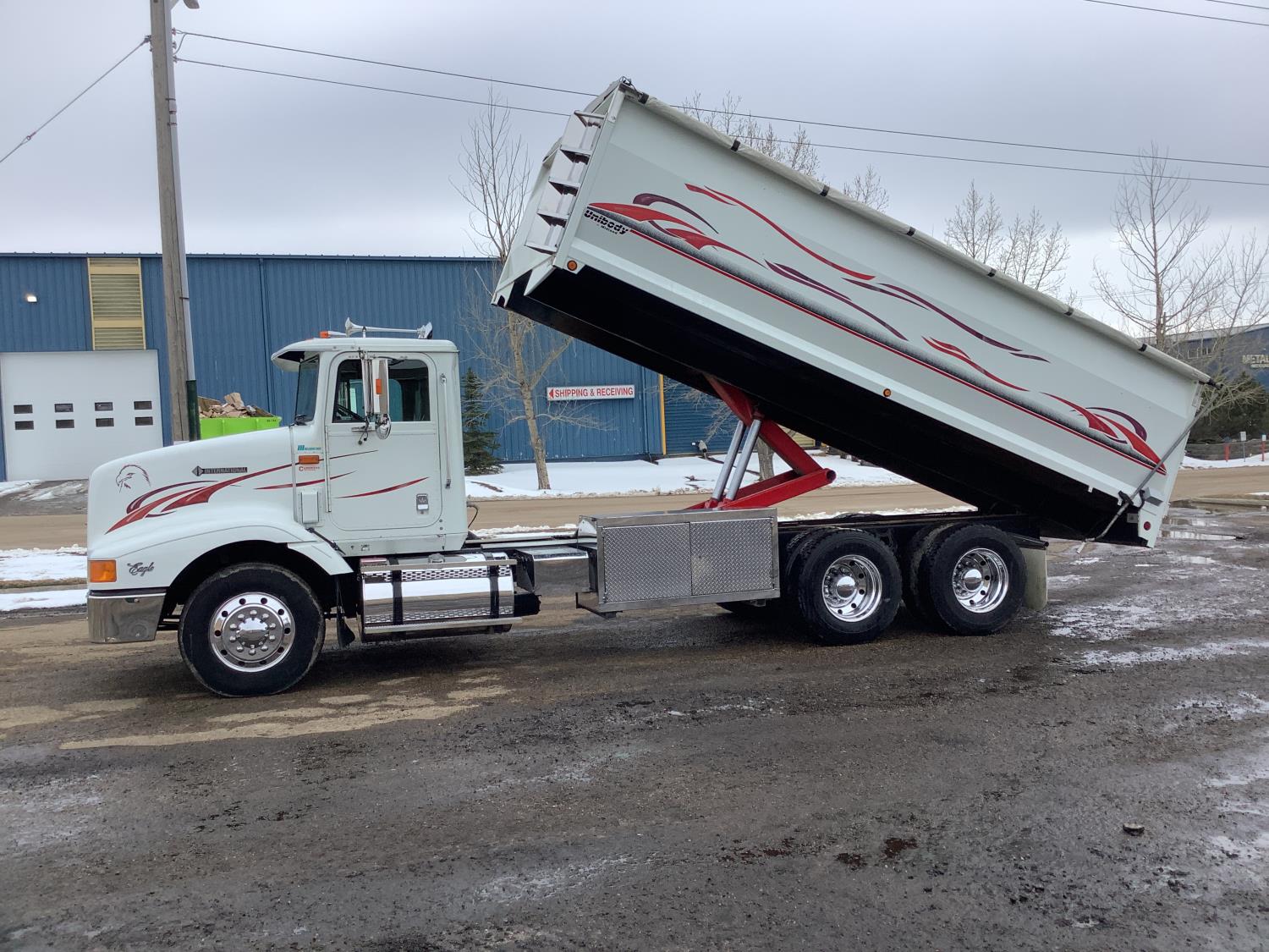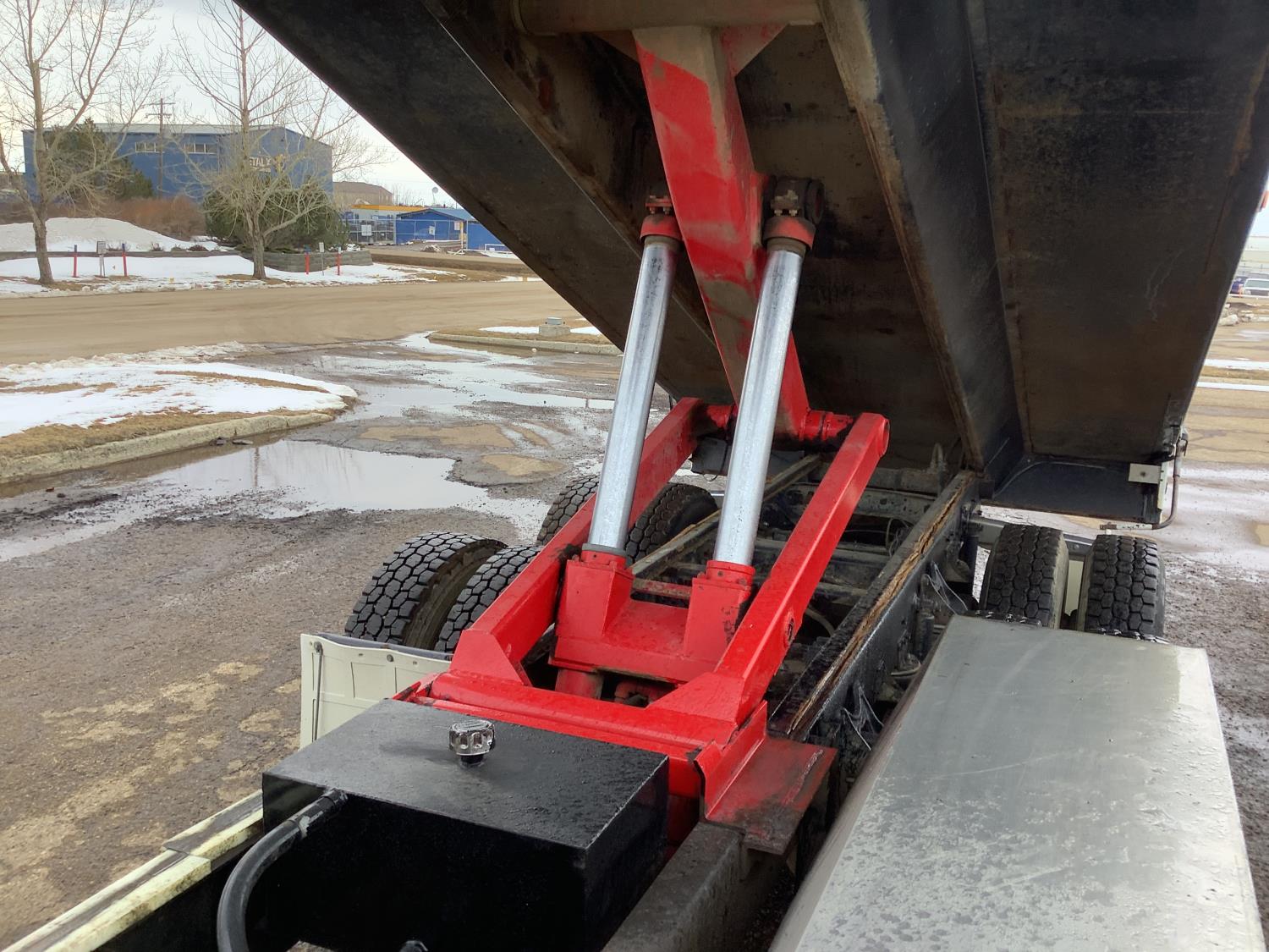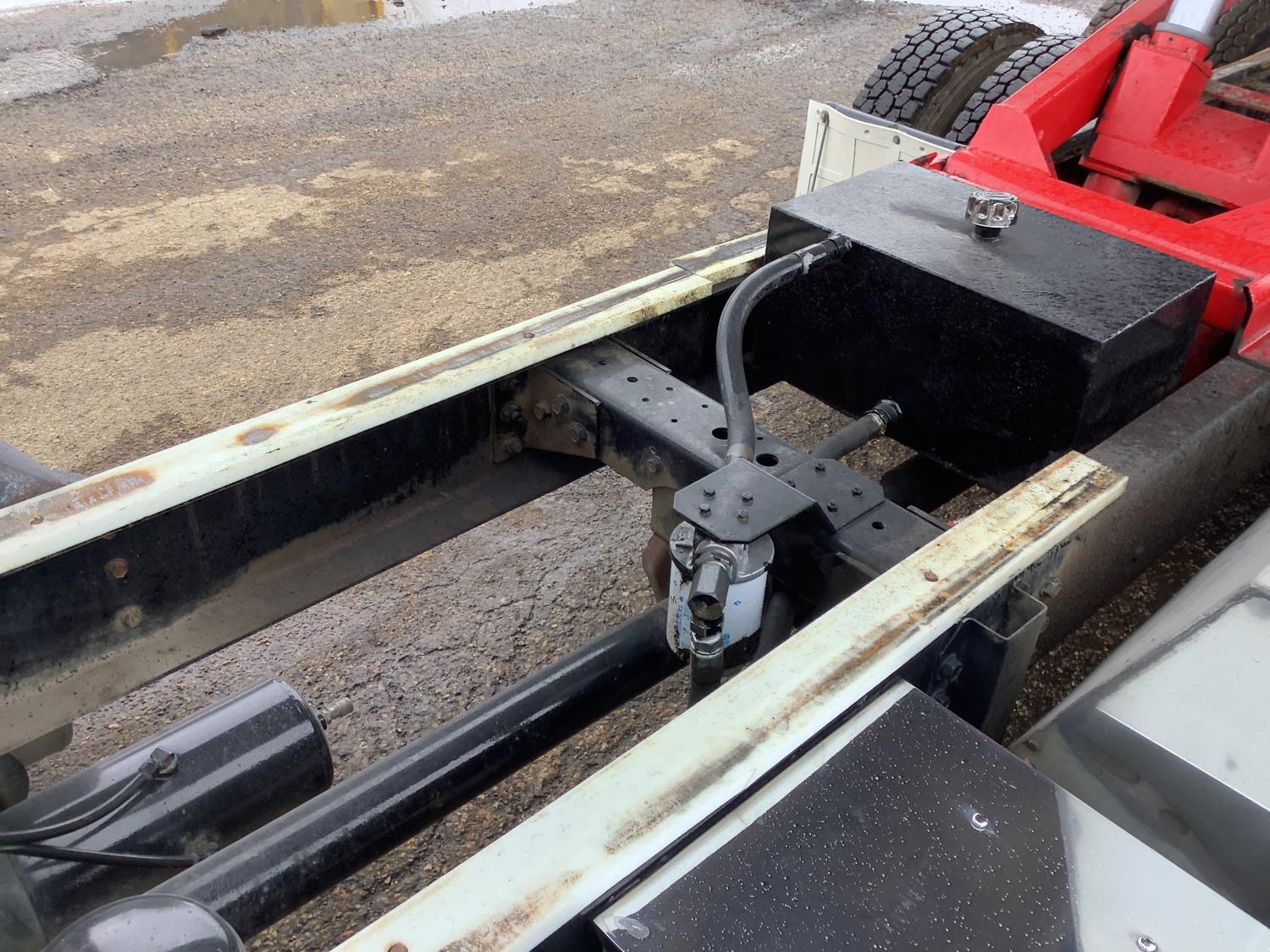 Cummins M11 6 cylinder 370 HP engine, engine brake, 10 speed manual transmission, A/C, cruise control, air ride driver seat, radio, Eagle interior package , air shift PTO, side mount tool box, 20 ft Midland Unibody grain box, roll tarp, Harsh hoist, 3 piece tailgate, wireless remote for hoist and rear tailgate chute, air brake control, pintle hitch, air ride suspension, 12,500 lb front axle, 40,000 lb rear axles, 3 way diff locks, all aluminum wheels, 11R22.5 tires