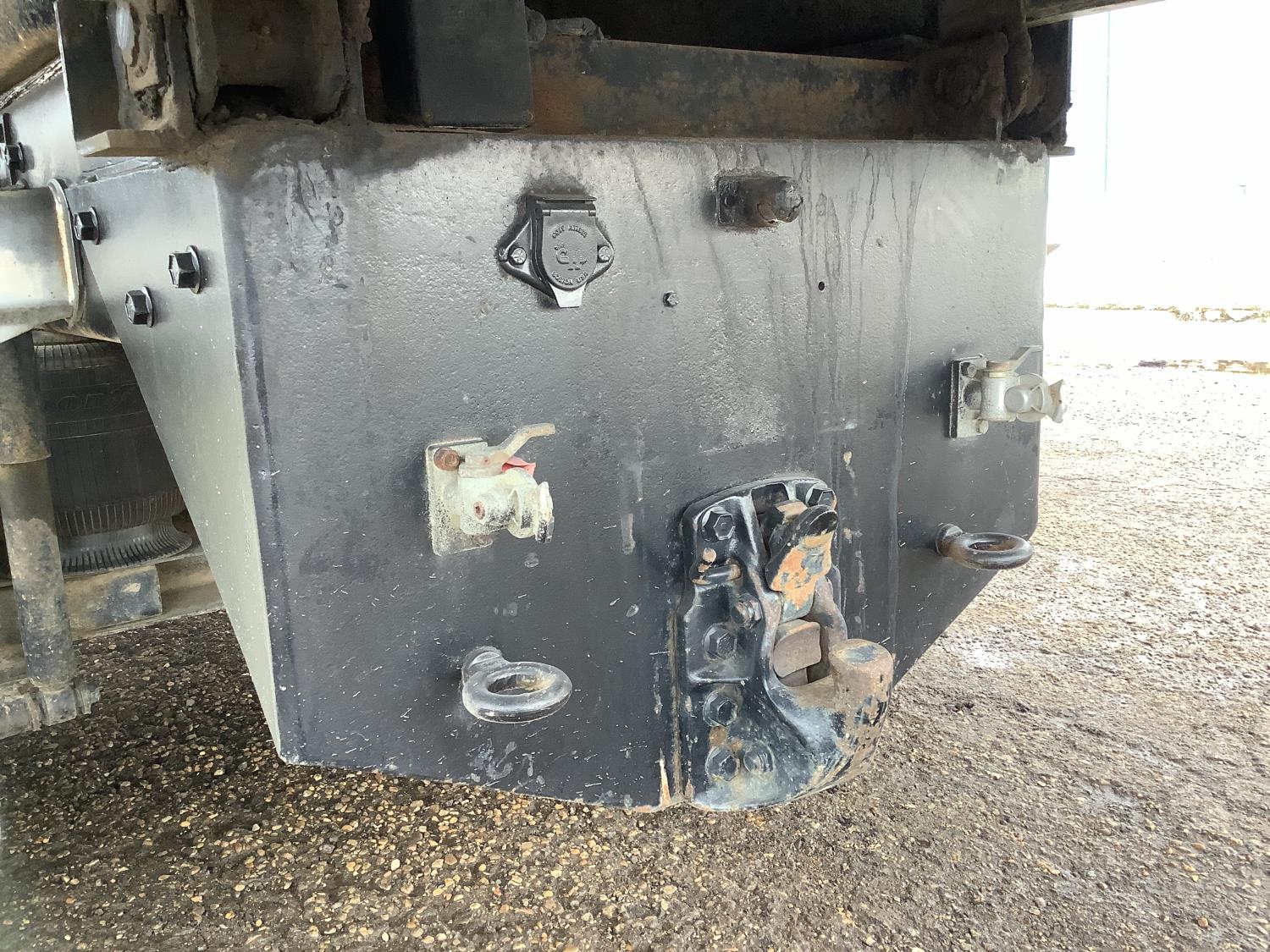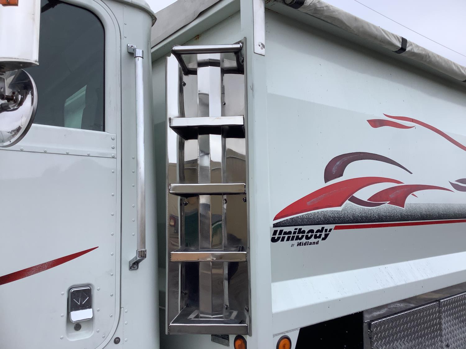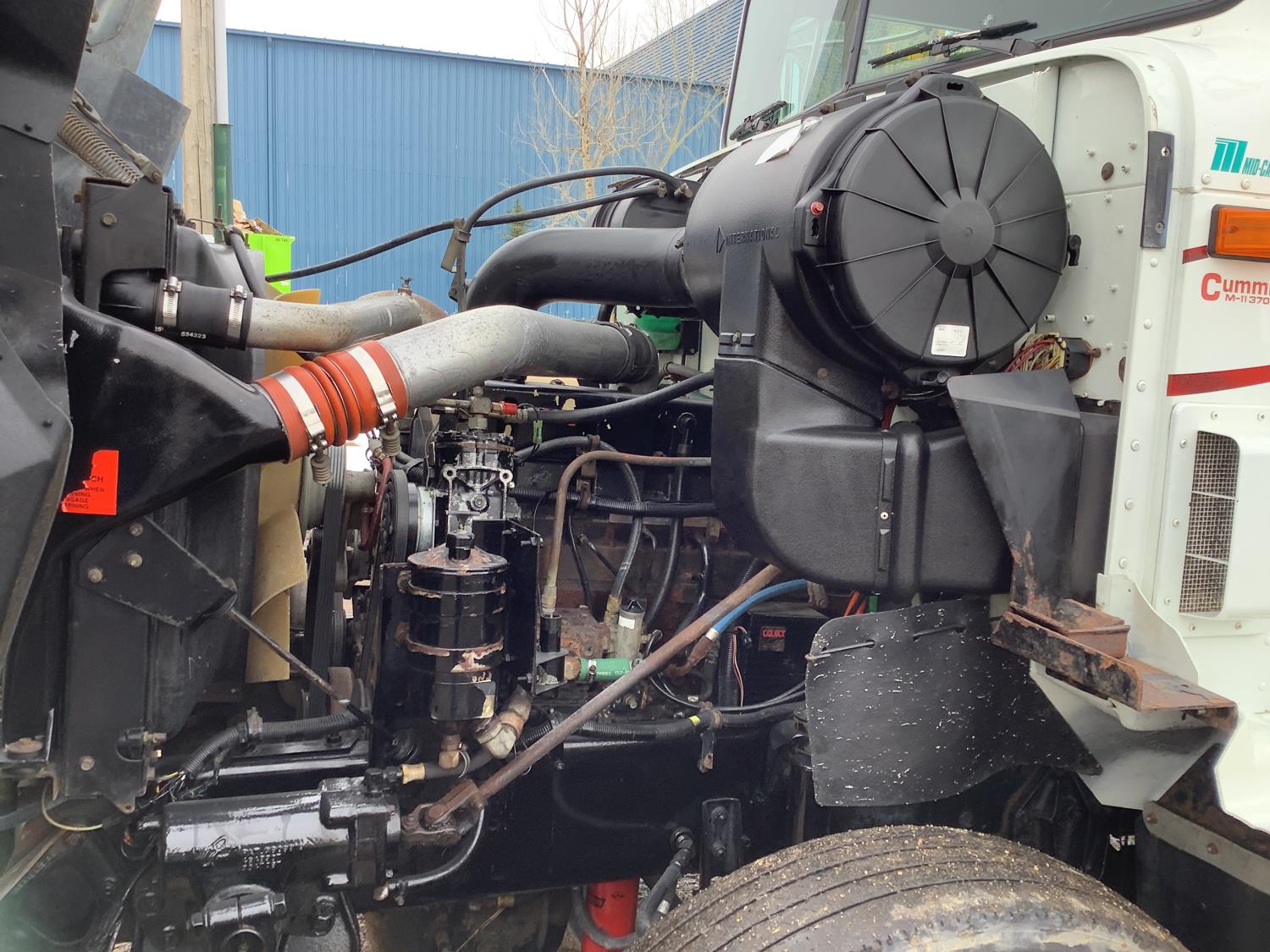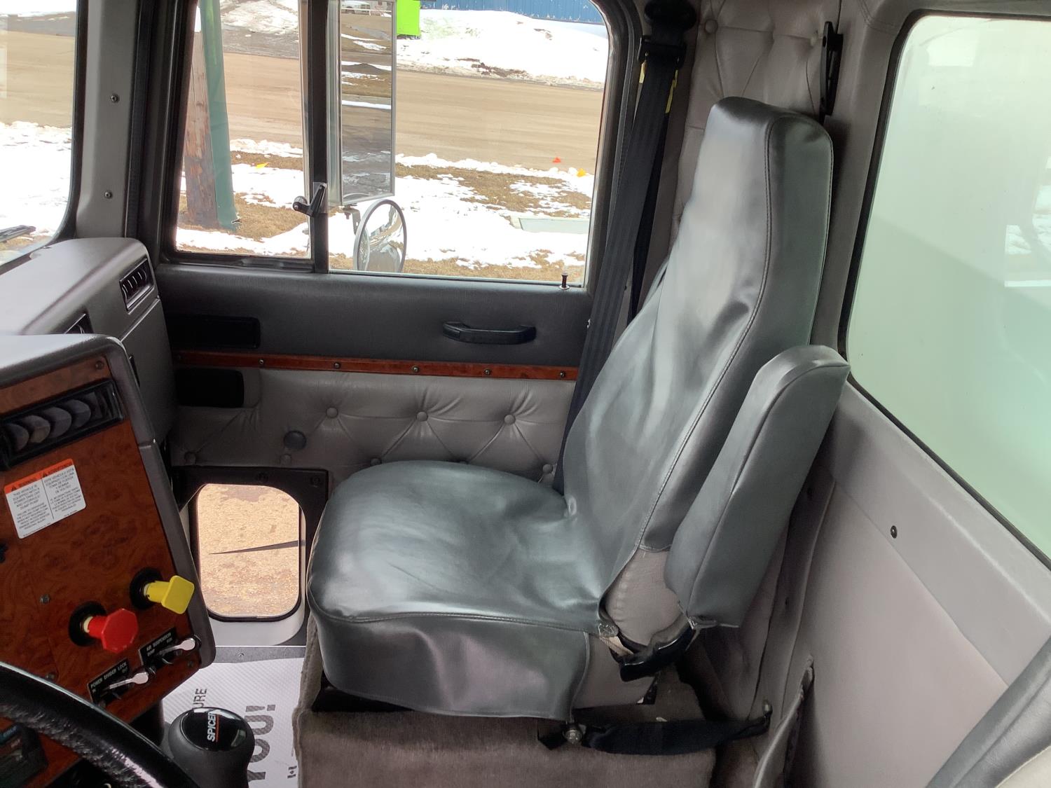 Cummins M11 6 cylinder 370 HP engine, engine brake, 10 speed manual transmission, A/C, cruise control, air ride driver seat, radio, Eagle interior package , air shift PTO, side mount tool box, 20 ft Midland Unibody grain box, roll tarp, Harsh hoist, 3 piece tailgate, wireless remote for hoist and rear tailgate chute, air brake control, pintle hitch, air ride suspension, 12,500 lb front axle, 40,000 lb rear axles, 3 way diff locks, all aluminum wheels, 11R22.5 tires