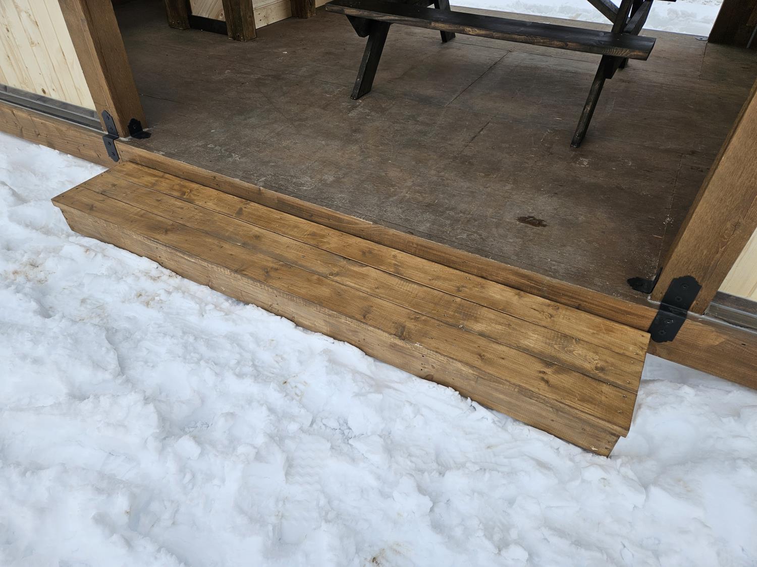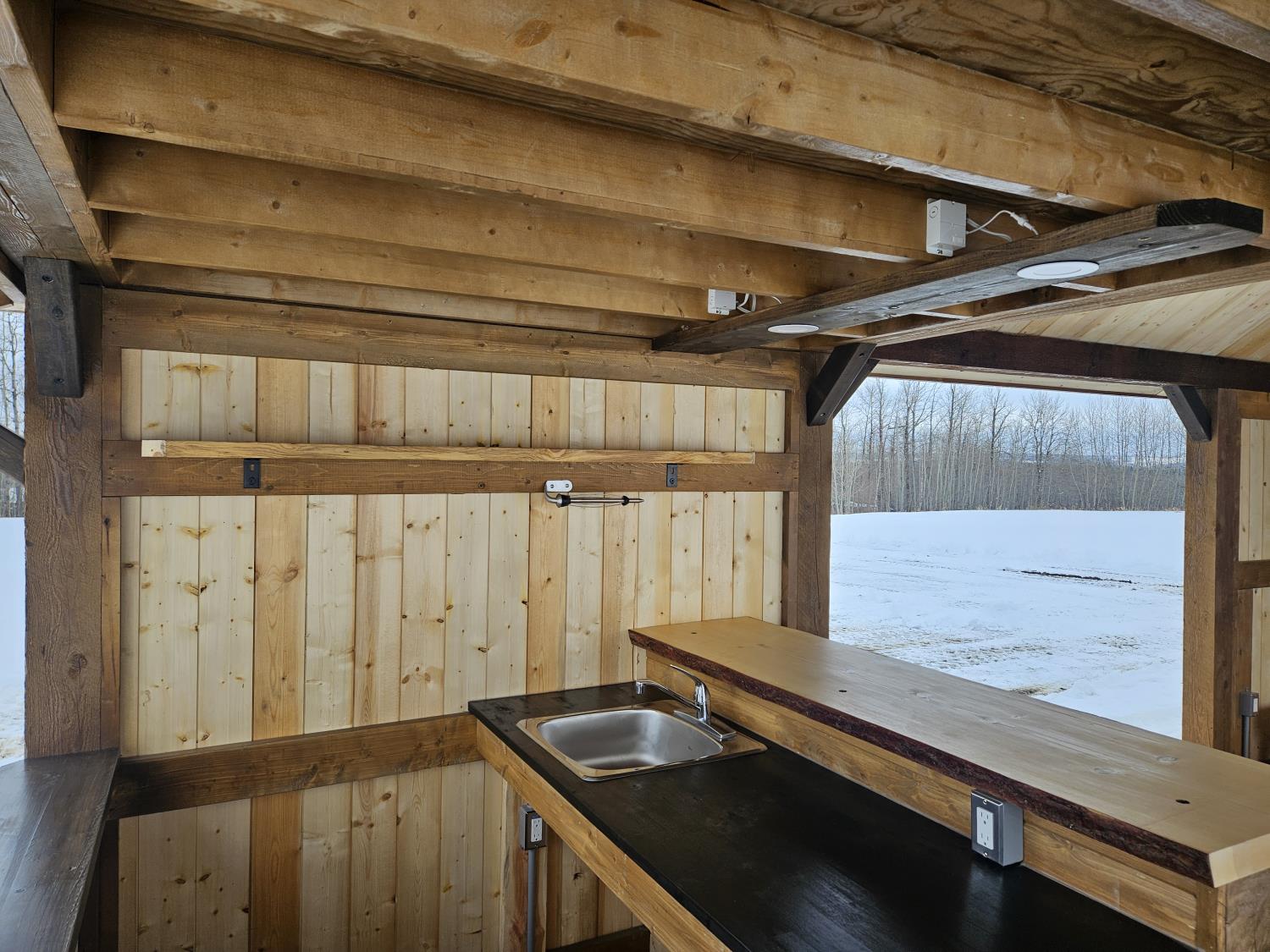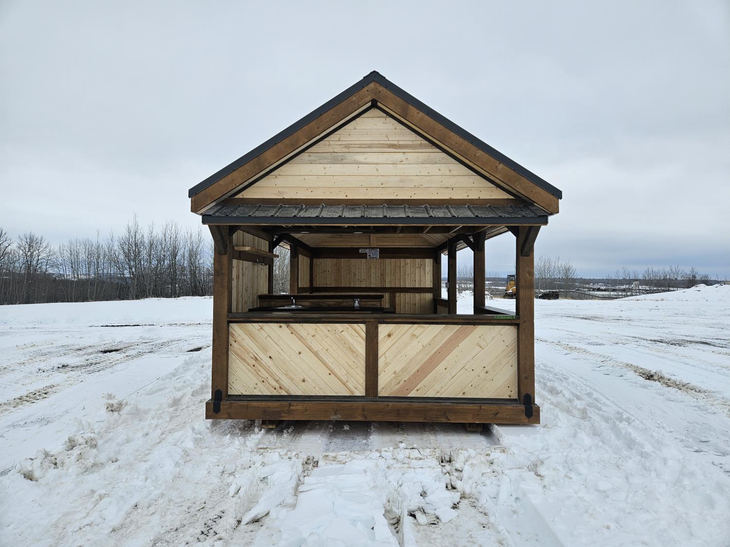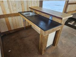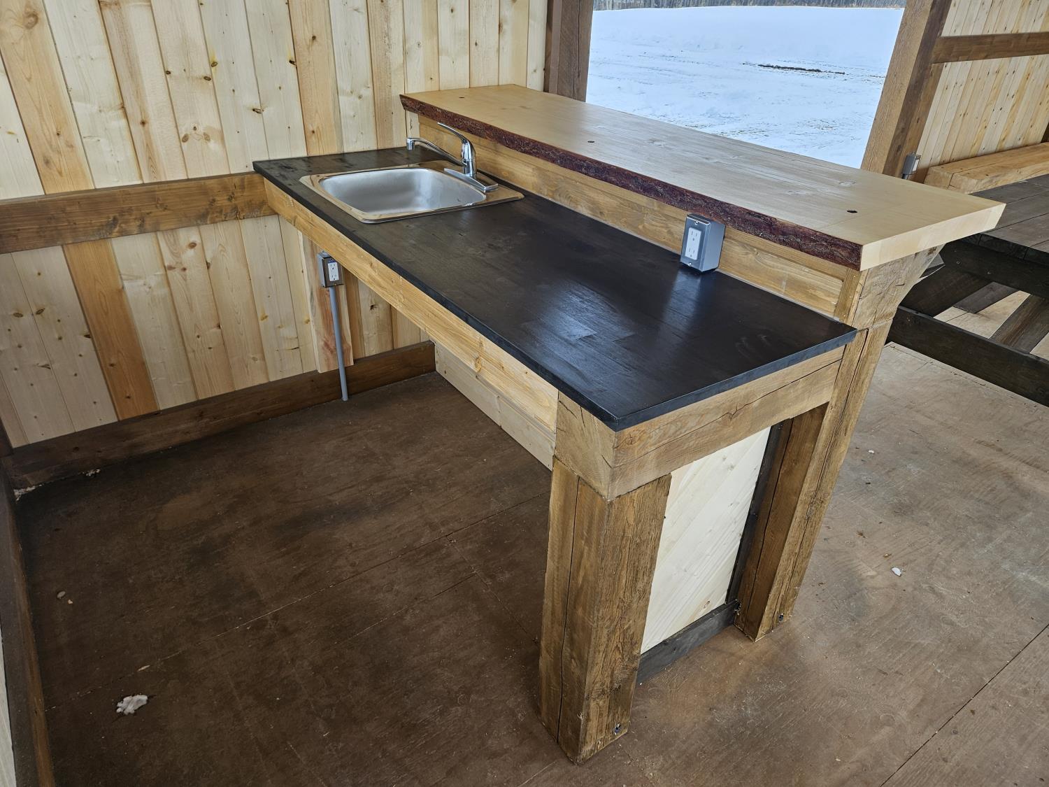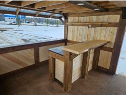 24 ft x 12 ft, kitchen counter and sink, wired with lighting and receptacles, portable propane fire place, picnic table. loft, timber bench, tin roof, on skids