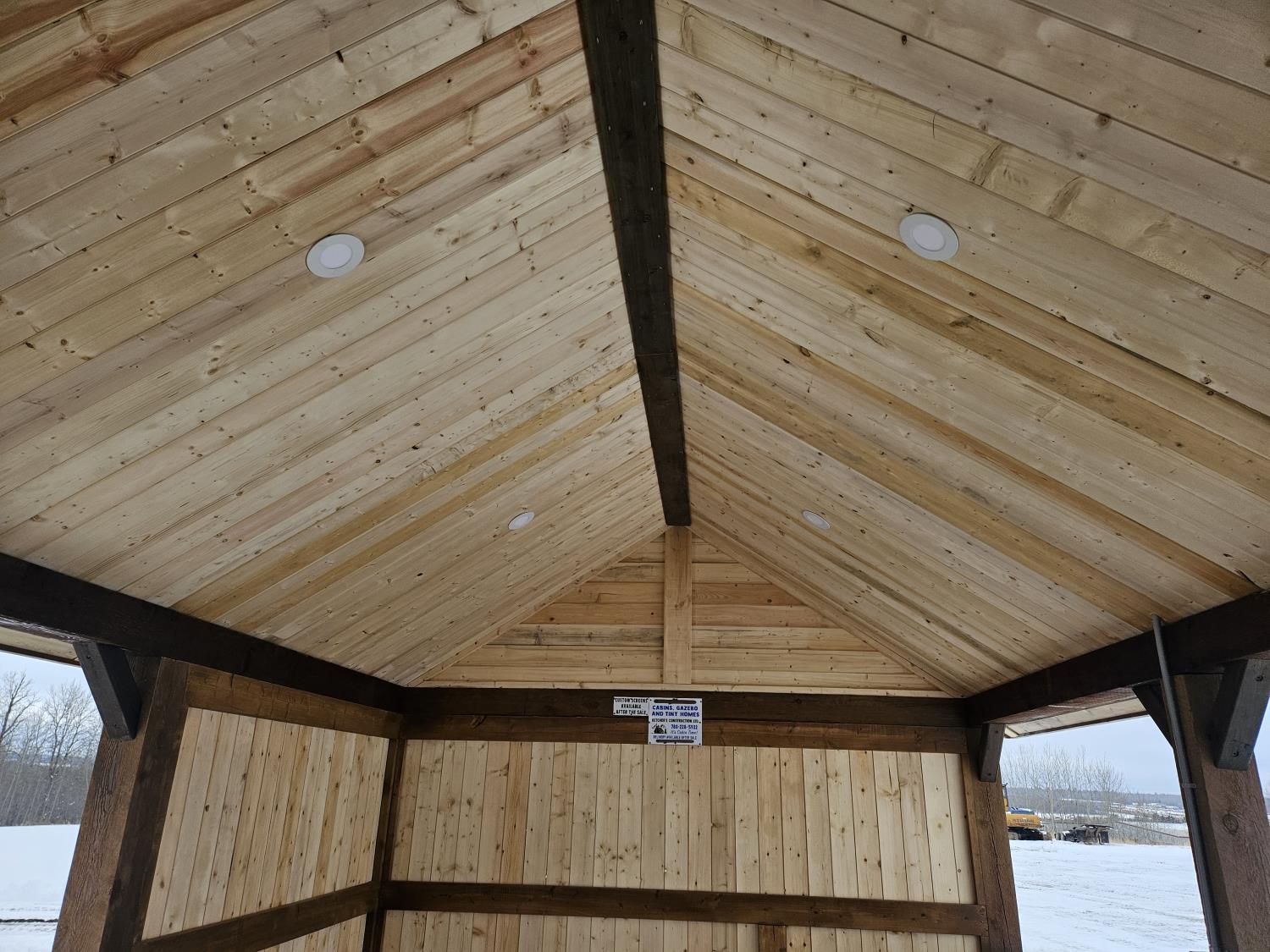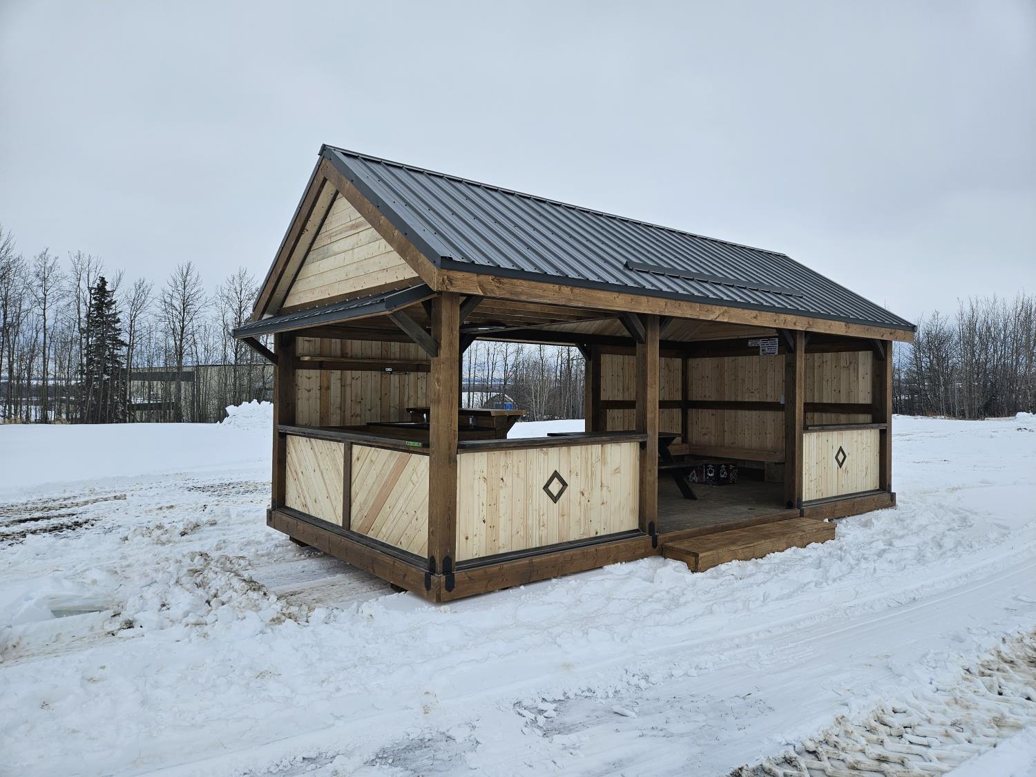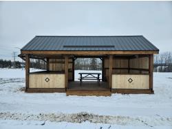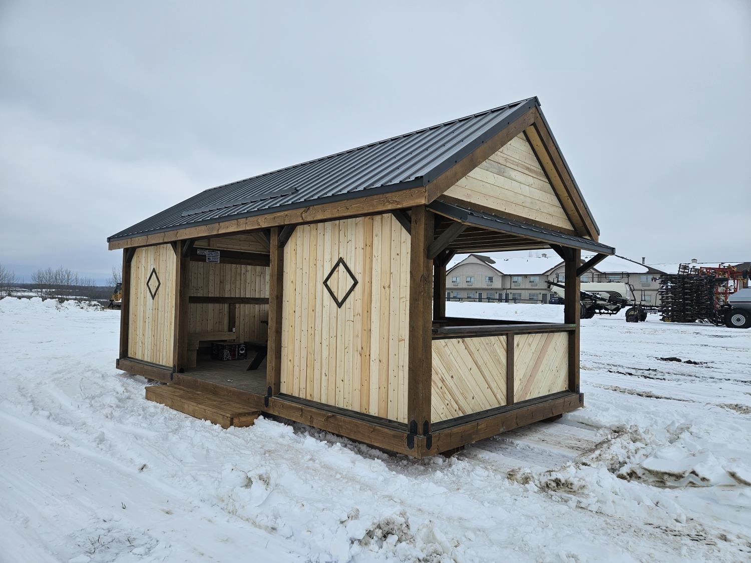 24 ft x 12 ft, kitchen counter and sink, wired with lighting and receptacles, portable propane fire place, picnic table. loft, timber bench, tin roof, on skids