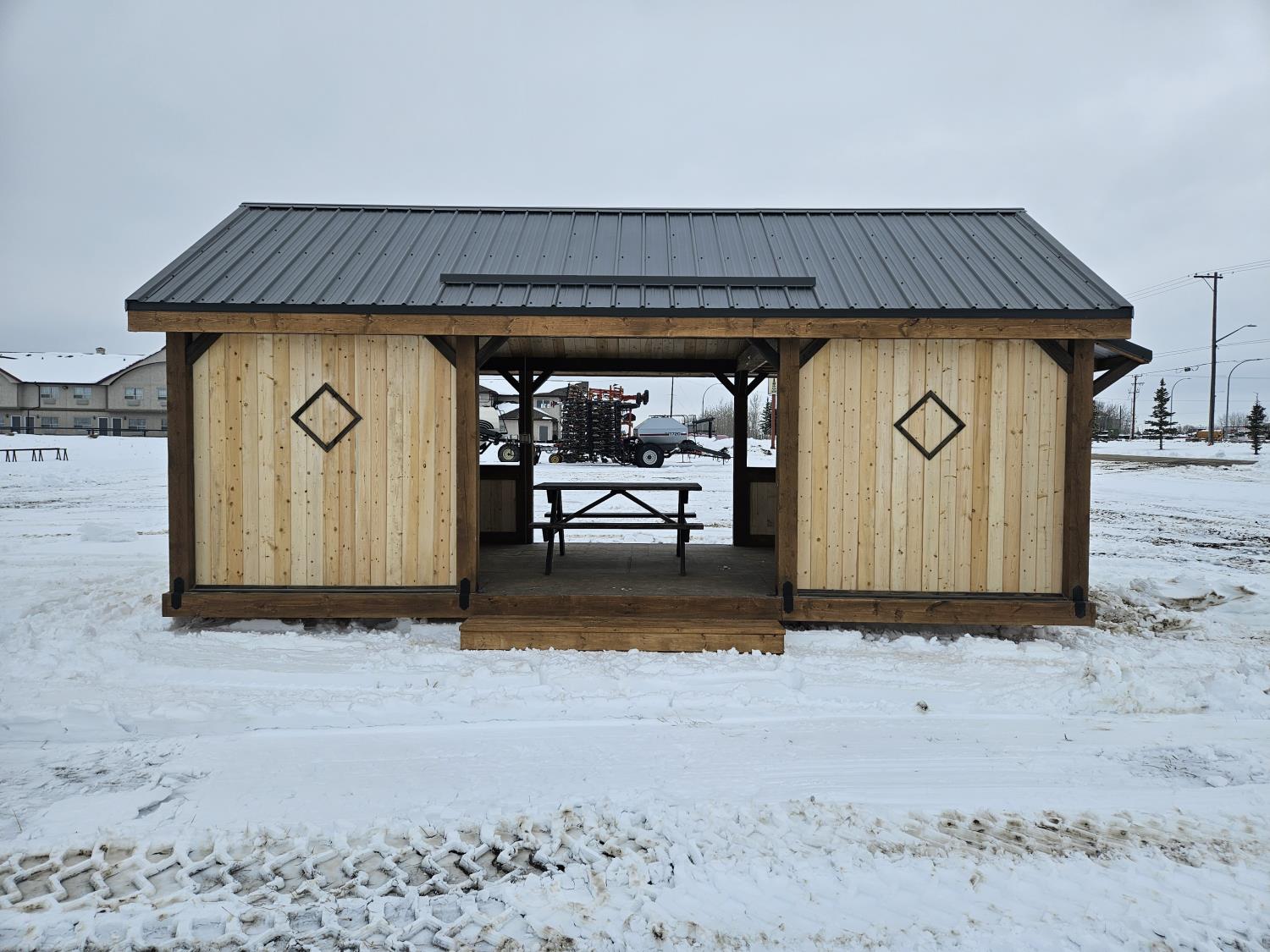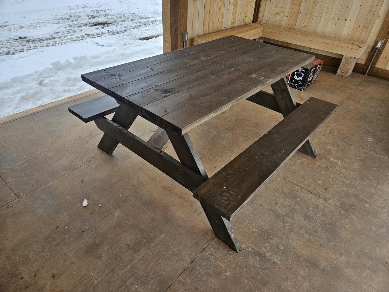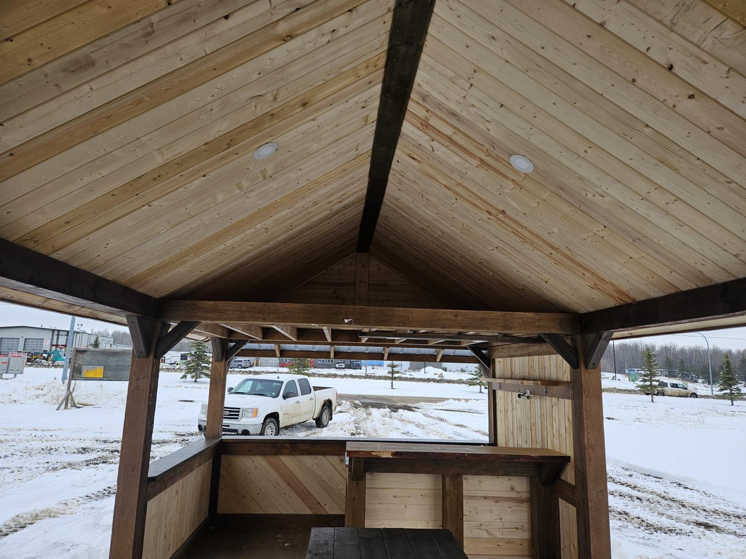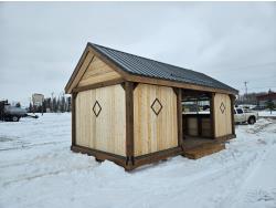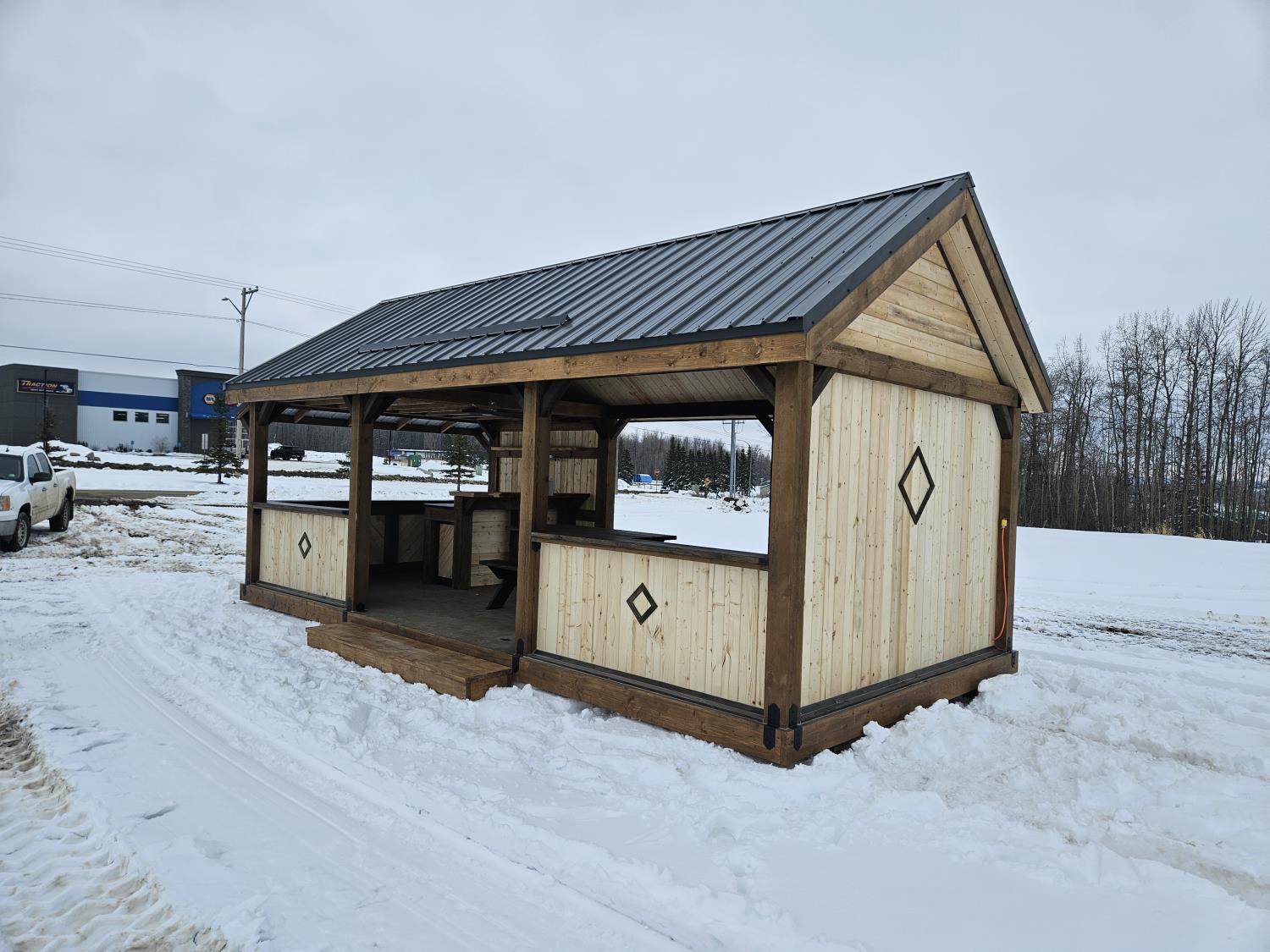 24 ft x 12 ft, kitchen counter and sink, wired with lighting and receptacles, portable propane fire place, picnic table. loft, timber bench, tin roof, on skids