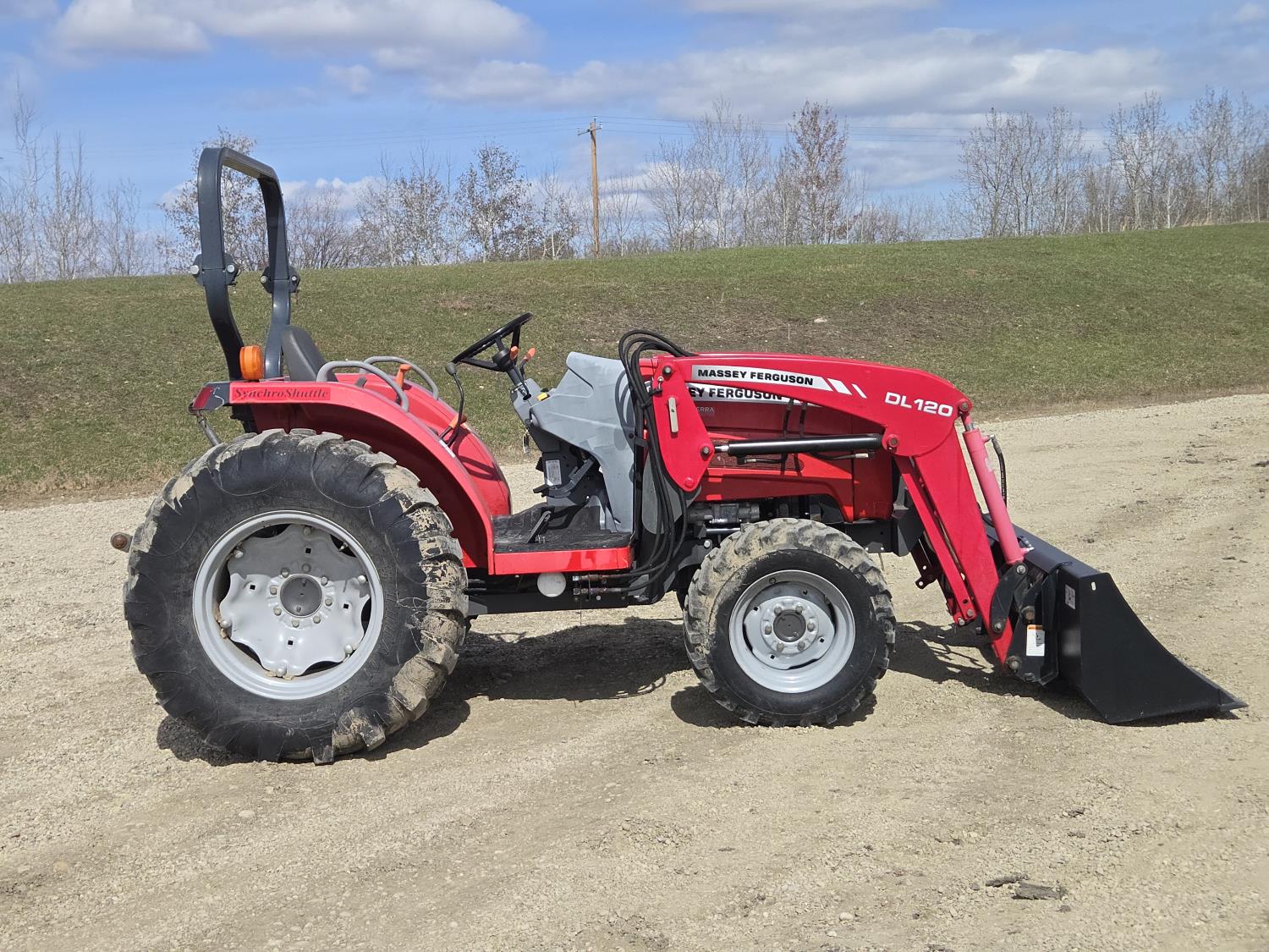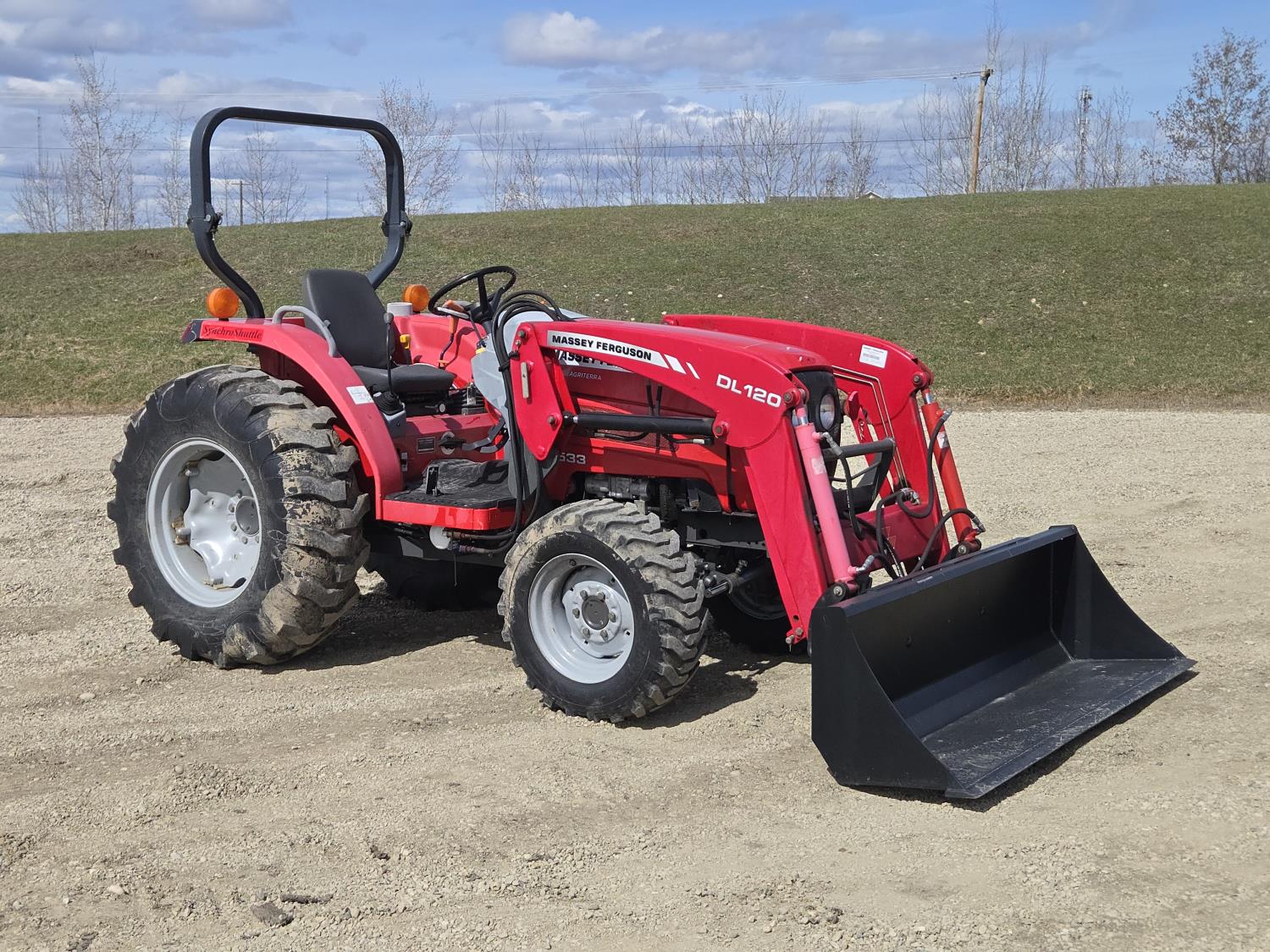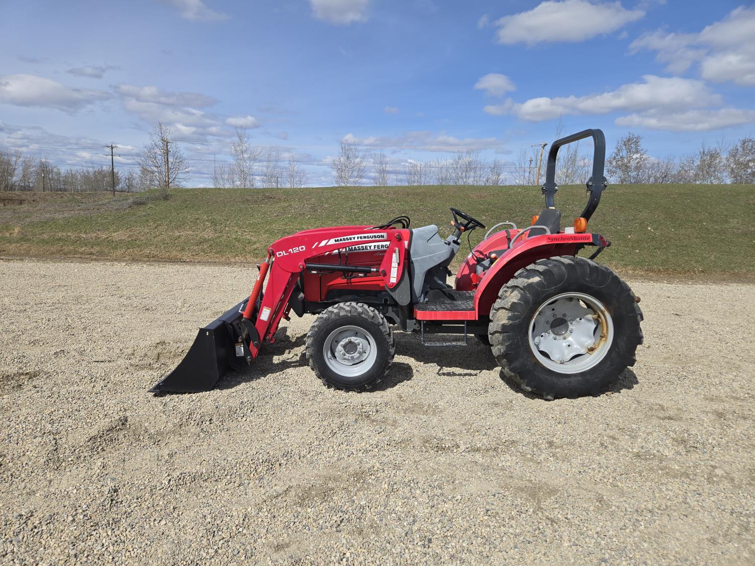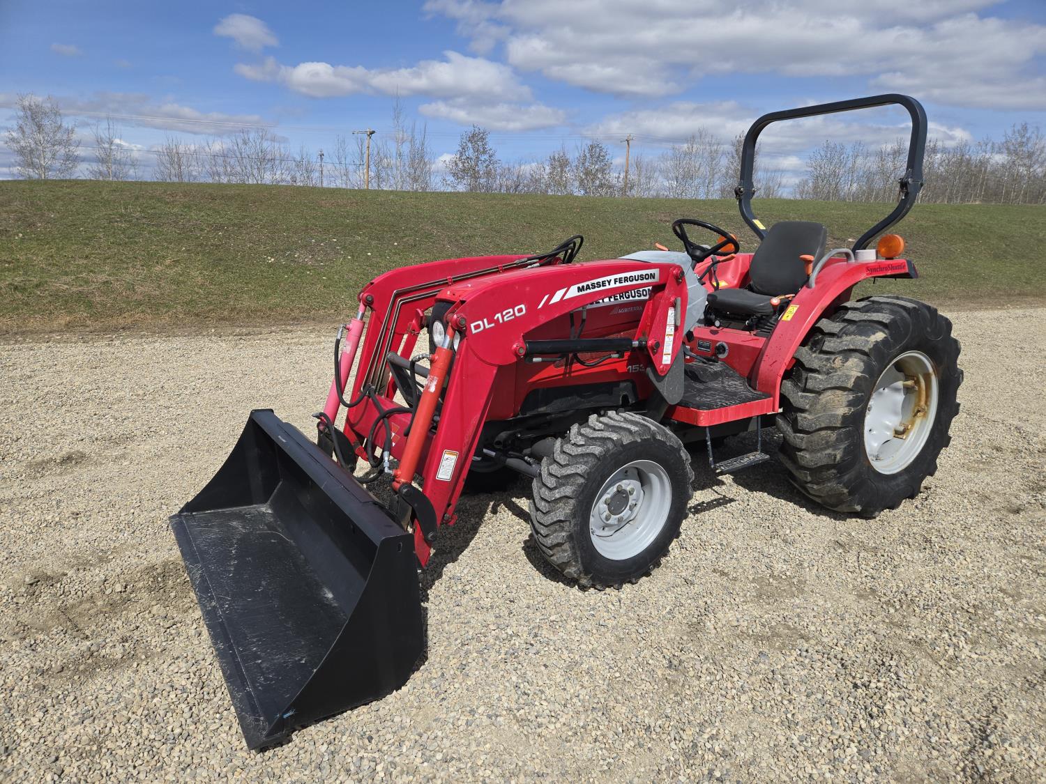 Massey Ferguson DL120 loader, 72 inch bucket, Iseki 1.5 L 3 cylinder 33 HP, diesel engine, 26 PTO HP, 8 speed manual transmission with creeper gear, open station platform, shuttle shift, rear differential lock, joystick, 540 PTO, 3 point hitch, rear wheel weights, 10-16.5 front tires, 14.9-24 rear tires