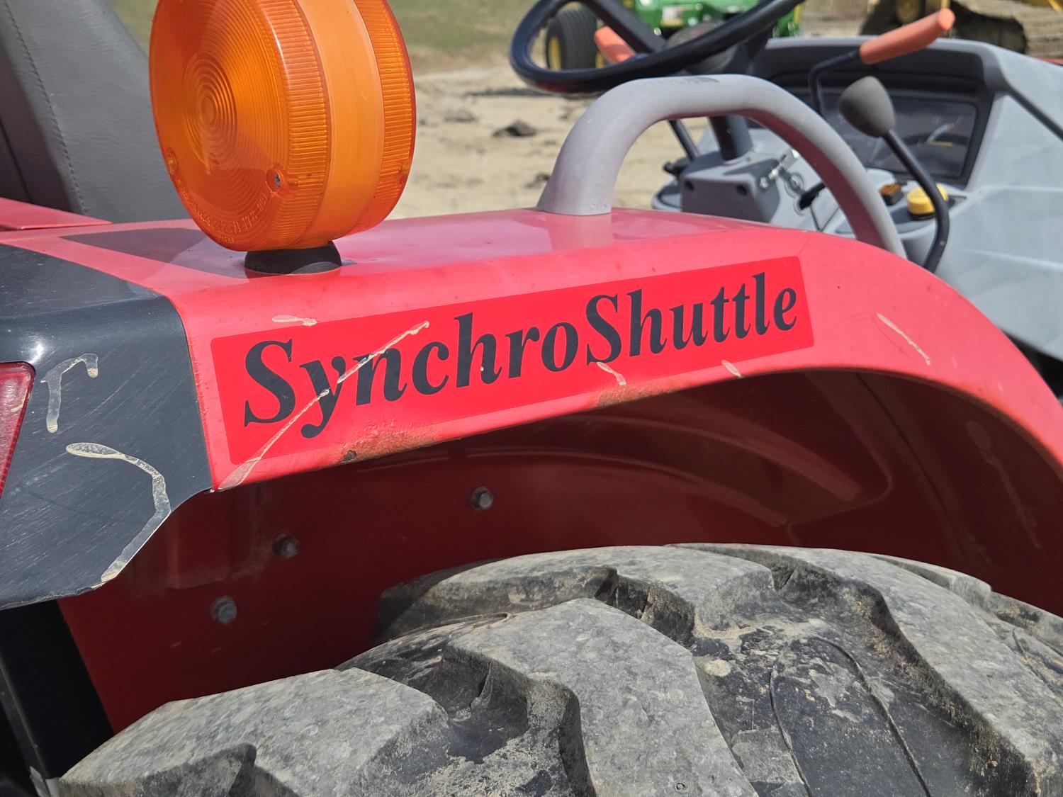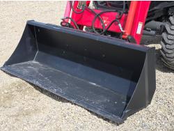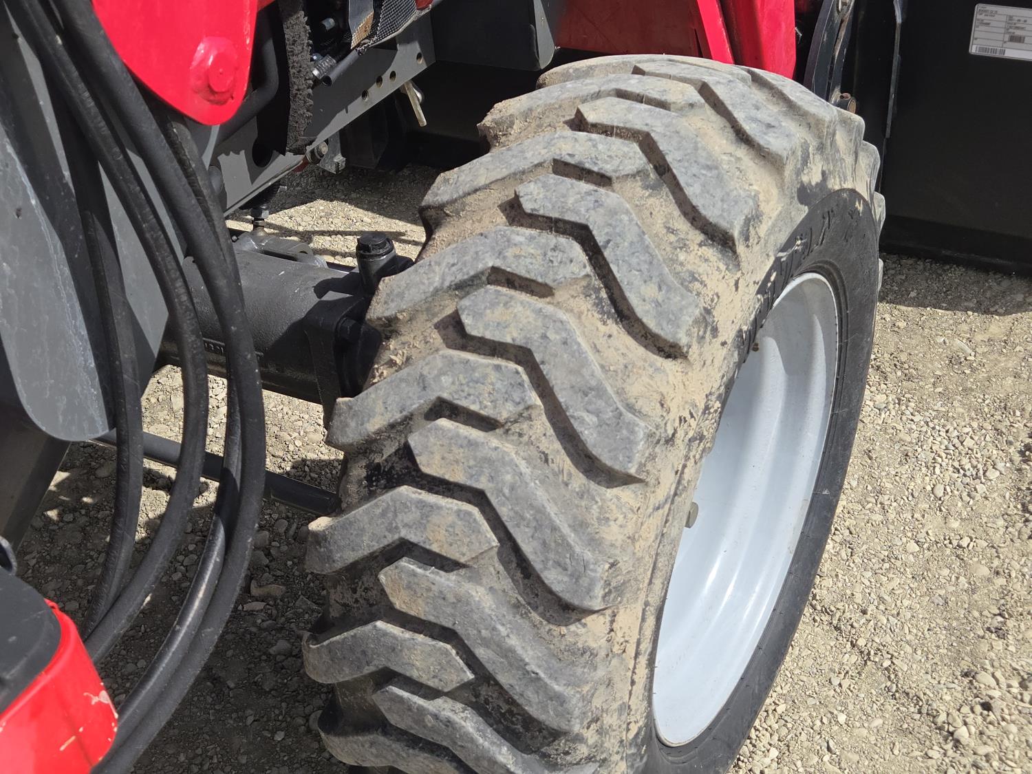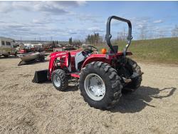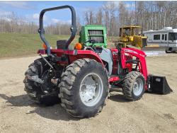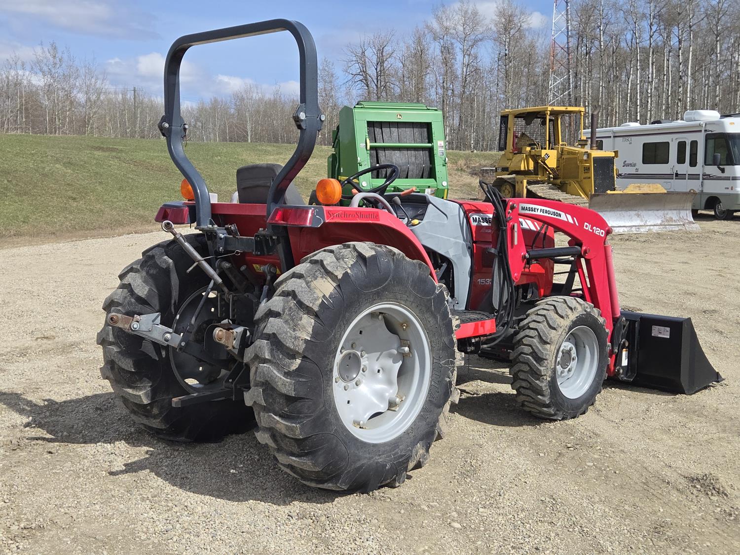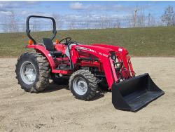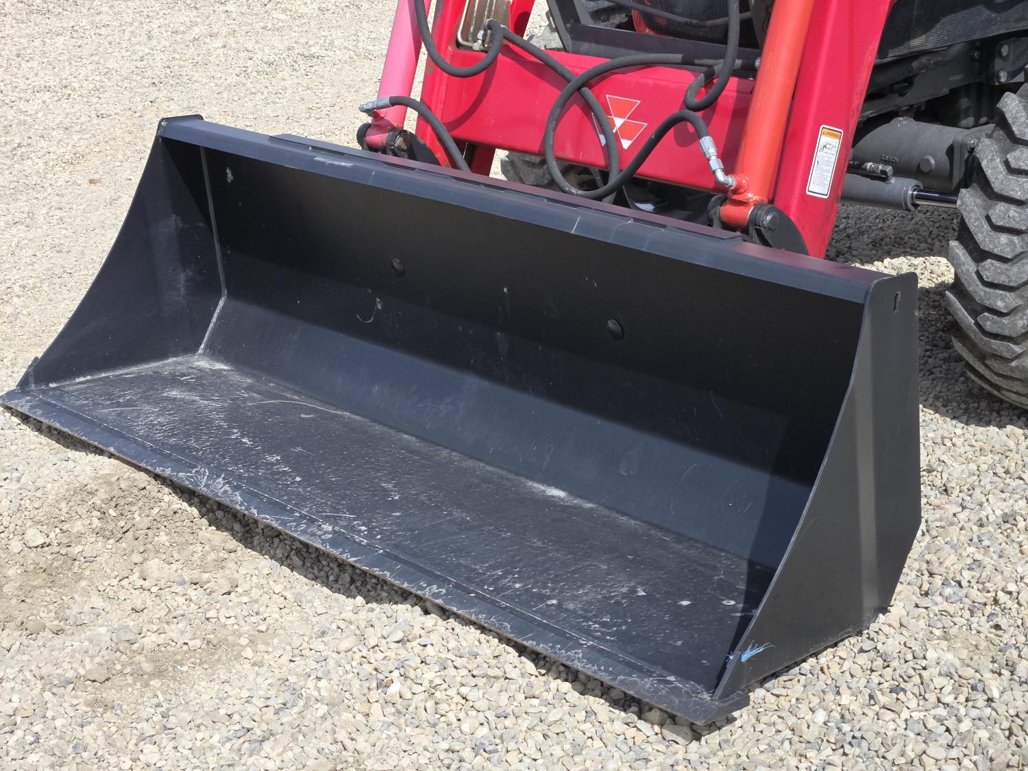 Massey Ferguson DL120 loader, 72 inch bucket, Iseki 1.5 L 3 cylinder 33 HP, diesel engine, 26 PTO HP, 8 speed manual transmission with creeper gear, open station platform, shuttle shift, rear differential lock, joystick, 540 PTO, 3 point hitch, rear wheel weights, 10-16.5 front tires, 14.9-24 rear tires