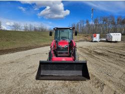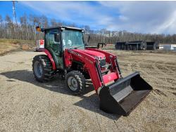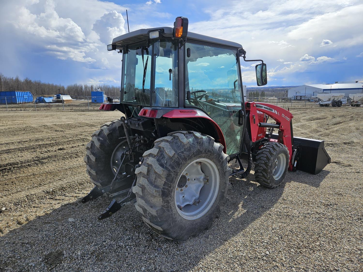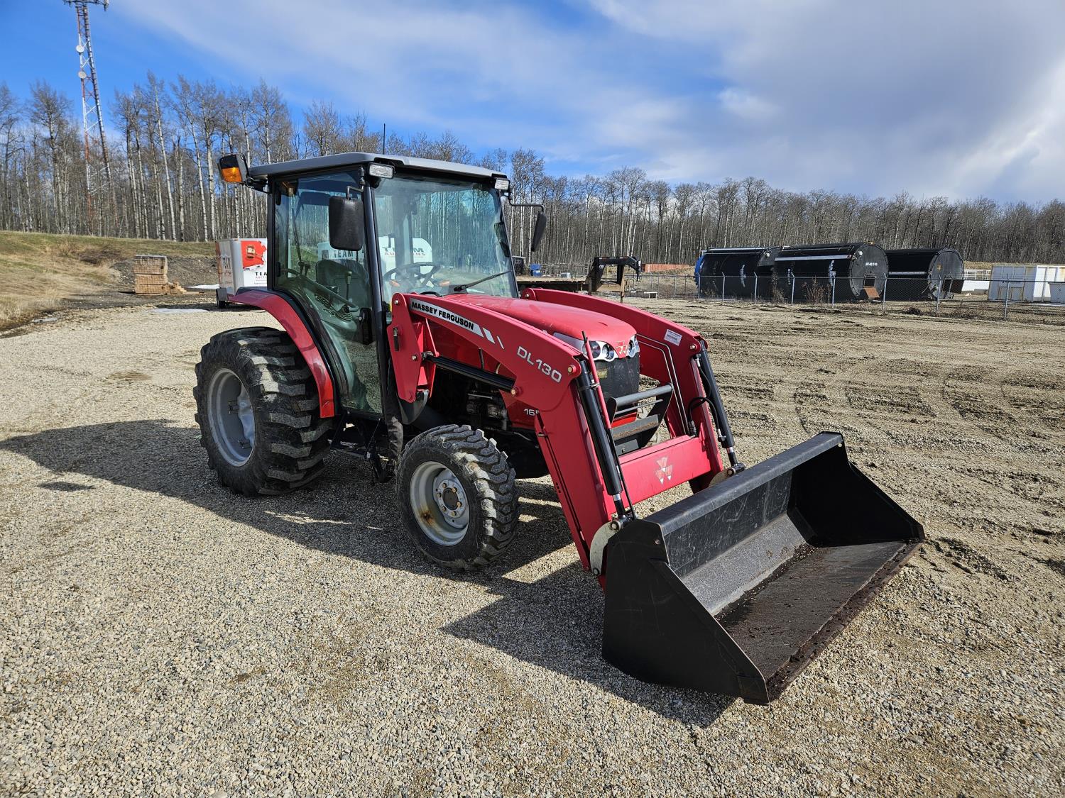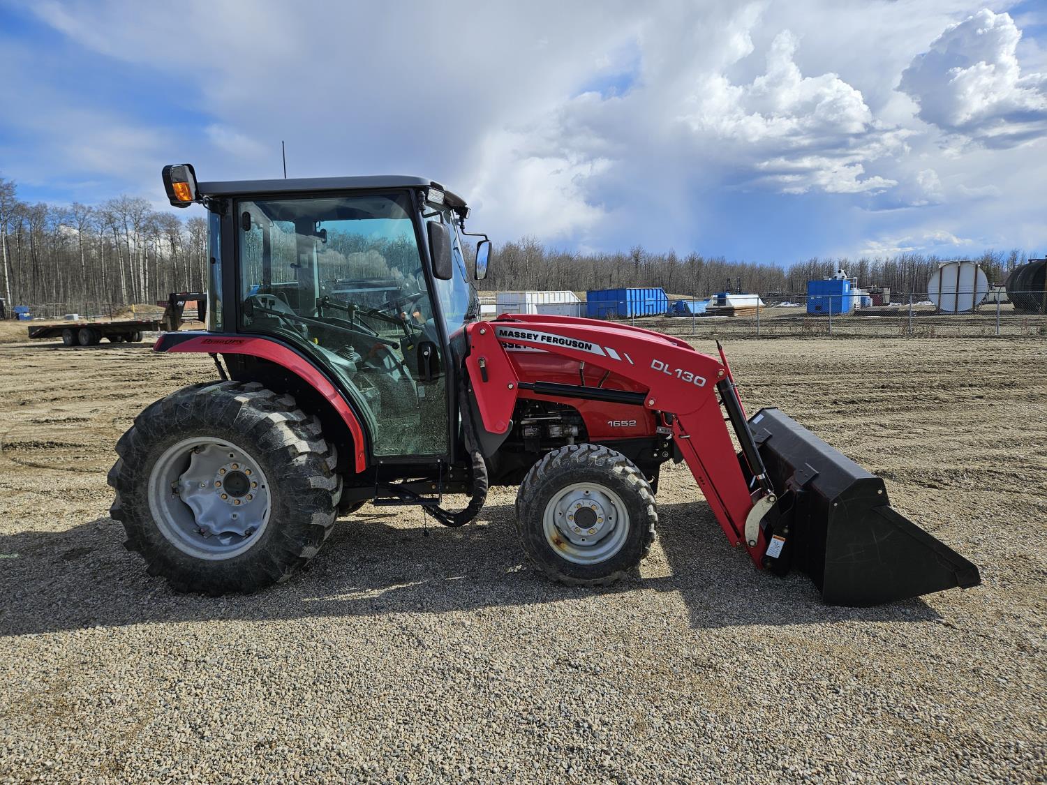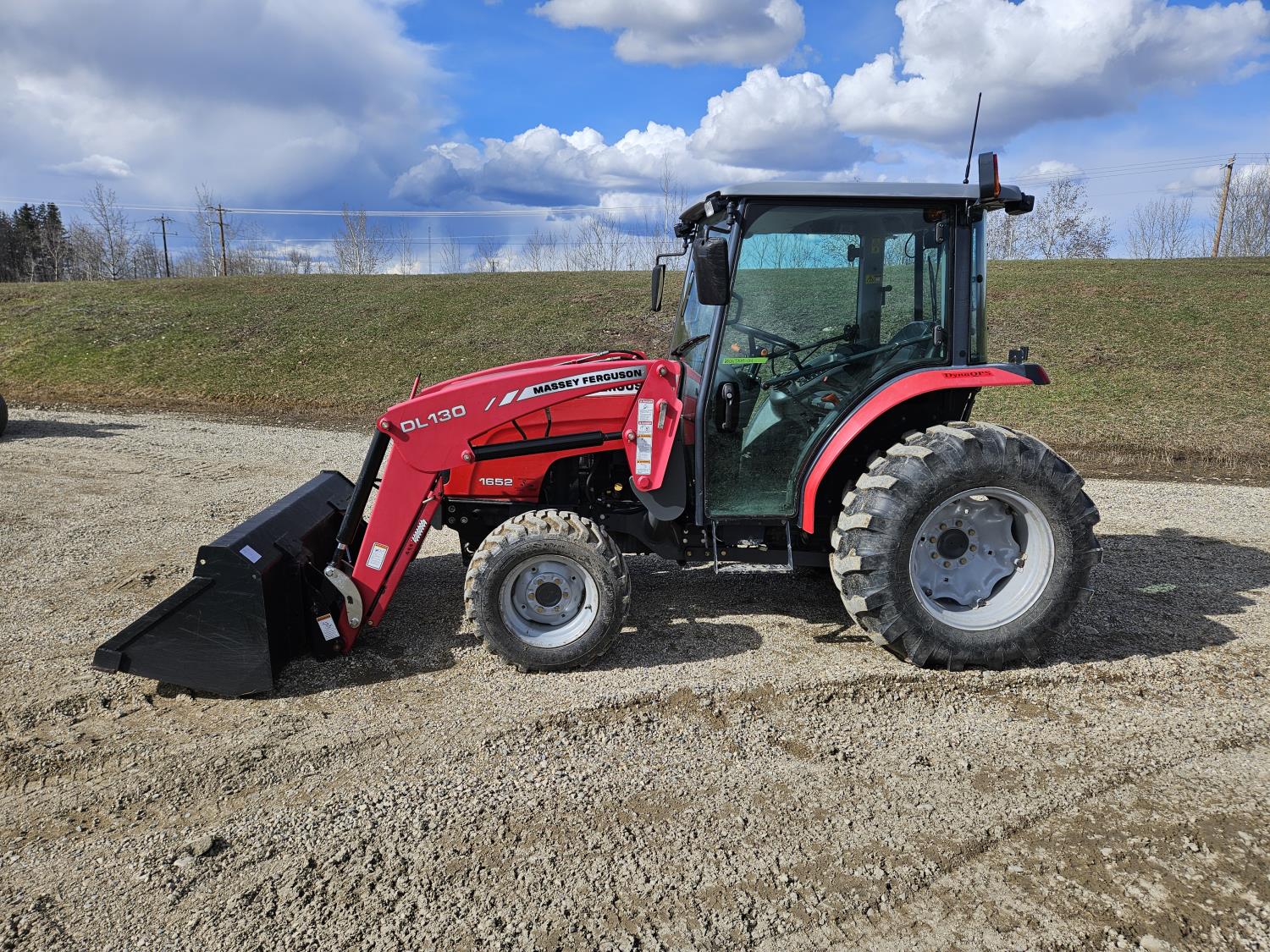Massey Ferguson DL130 loader, Q/A, 72 inch bucket, Iseki 3.0 L 4 cylinder 52 HP, diesel engine, 12 speed hydro 3 range transmission, cab, shuttle shift, joystick, A/C, radio, 540 PTO, 3 point hitch, 2 rear hydraulic outlets, 10-16.5 front tires, 17.5L-24 rear tires, c/w 7ft MF 1550 belly mount blade