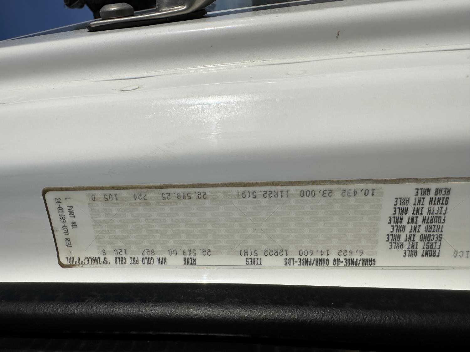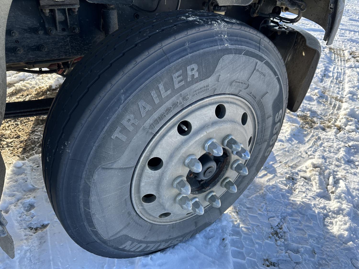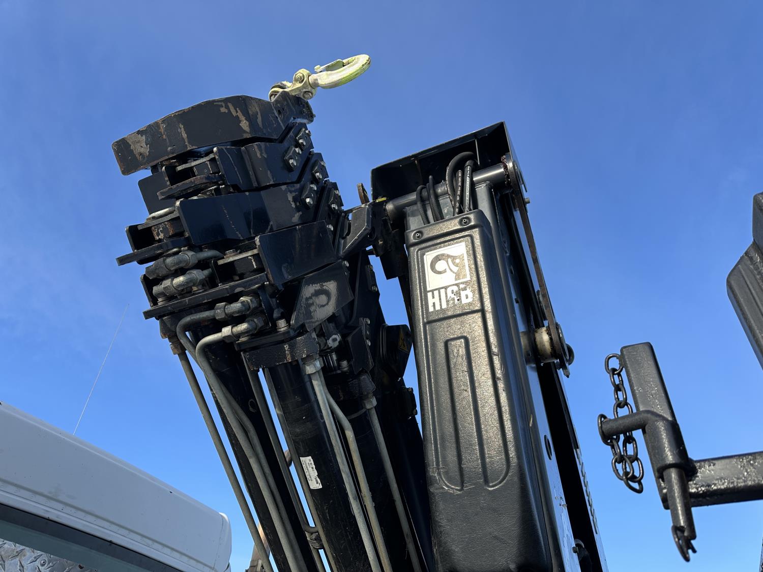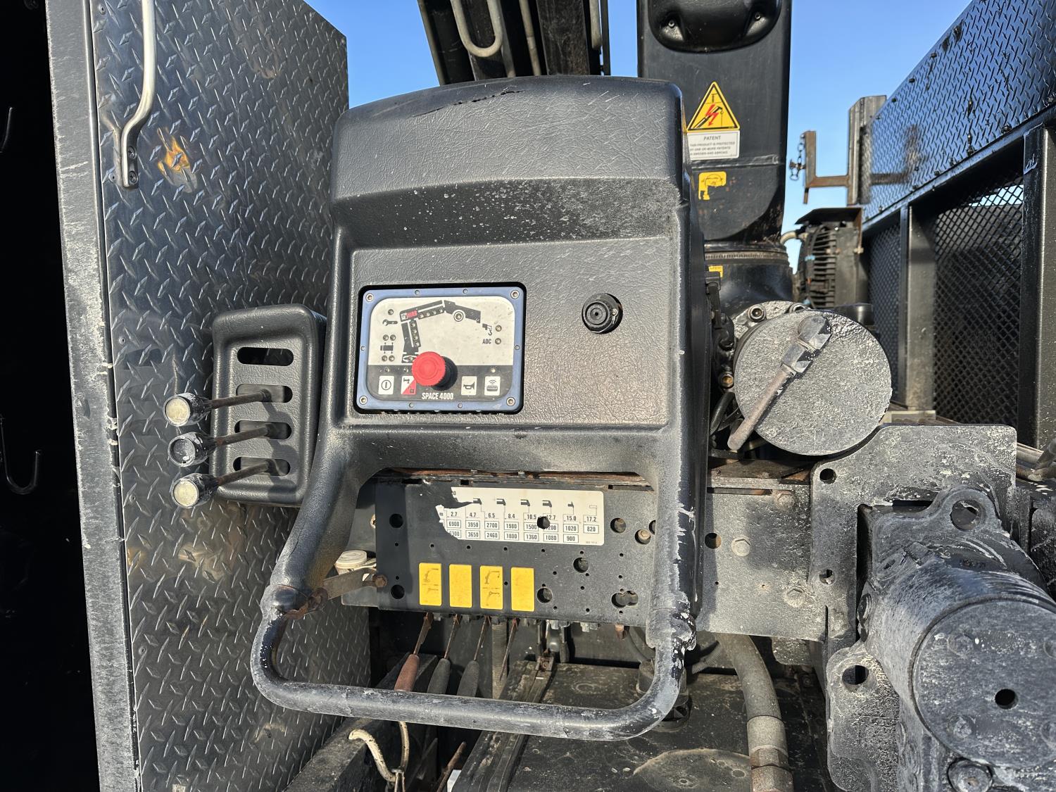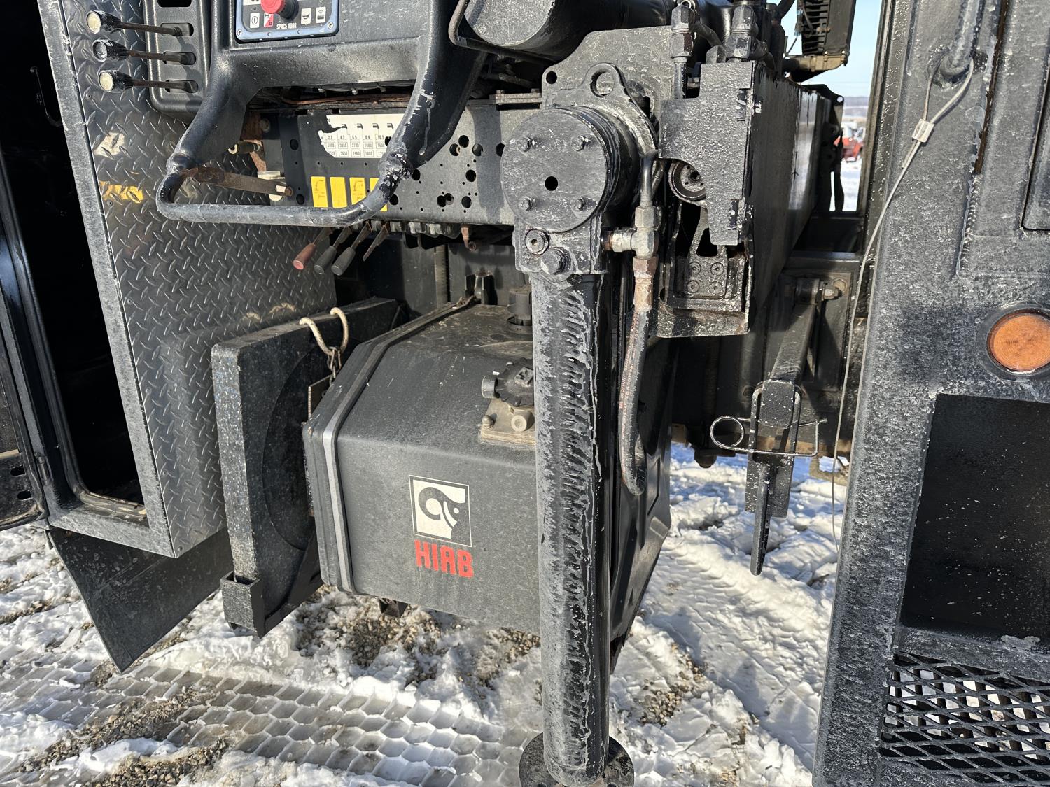 Cummins ISC8.3 350 8.3 L 6 cylinder 350 HP engine, DEF deleted, engine brake, positive air shutoff, Allison automatic transmission, has remote, A/C, cruise control, air ride driver seat, Hiab hydraulic wet kit, steel tool boxes, 8 ft x 9 ft 9 inch deck, air ride cab, saddle boxes, chain holders, Hiab 211 E P-5 6 section 50 ft knuckle rear mount crane, outriggers, air ride suspension, 14,600 lb front axle, 23,000 lb rear axles, diff lock, 253 inch WB, all aluminum wheels, 11R22.5 tires