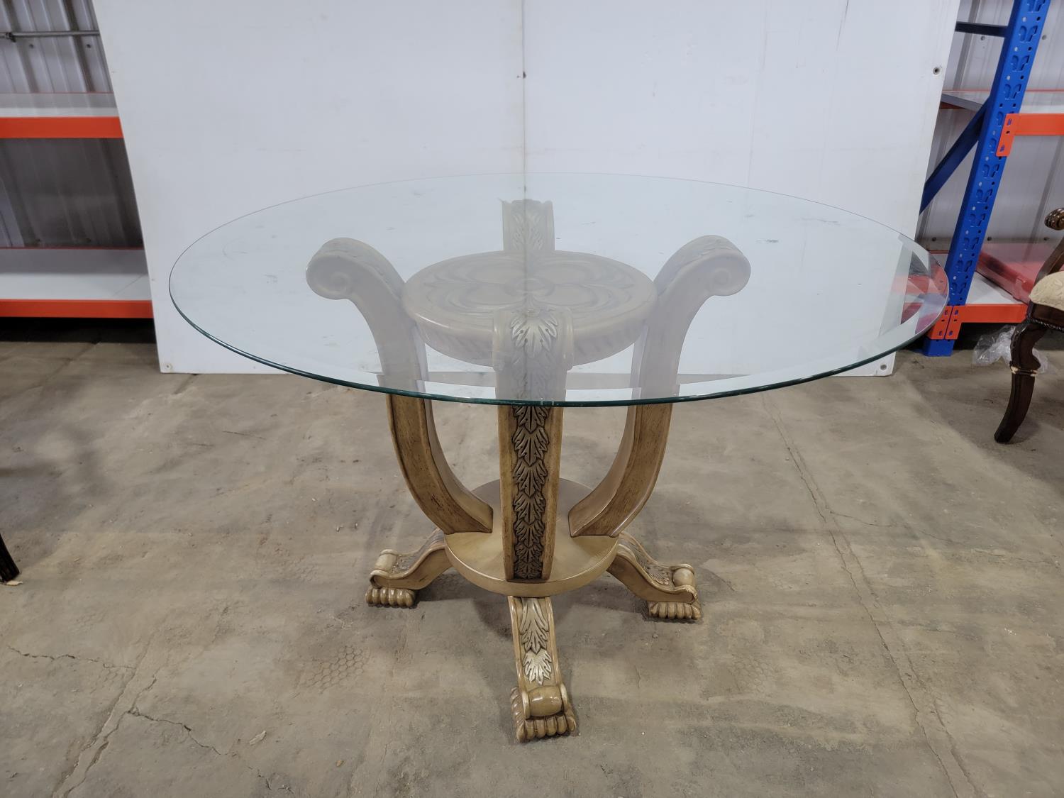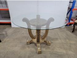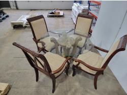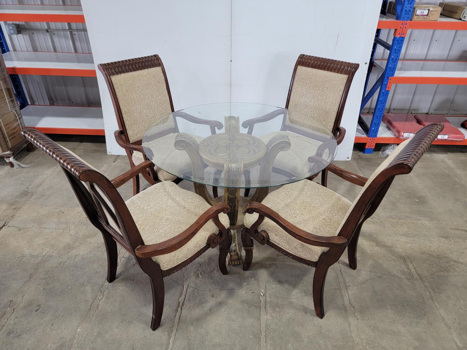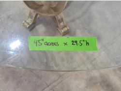 round glass top table 45 inch across 28-1/2 inch h, and (4) chairs