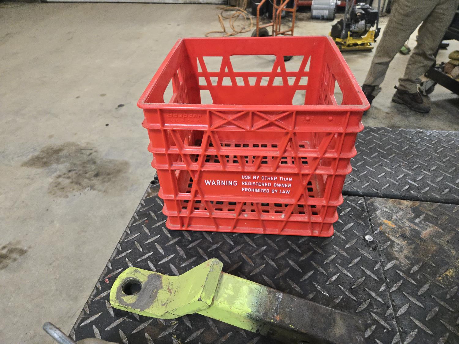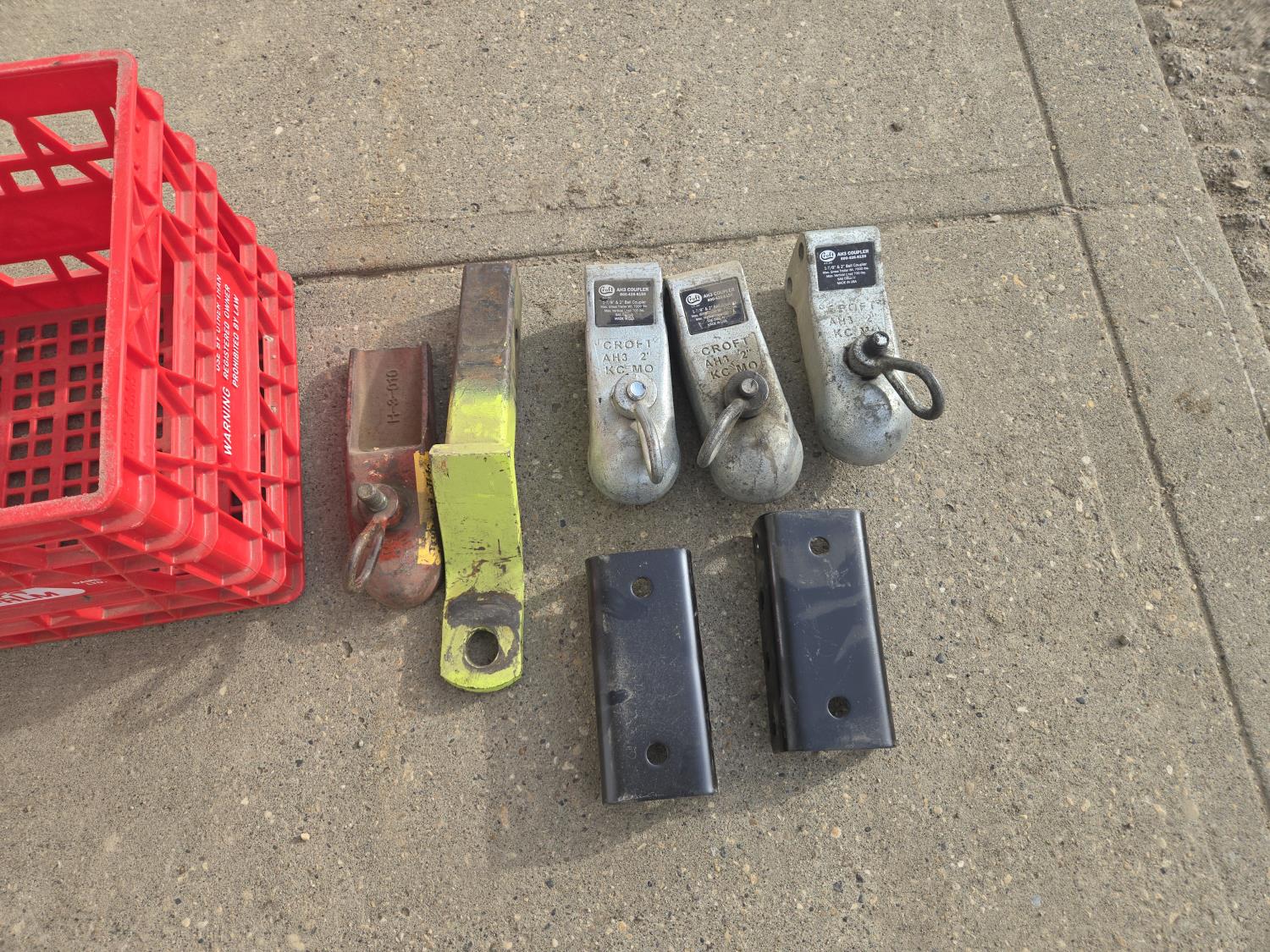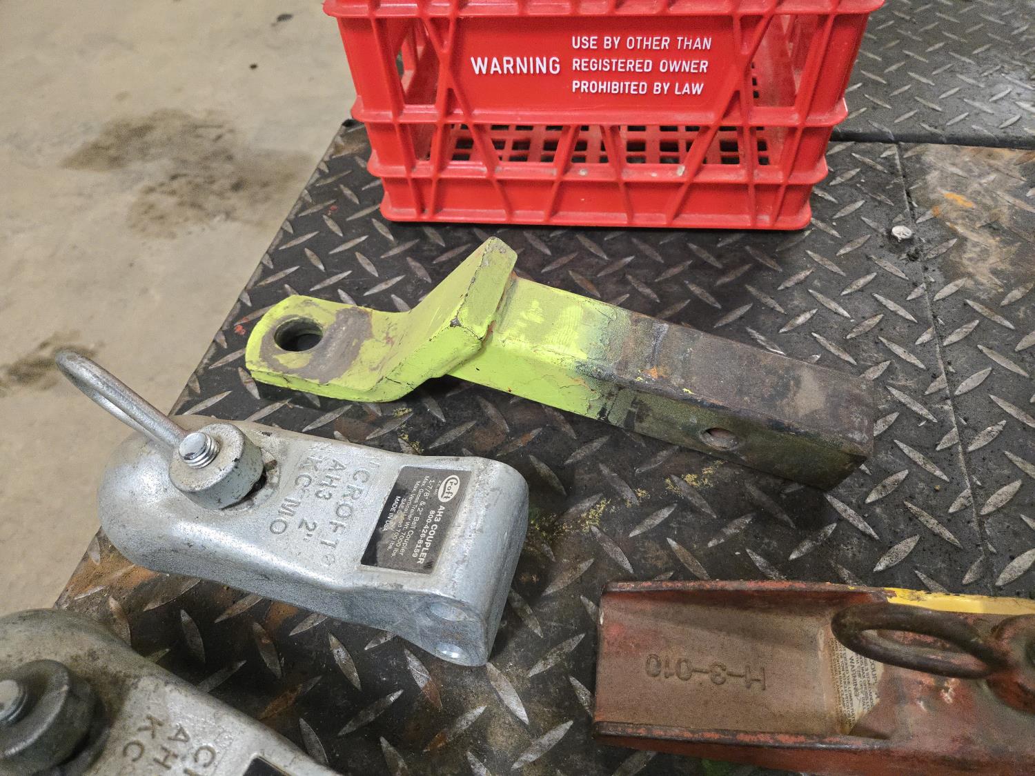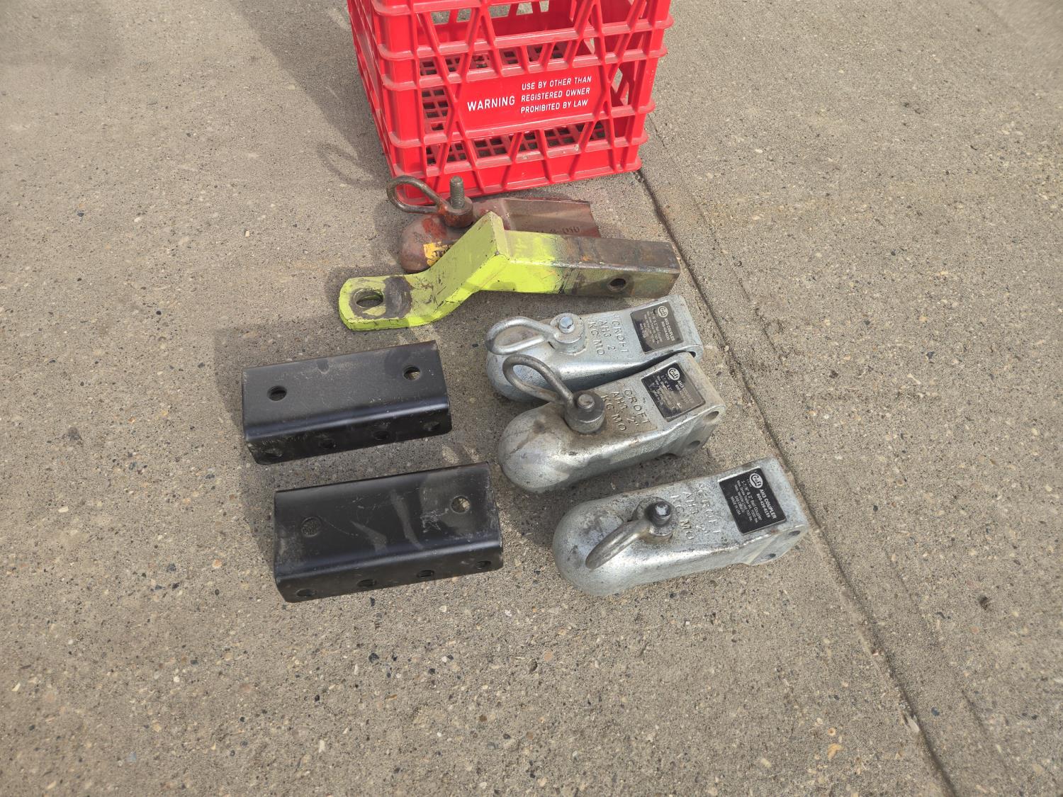 (4) 2 inch trailer hitches, (1) 2 inch receiver hitch, poly tote