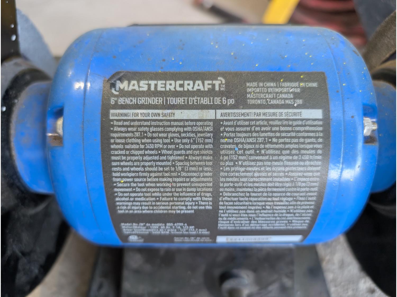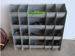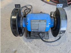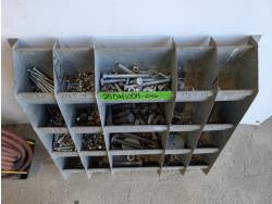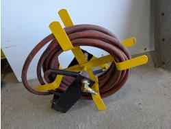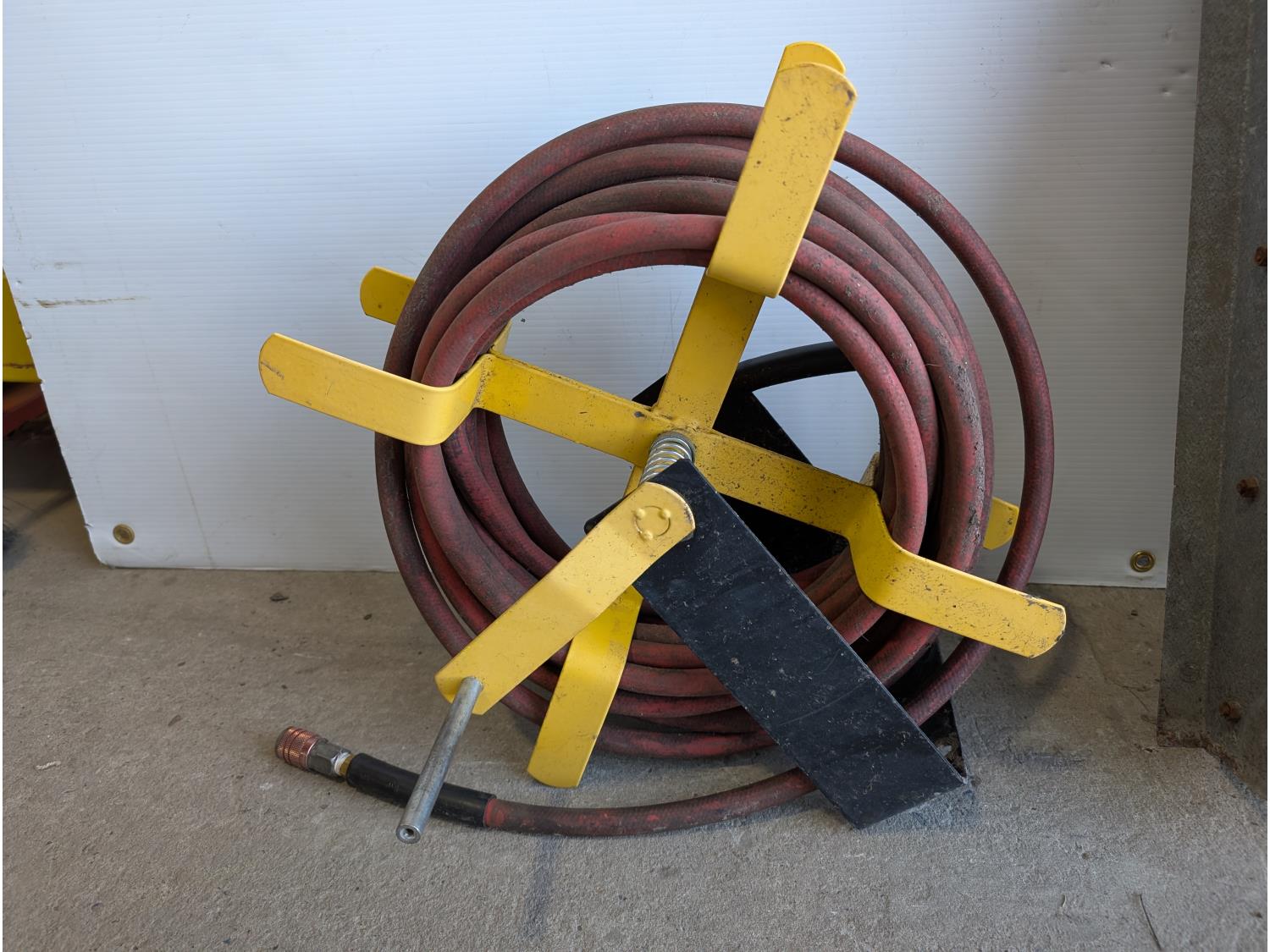 Bolt bin with contents, air hose with reel, Mastercraft 6 inch bench grinder
