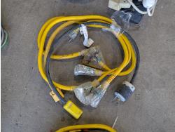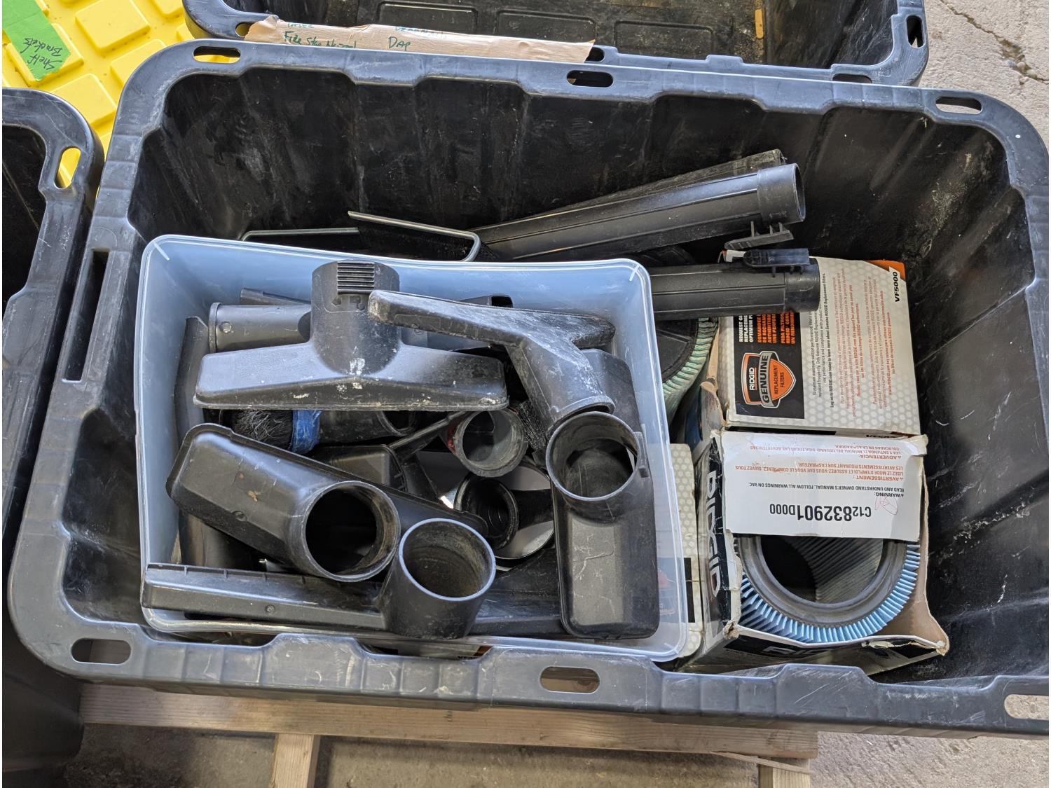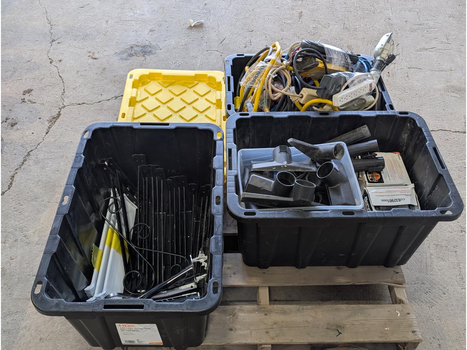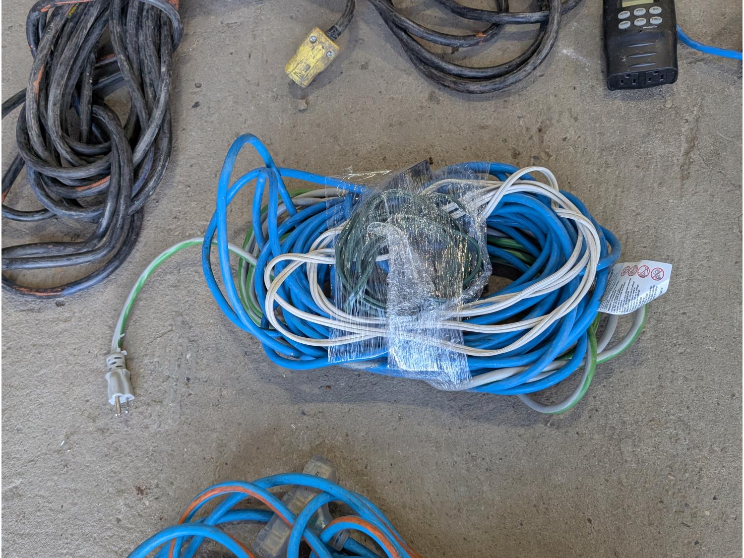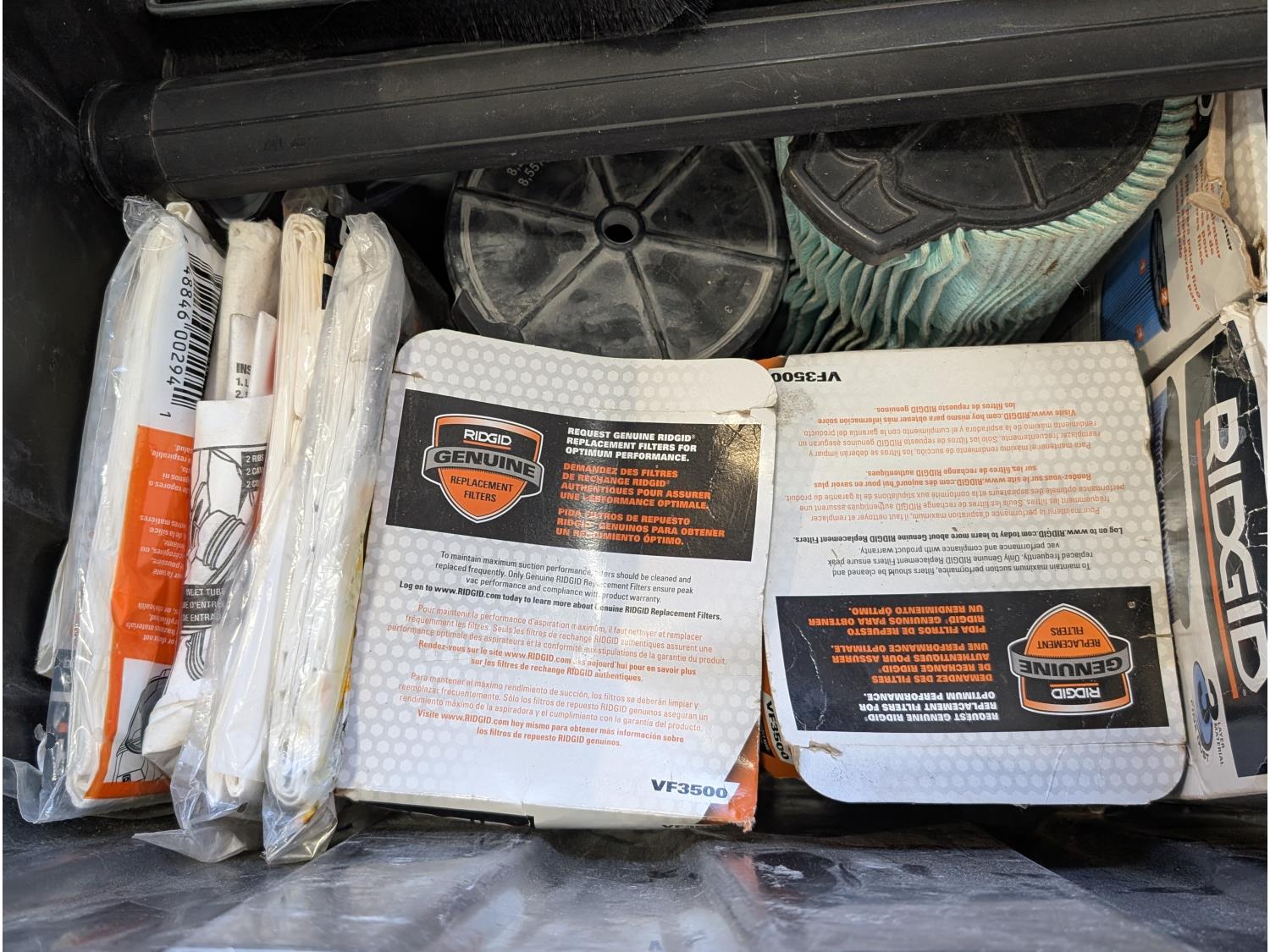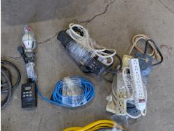 Shelf brackets, Ridgid vacuum air filters and filters, power bars, extension cords, adapter cords, (3) bins
