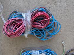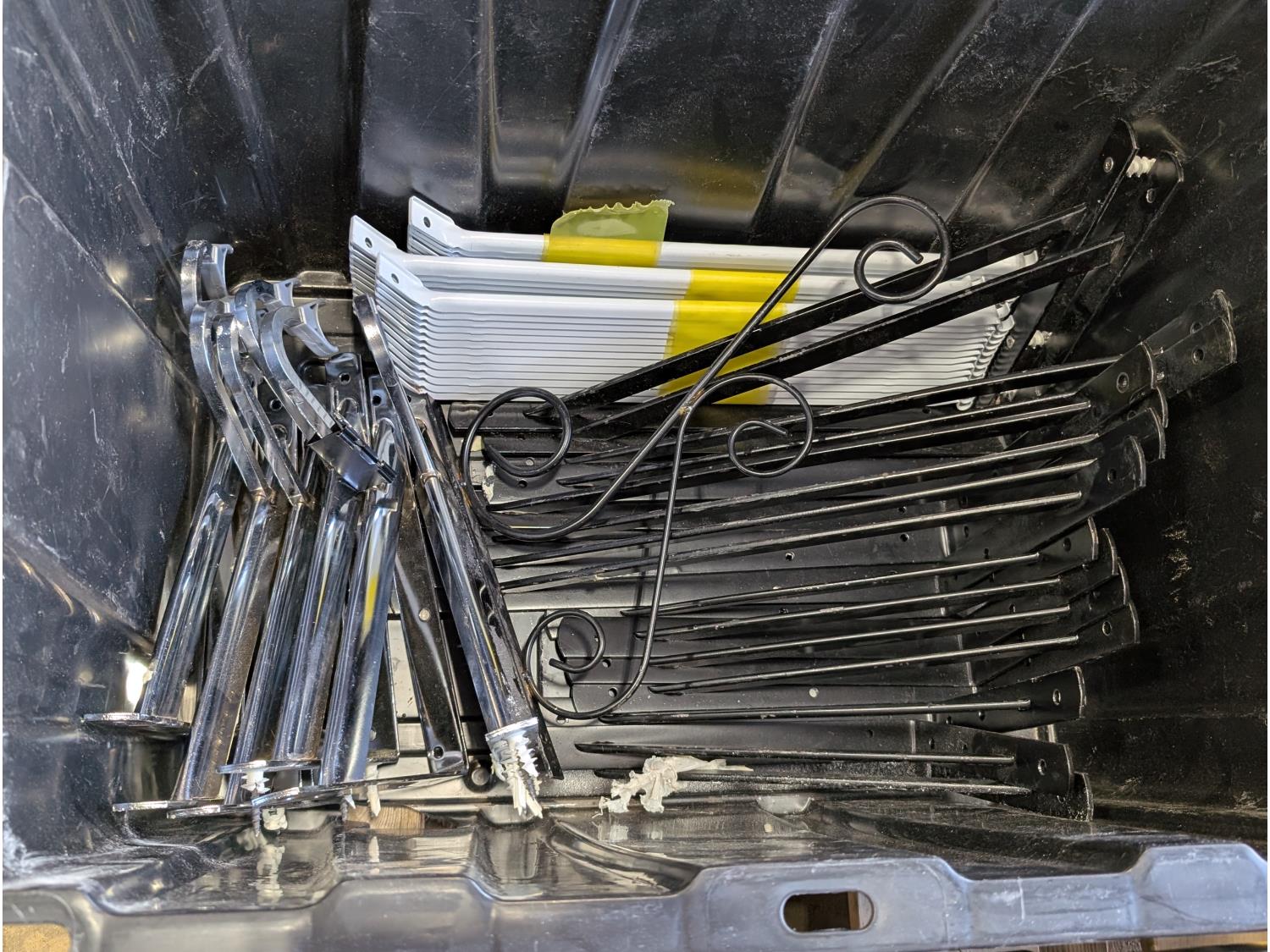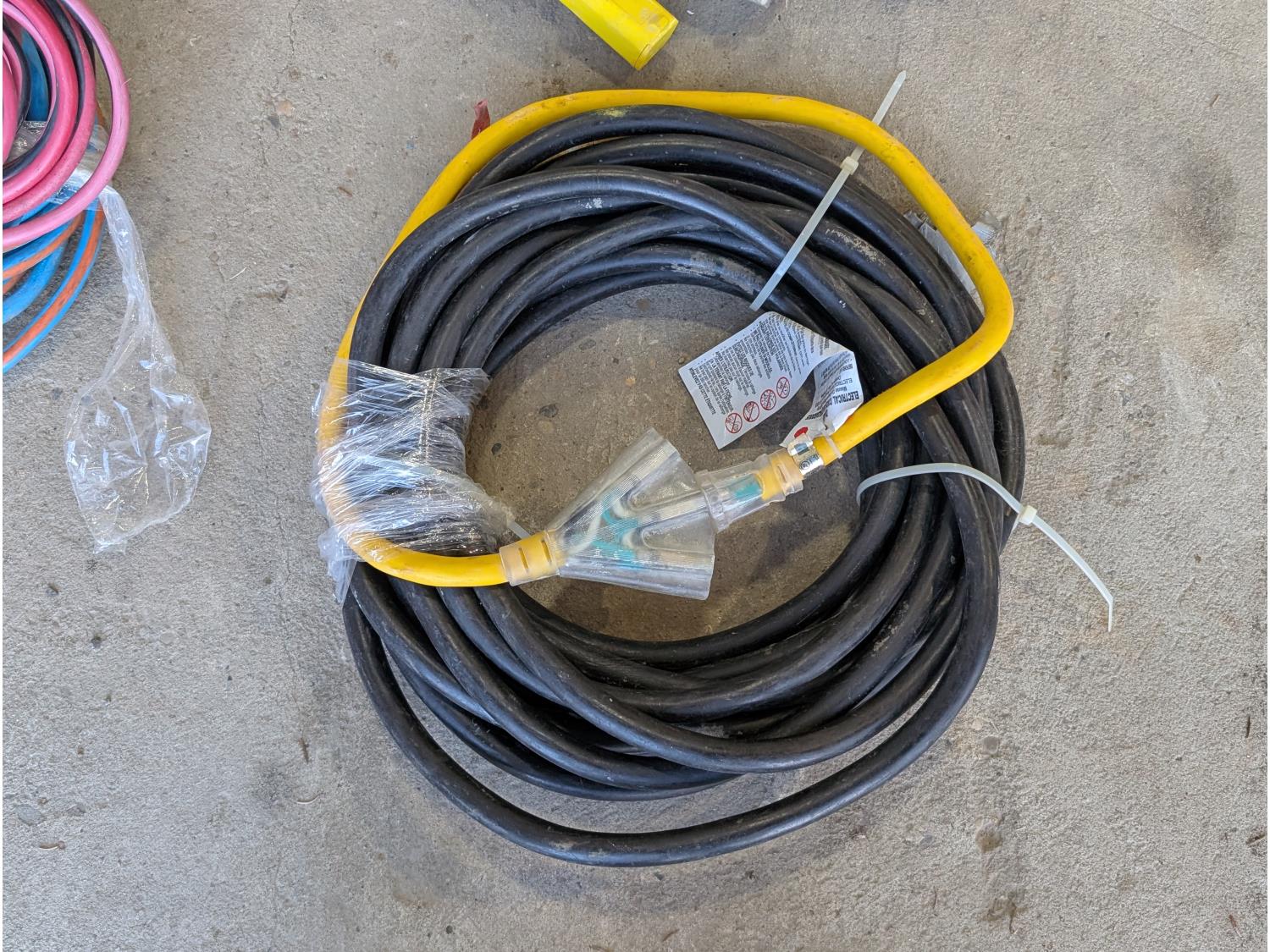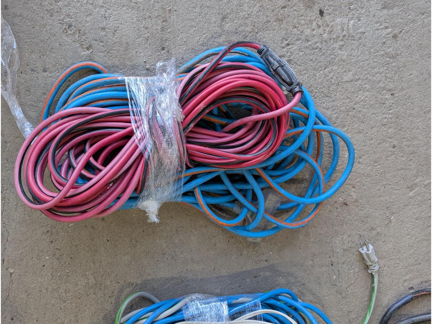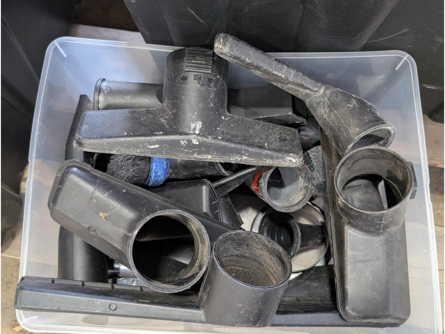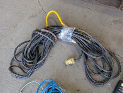 Shelf brackets, Ridgid vacuum air filters and filters, power bars, extension cords, adapter cords, (3) bins