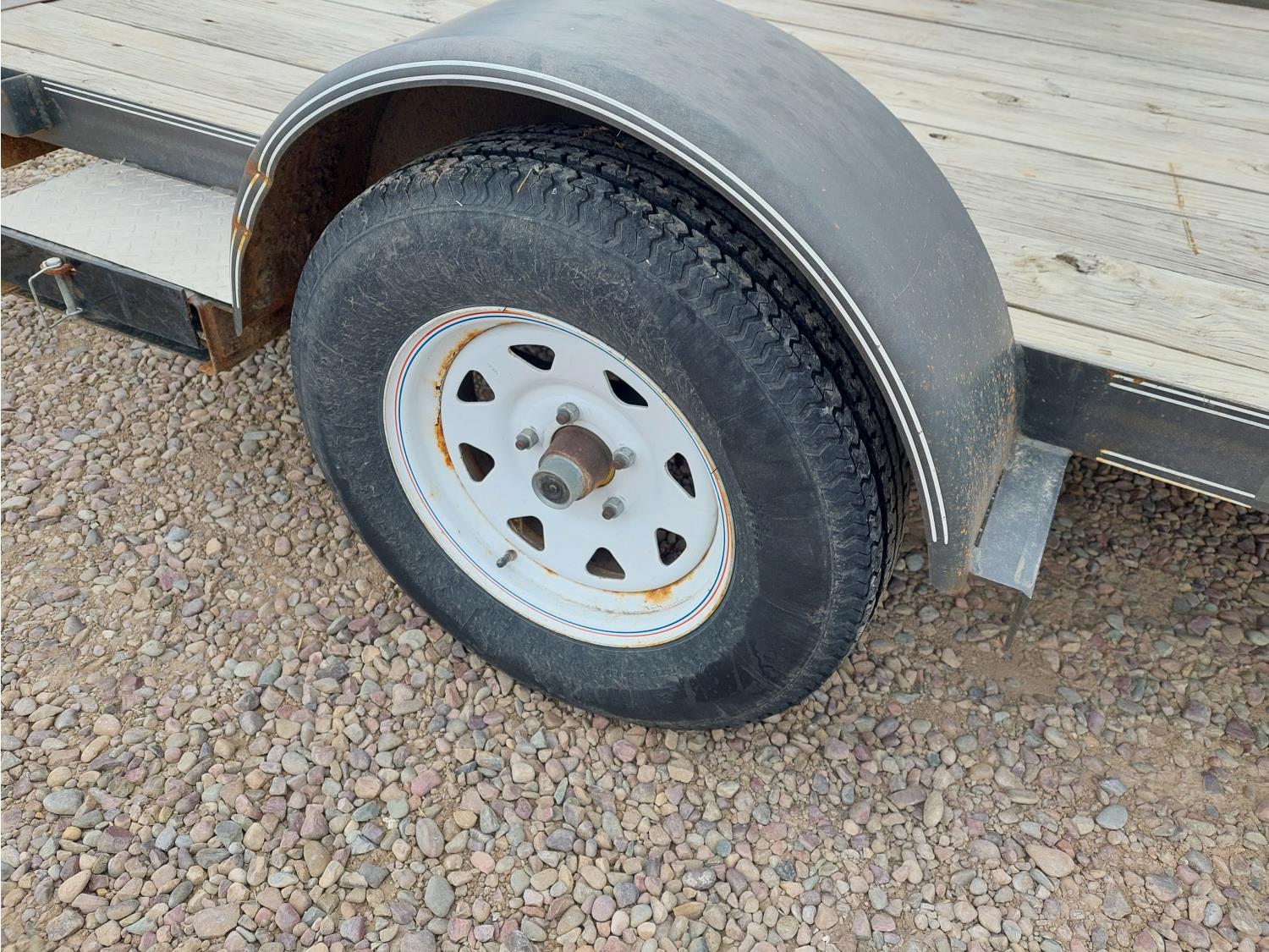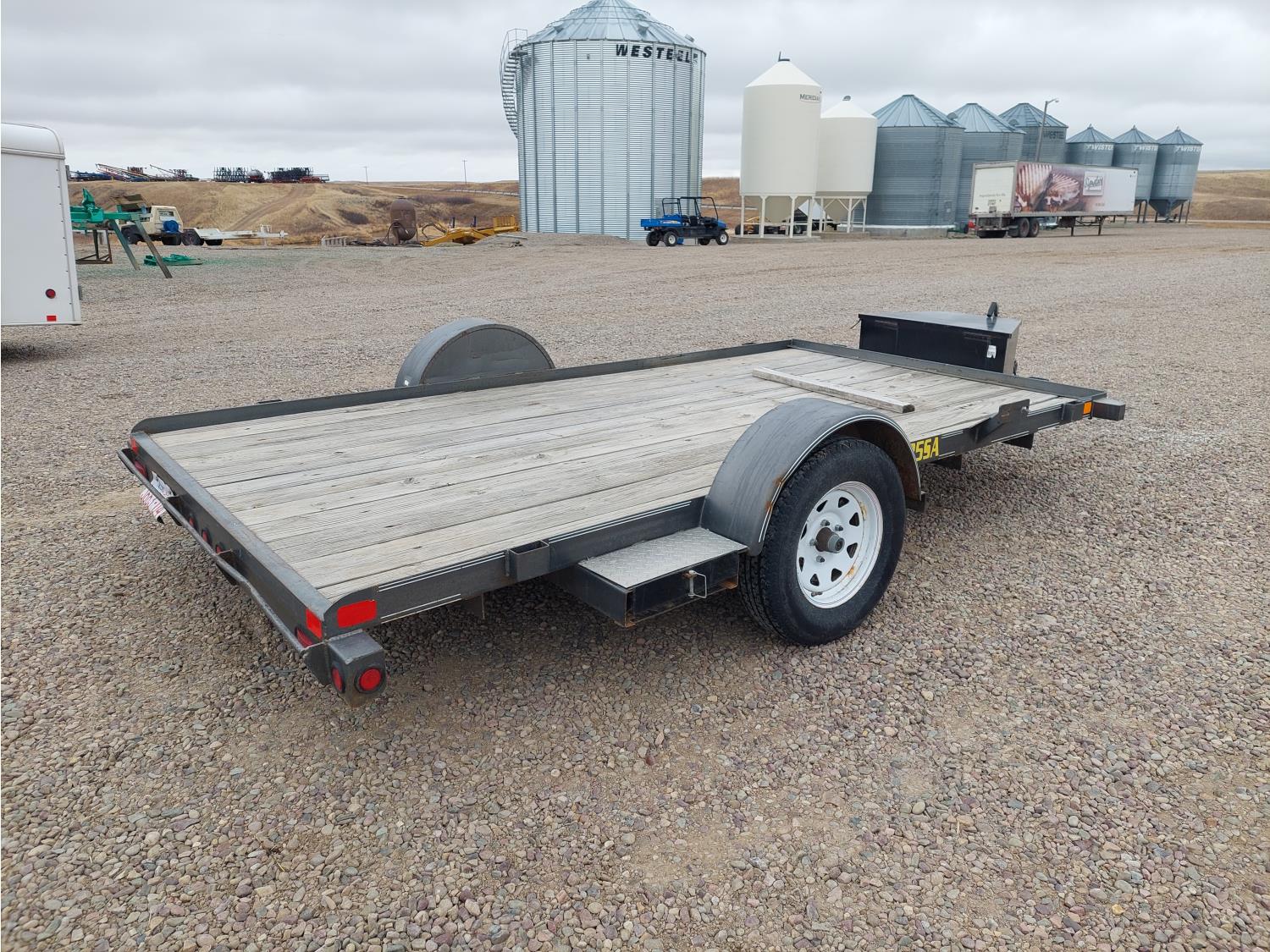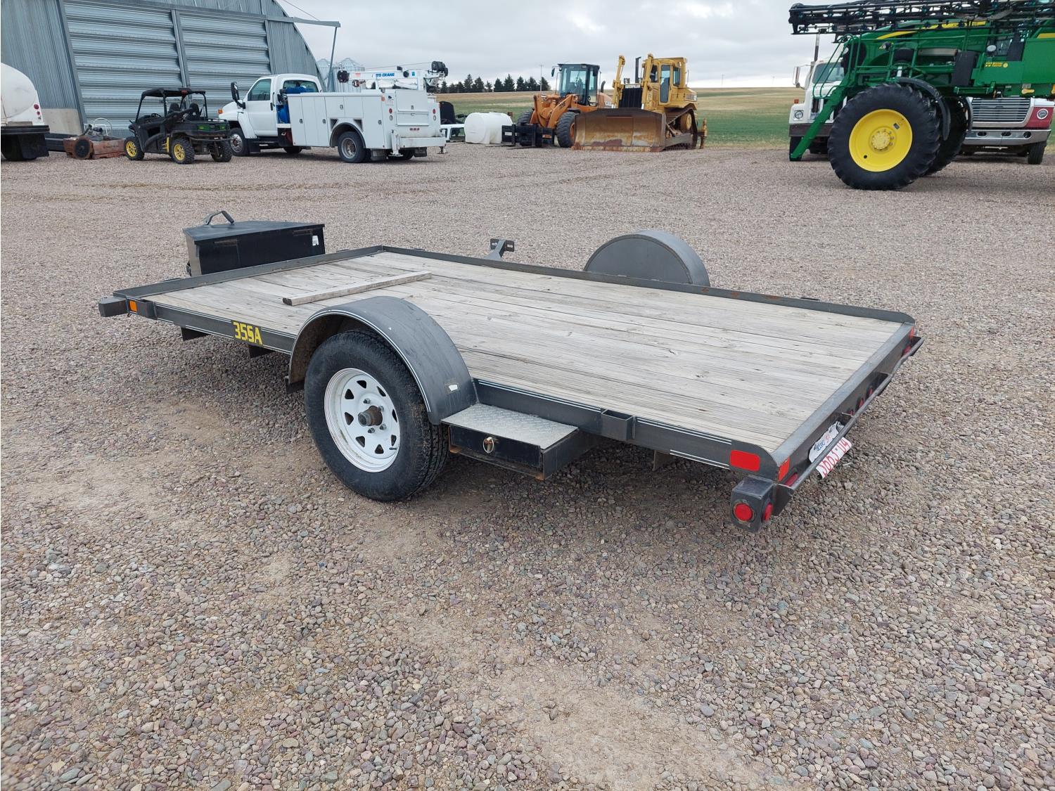 77 inch wide deck, slide in ramps, spring suspension, ball hitch, tool / storage box, 3000 lb axles, 205/75R15 tires