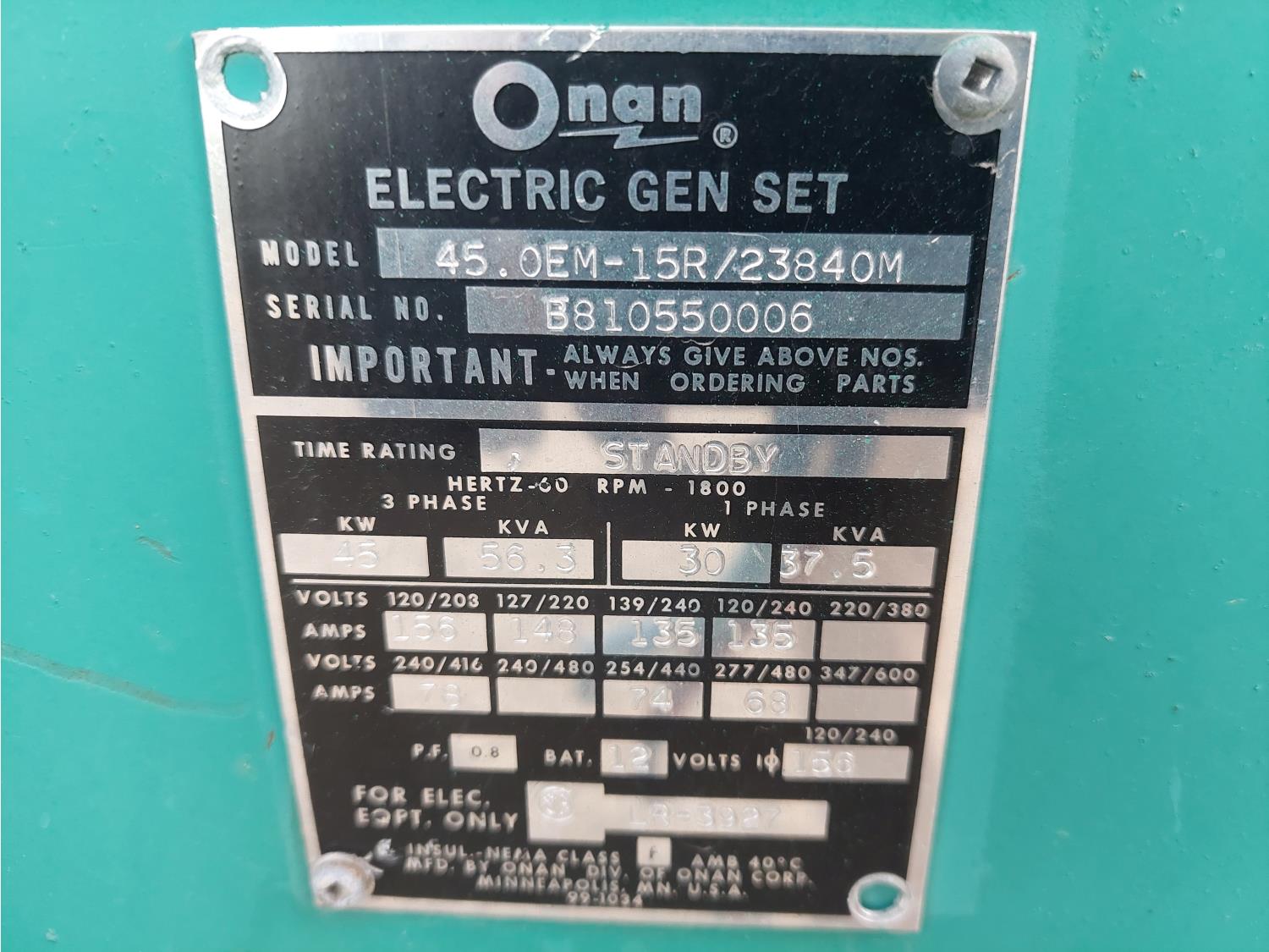 113 Onan 45.OEM-15R/23840M 45 Kw Gas Generator