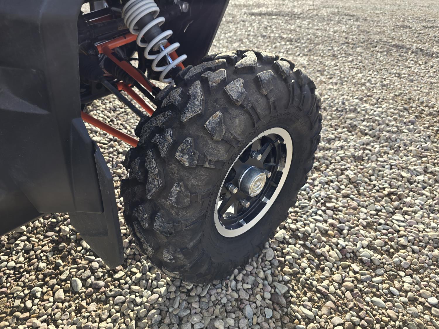 900 cc fuel injected engine, automatic transmission, Hi/Lo range, reverse, open canopy, front locking differential, 26X9.00R12 front tires, 26X11.00R12 rear tires