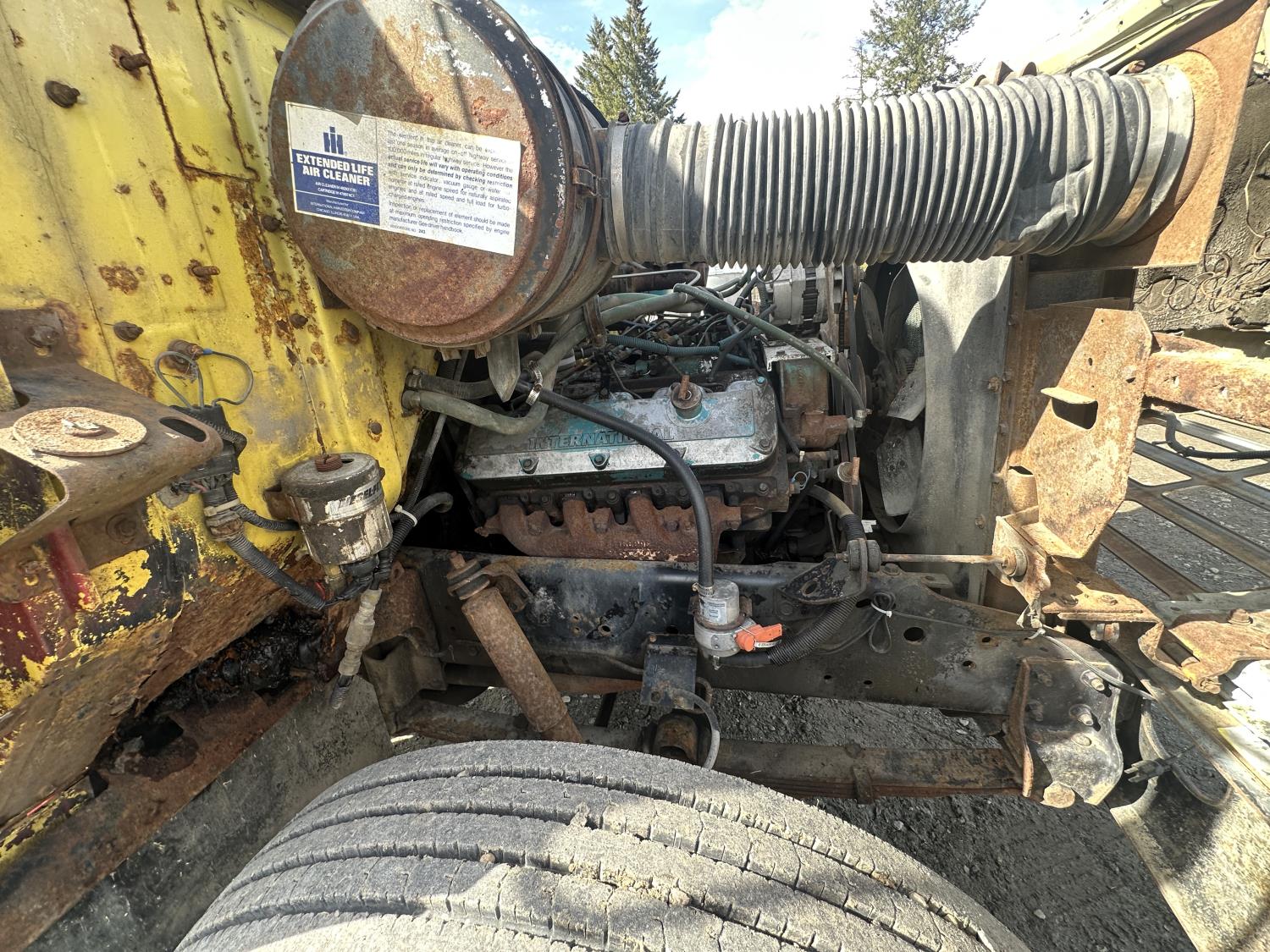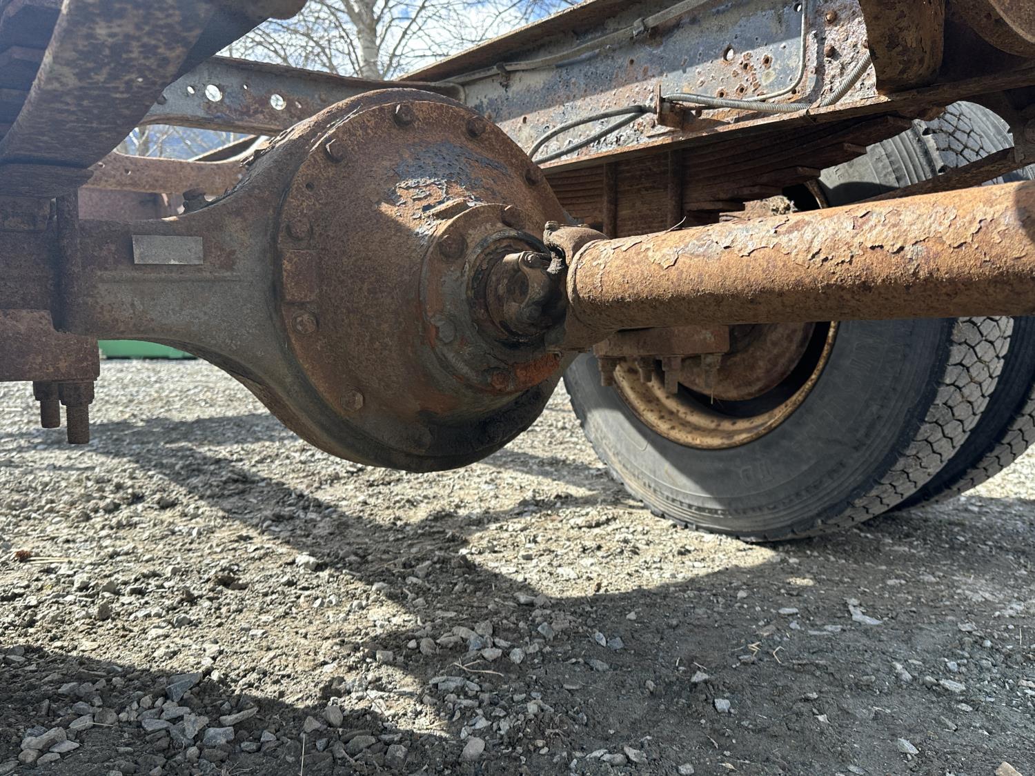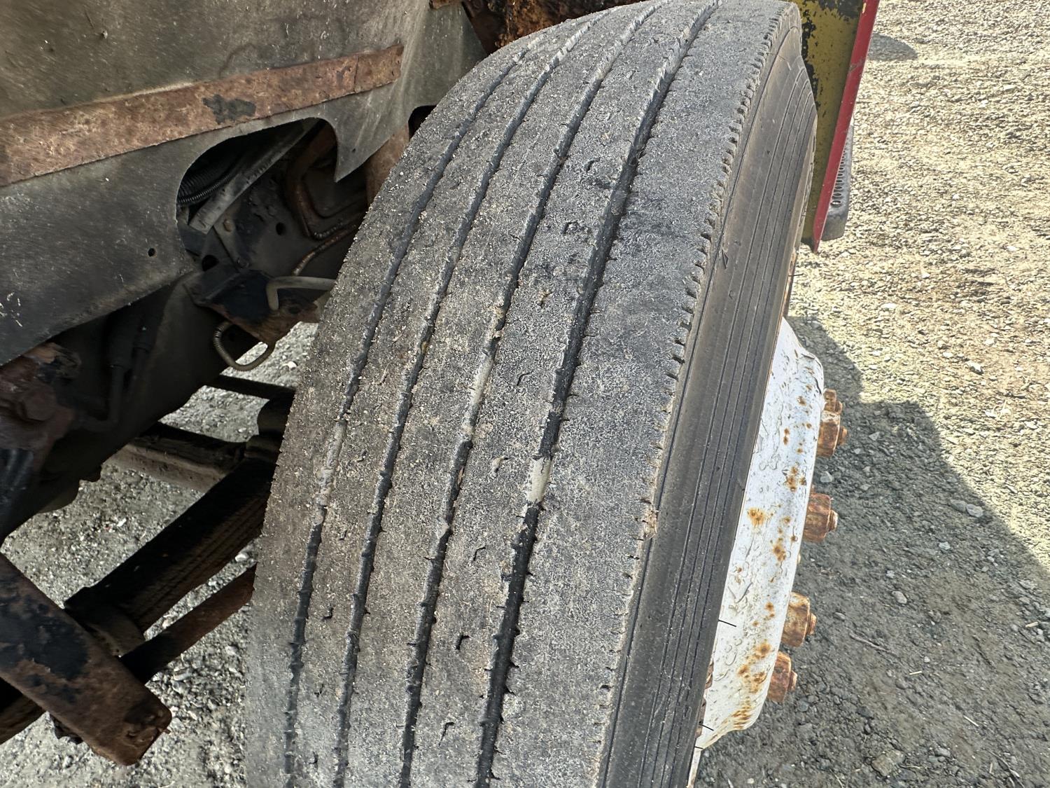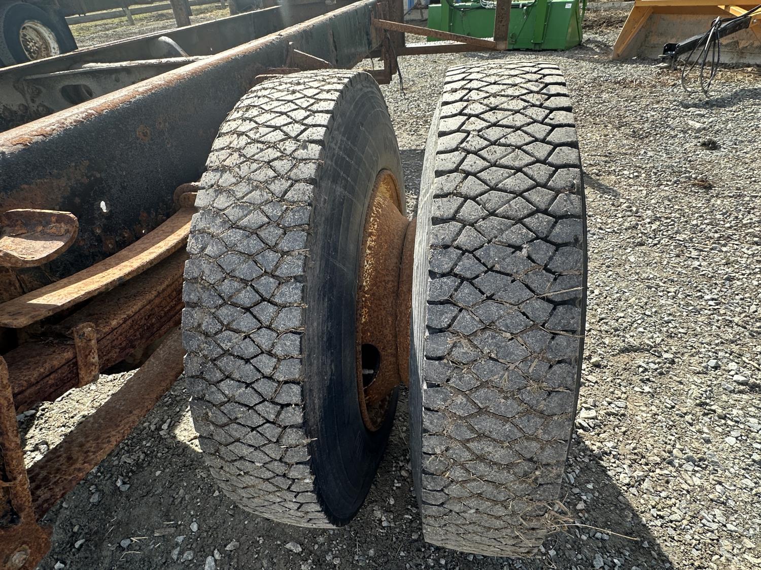 International 9.0 L V8 165 HP diesel engine, 5 speed manual transmission, spring suspension, 250 inch WB, 28ft Frame rail length from back of cab, 9R22.5 tires
