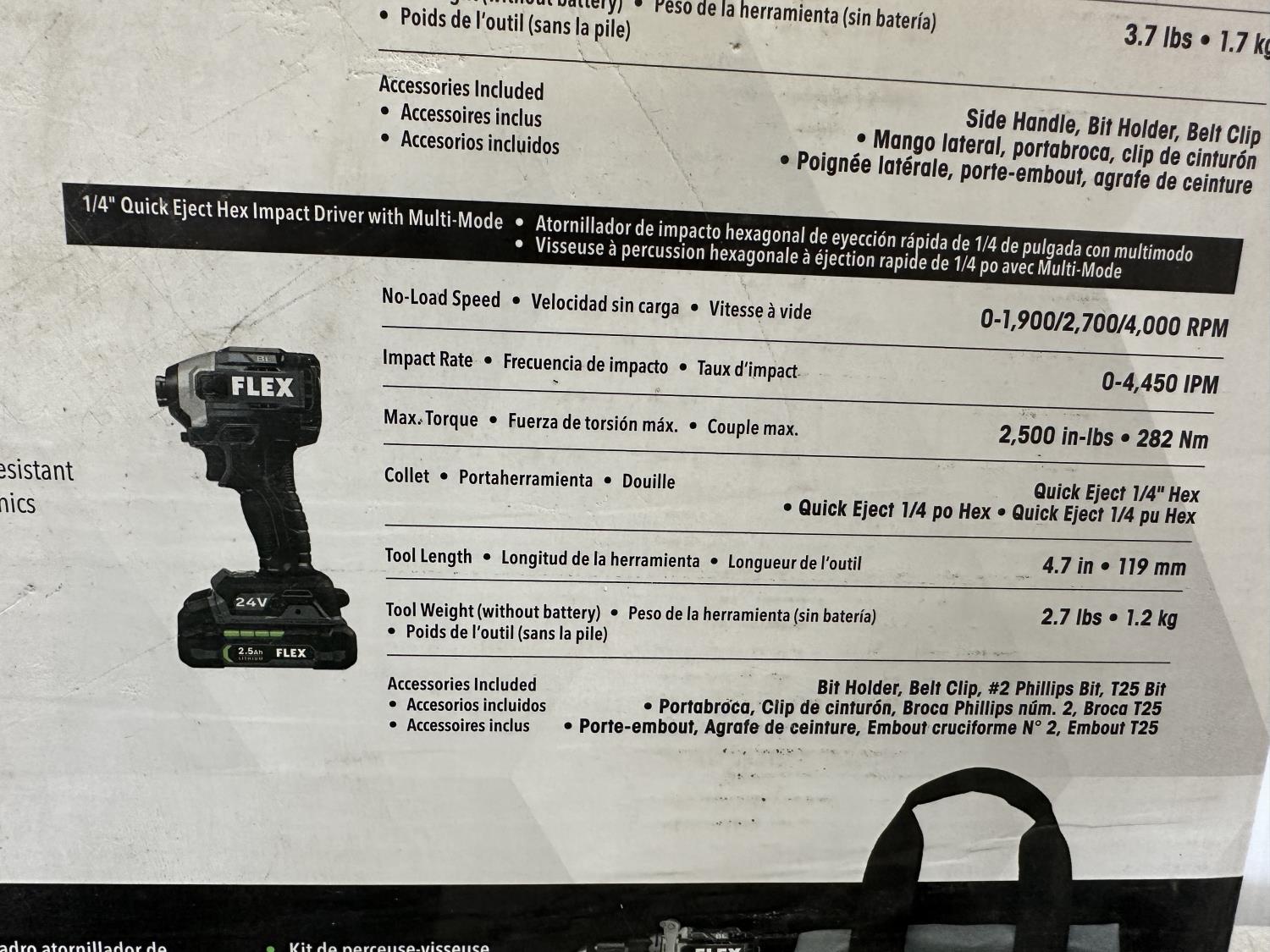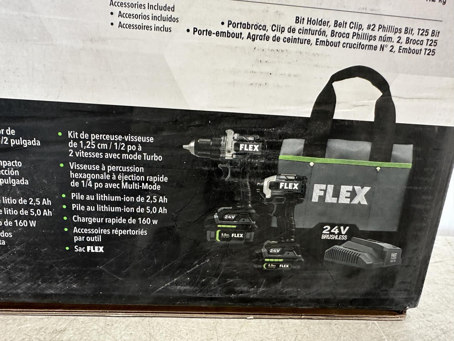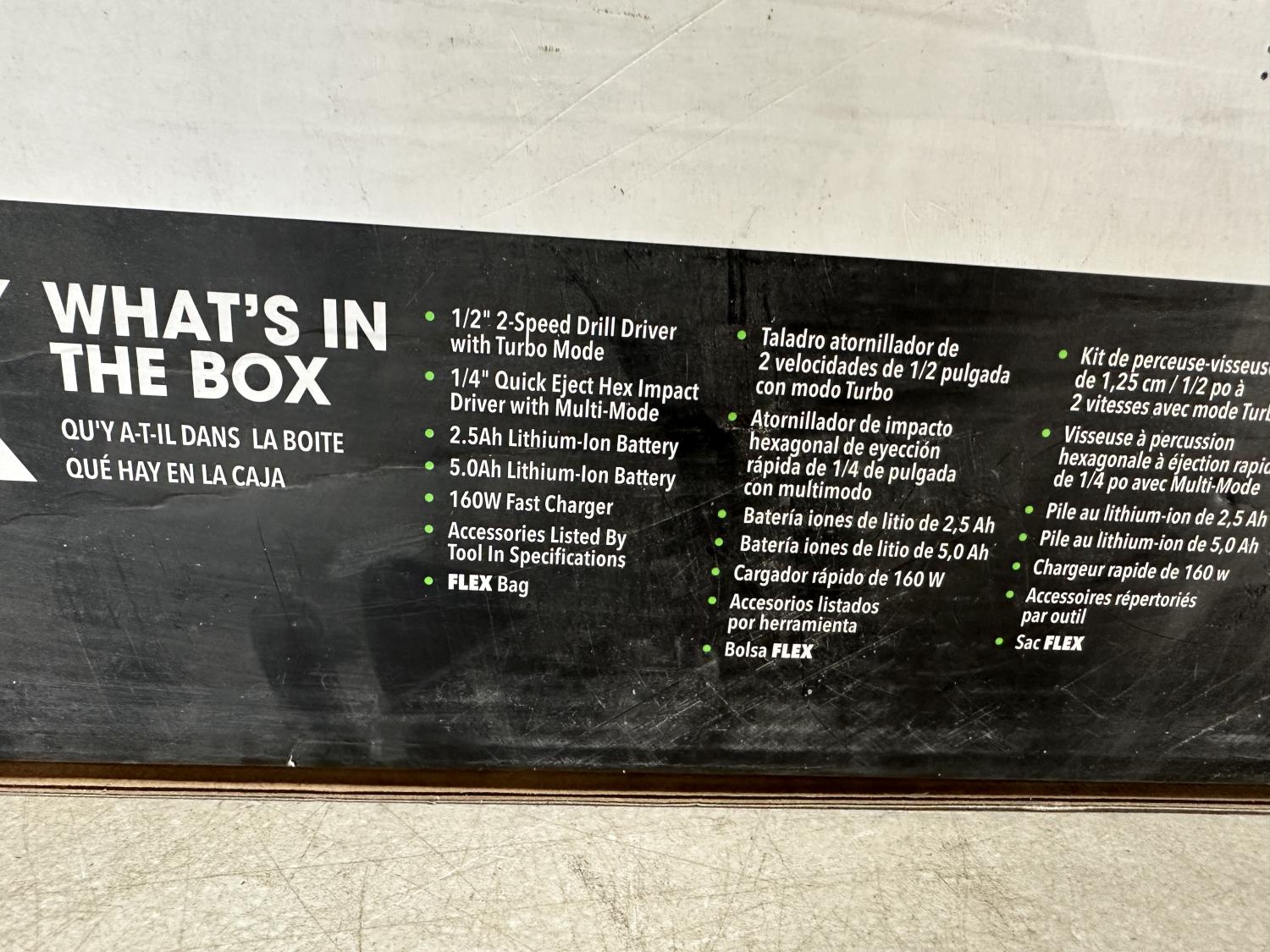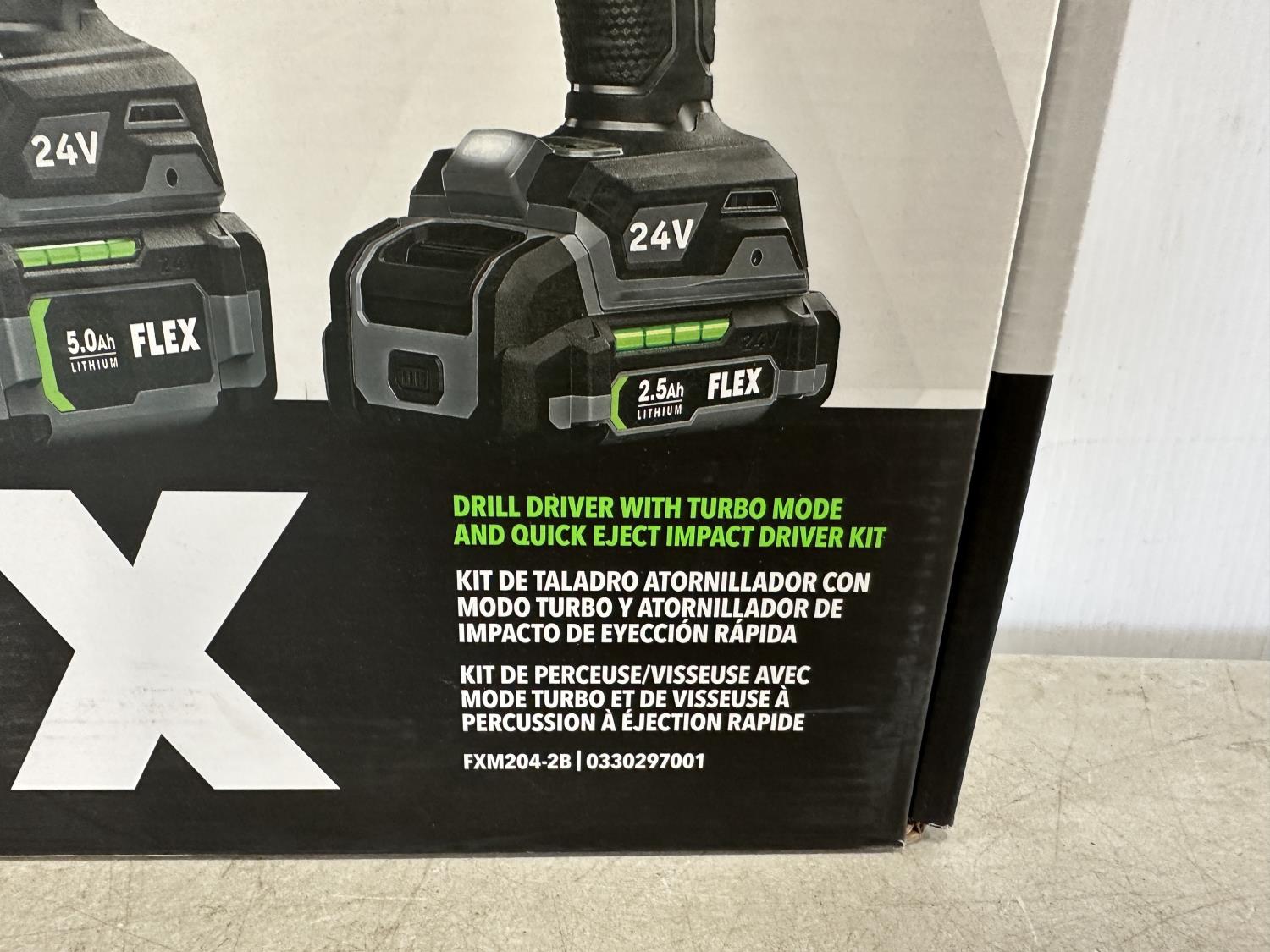 2-speed drill driver with turbo mode and quick eject hex impact driver with multi-mode, 2.5Ah and 5.0Ah lithium-ion batteries, 160W fast charger, FLEX bag and assorted accessories