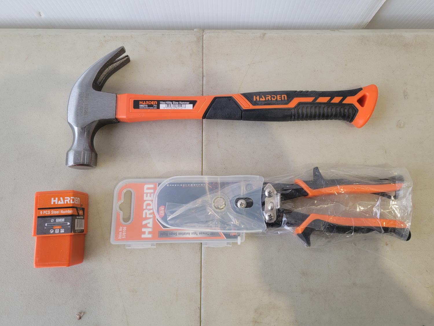1908 Harden 16 oz Claw Hammer, 9 Piece Steel Number Set and Aviation Snips (Unused)