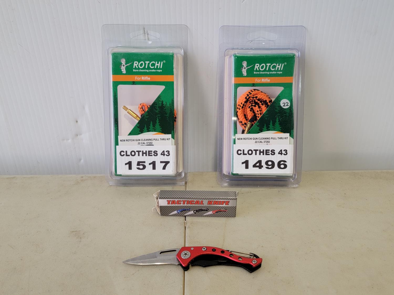 1725 (2) Rotchi .22Cal Pull Thru Gun Cleaning Kits, Mini Tactical Folding Knife (Unused)