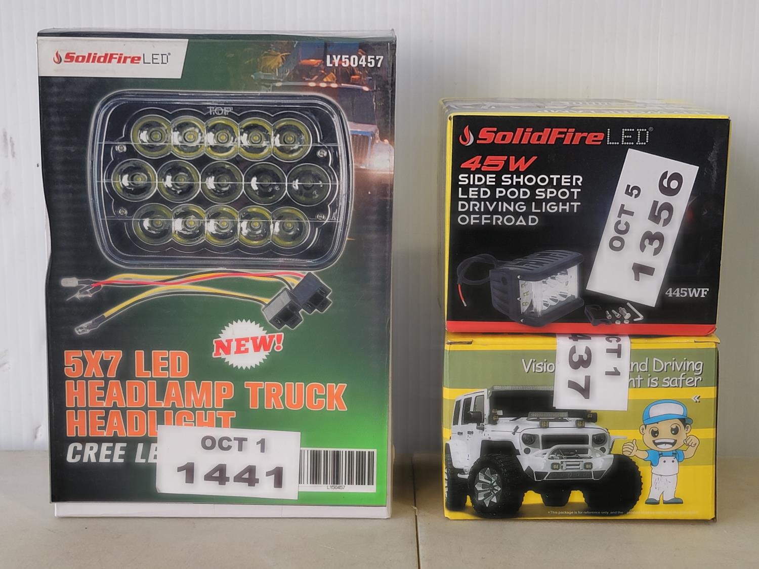 1922 Solidfire LED 5 X 7 LED Headlamp and (2) 45W LED Pod Lights (Unused)