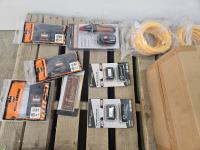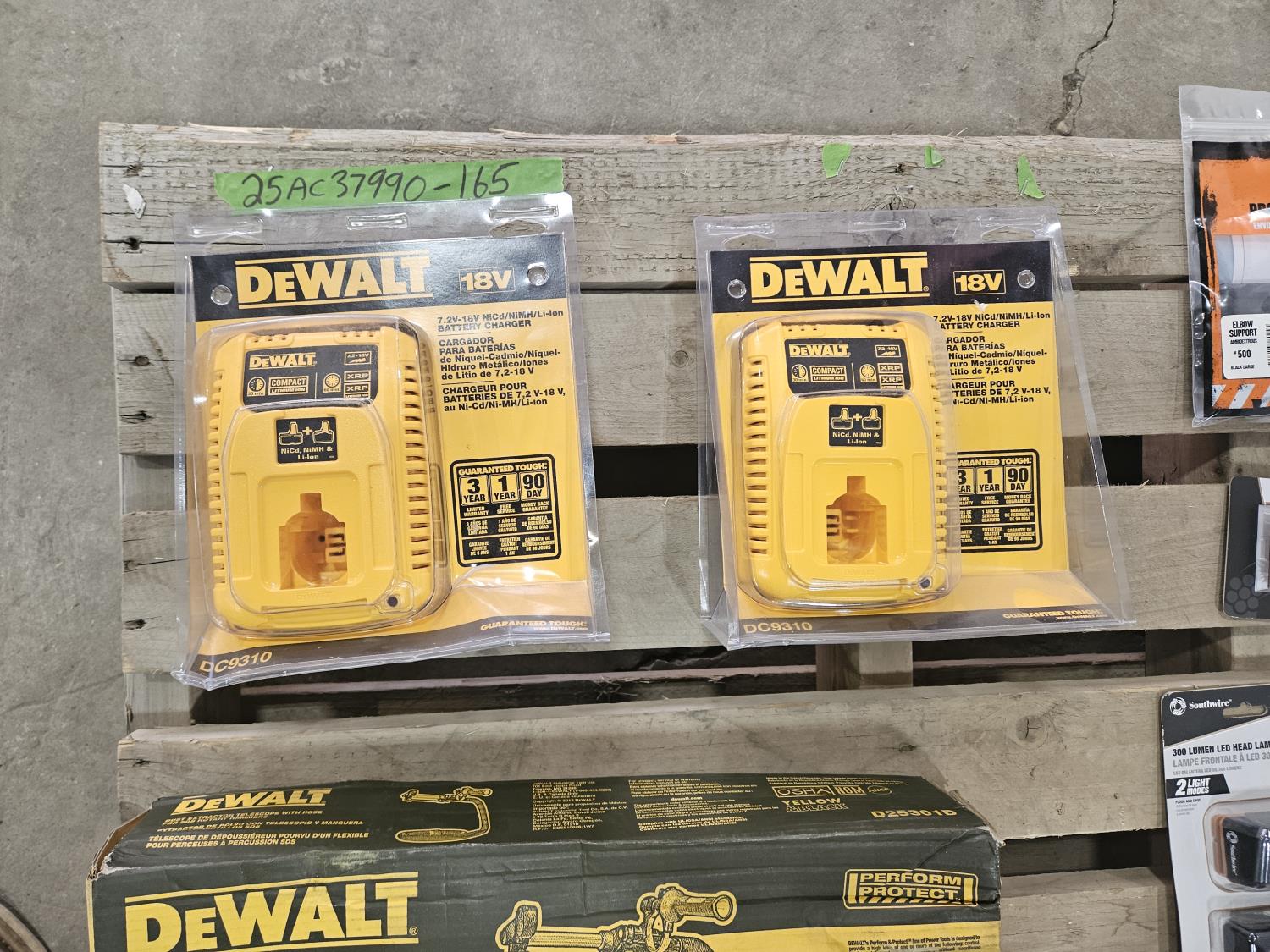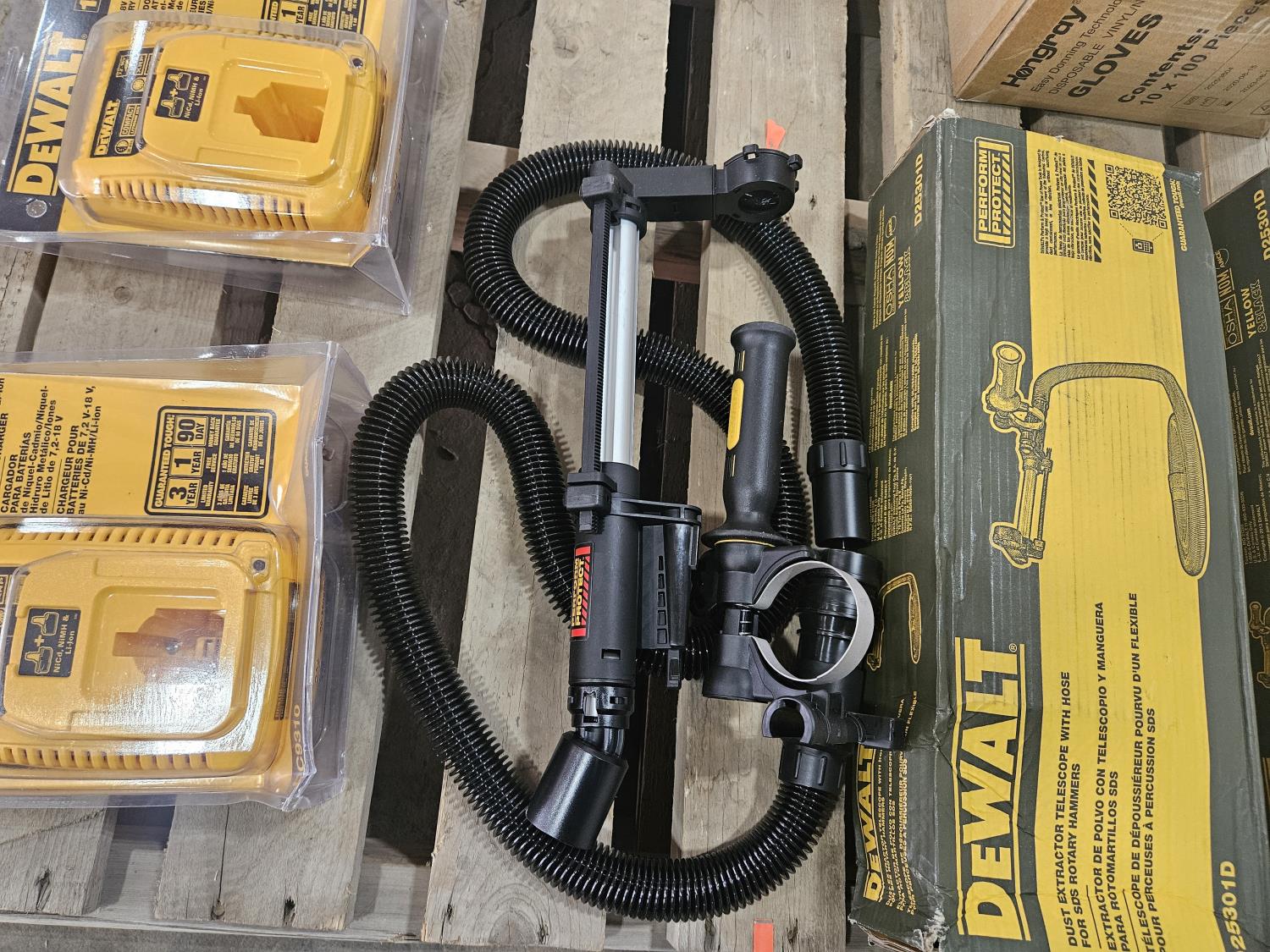 (2) 18V Dewalt battery chargers, (3) Dewalt dust extractors, disposable gloves, circuit breaker finder, hoses