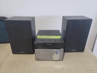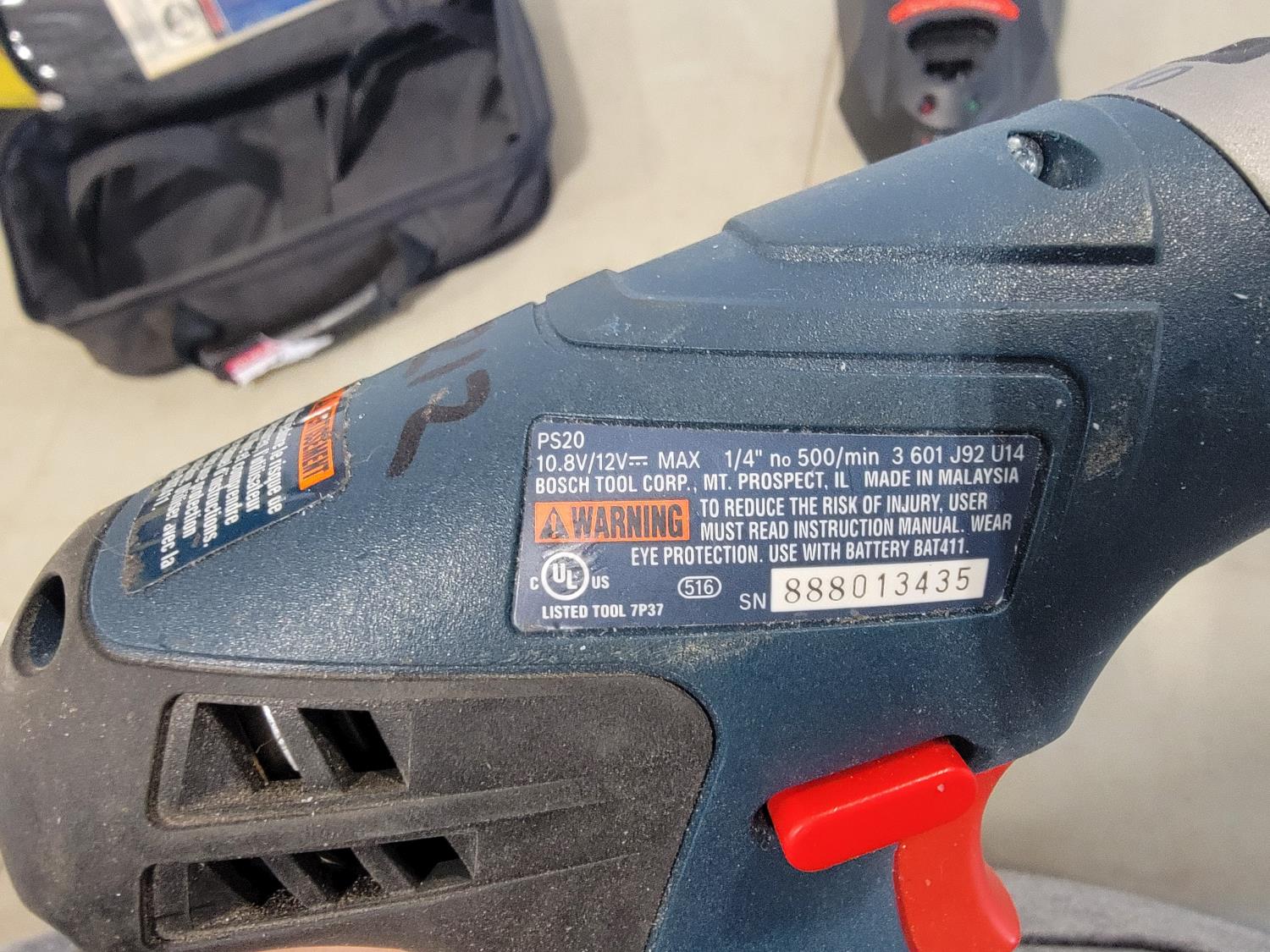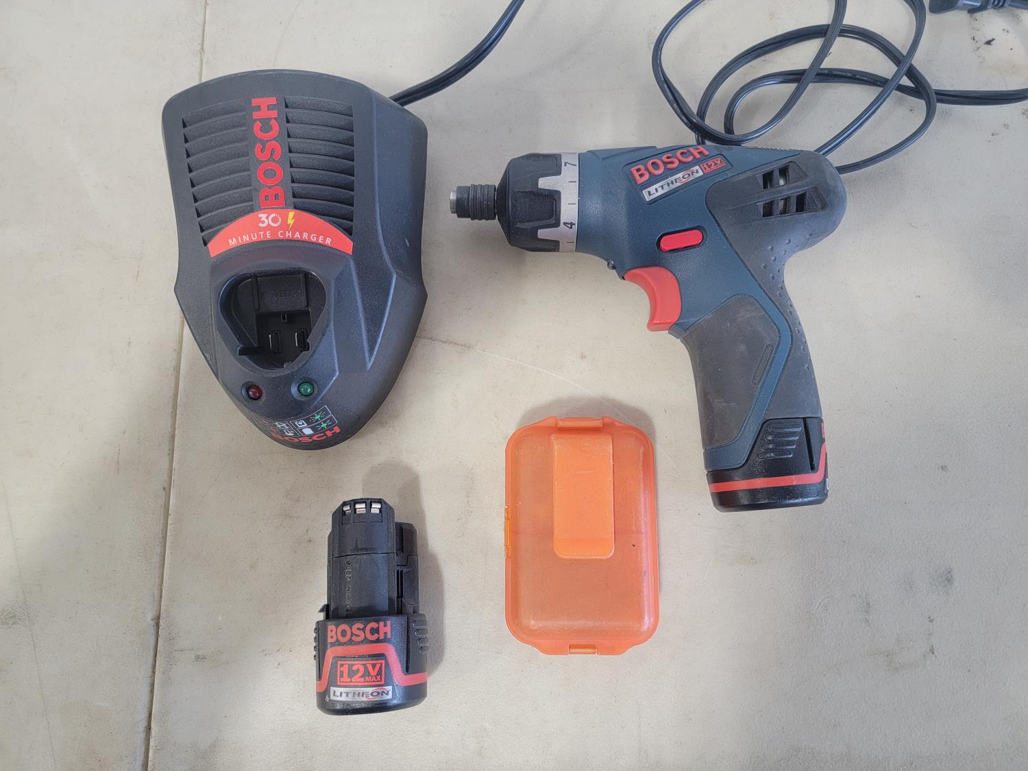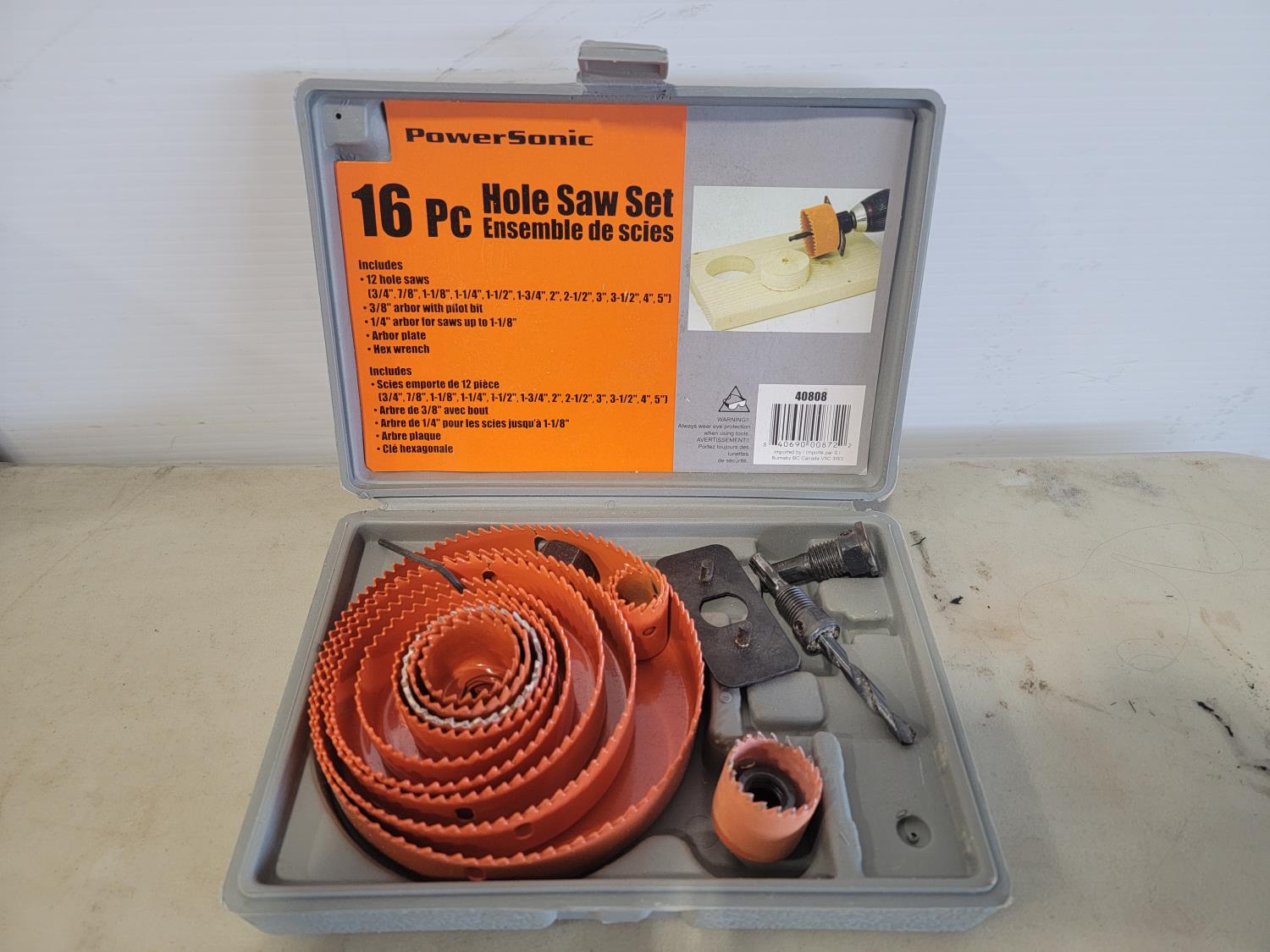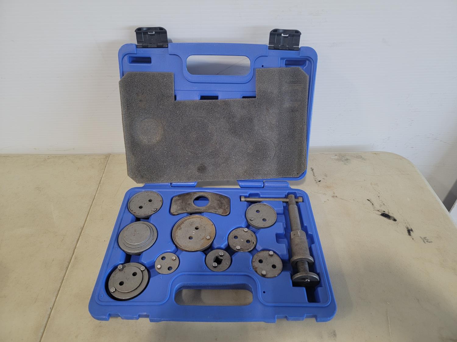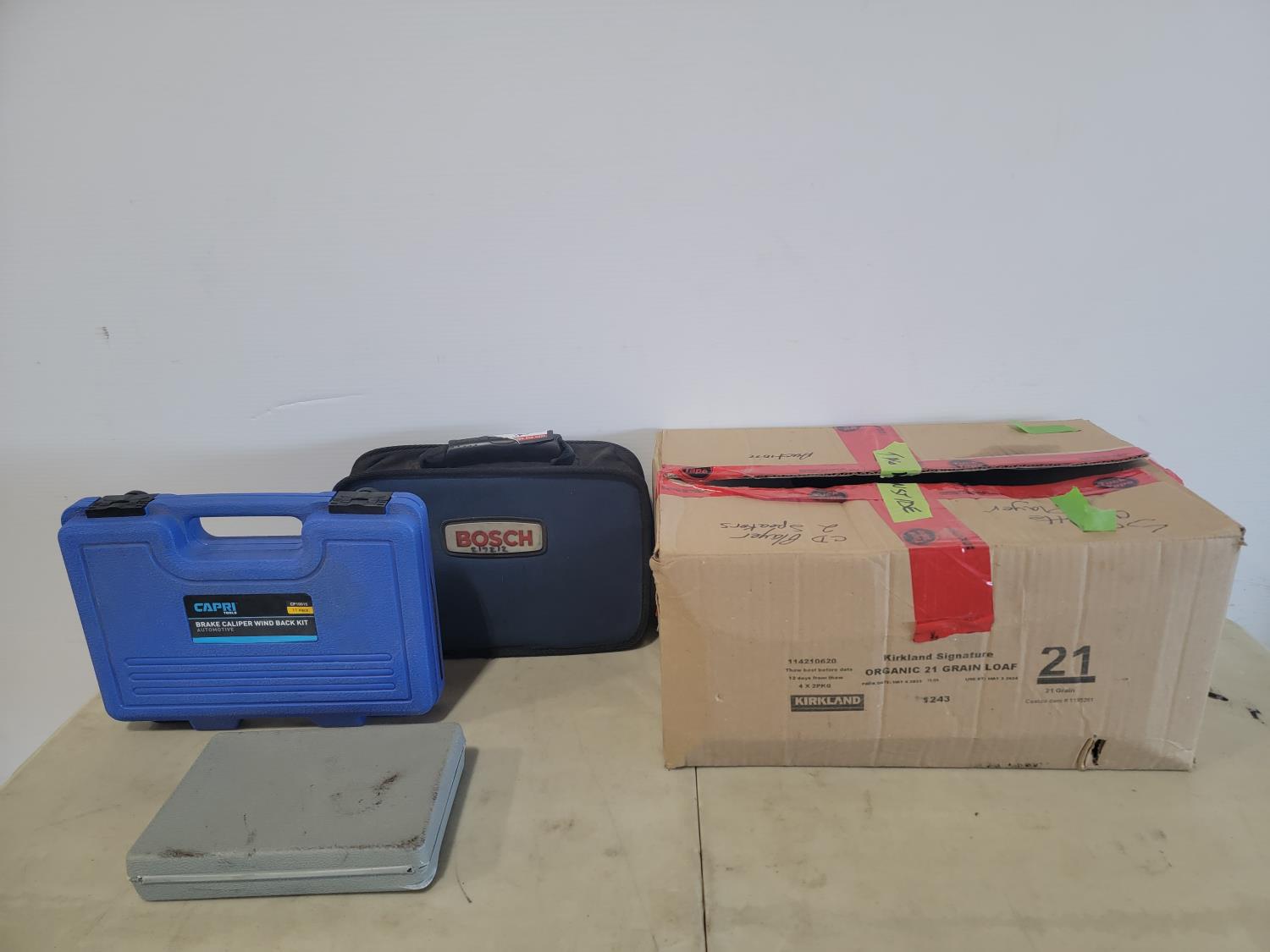 Sony stereo with speakers, power sonic hole saw kit, bosch 1/4 inch drill with bits and charger, capri brake caliper wind back kit