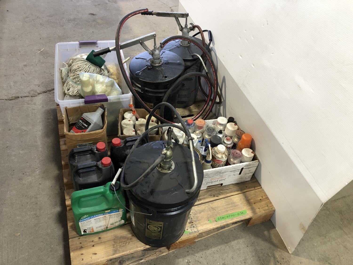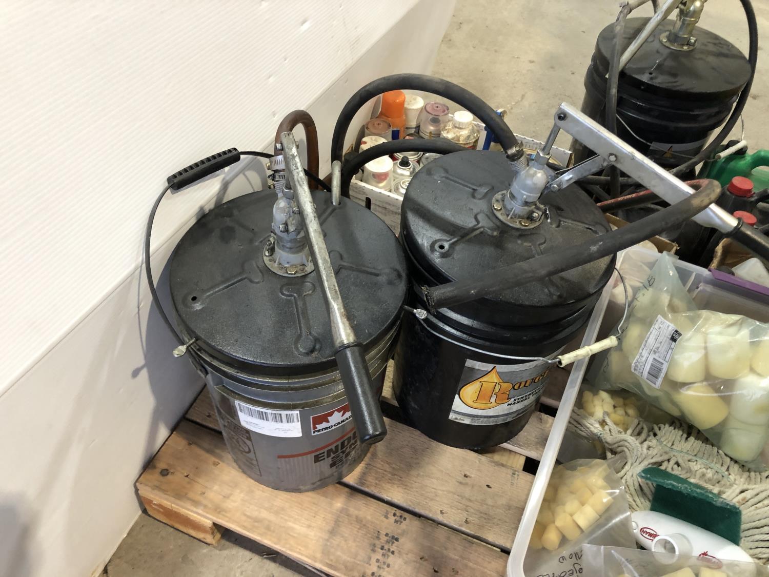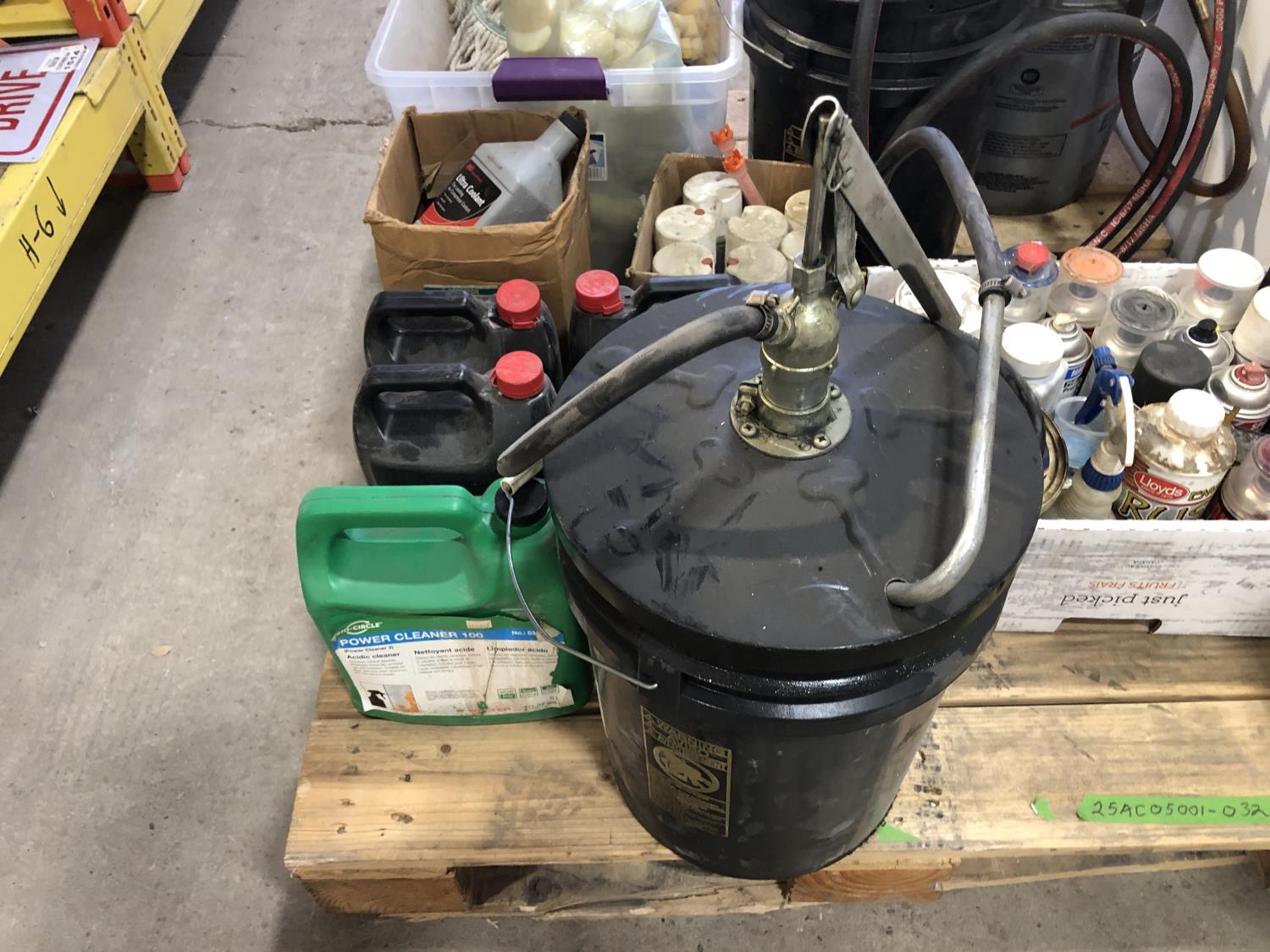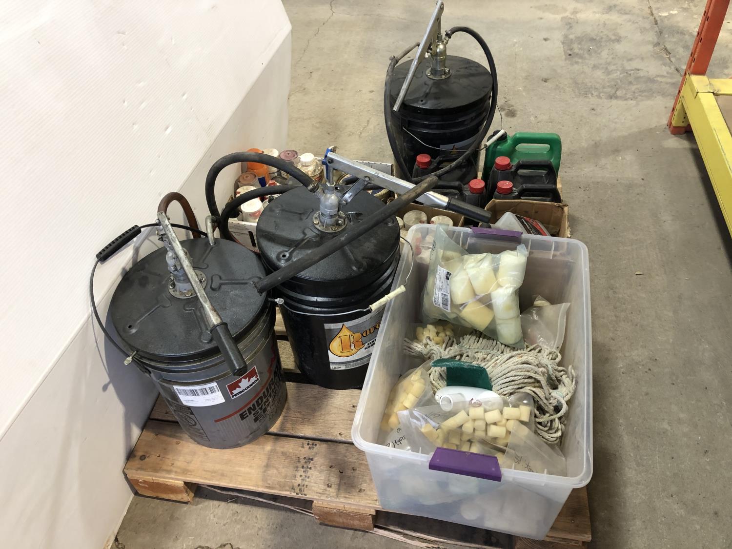 1247 Qty of Shop Fluids, (3) Pail Pumps, Foam Plugs and Caps