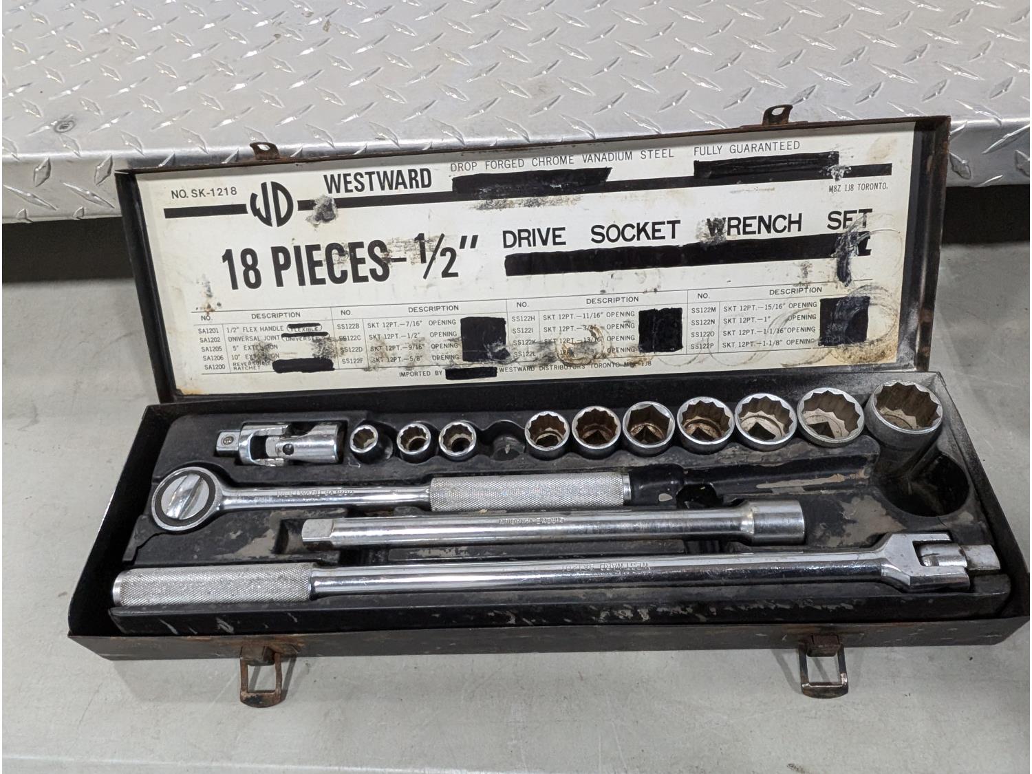 Westward 18 piece 1/2 inch socket set, (2) checkerplate aluminum 86-1/2 inch w x 13-1/4 inch d x 3 inch h, PTO