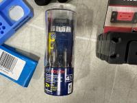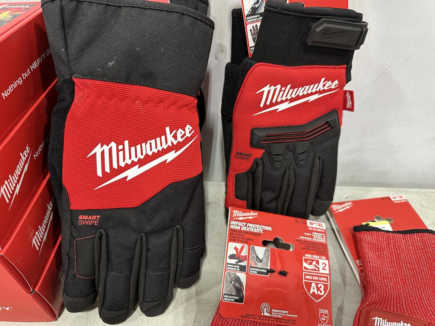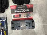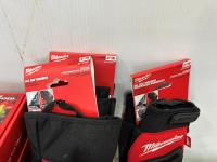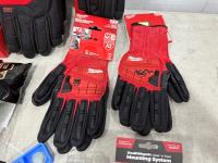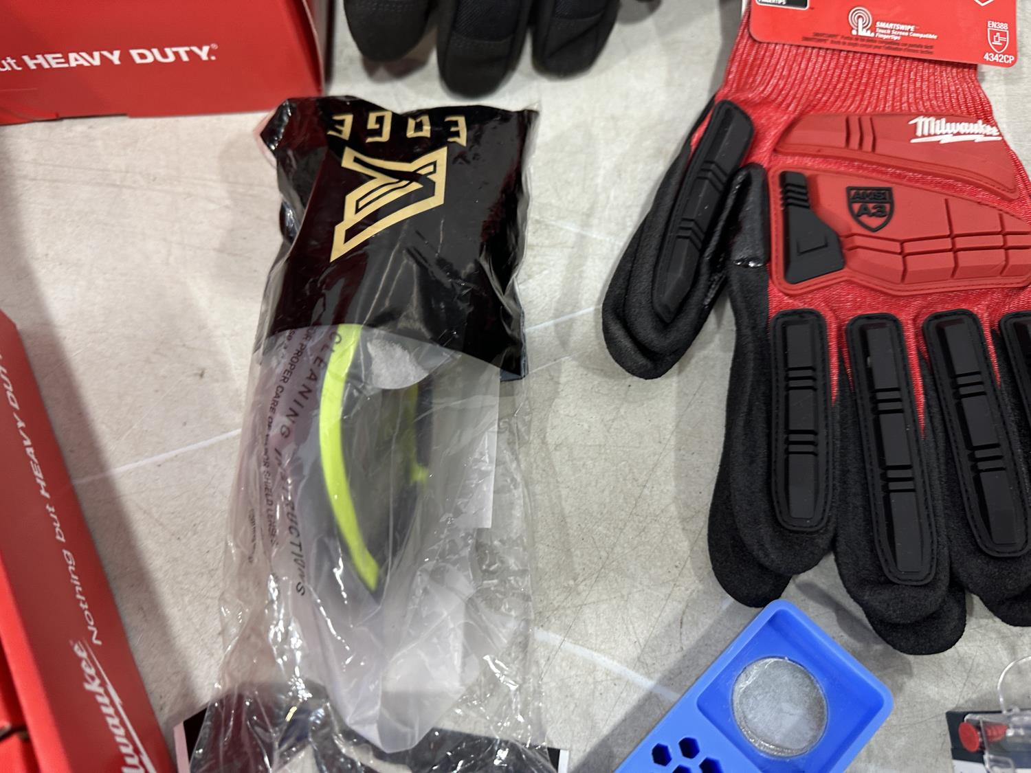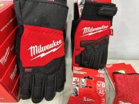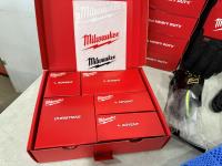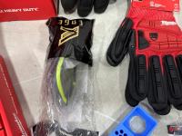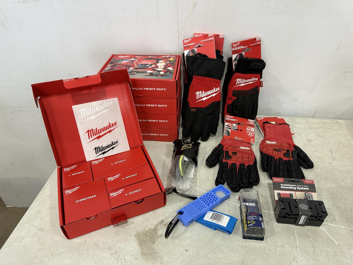 (20) Milwaukee multifunctional gaiters, (5) advent calendars, (3) pairs size medium gloves, (2) pairs size XL gloves, safety glasses, blister organizer, 4 piece Bosch bits, Packout mounting cleats