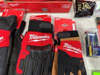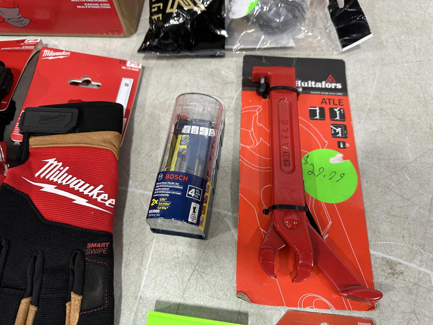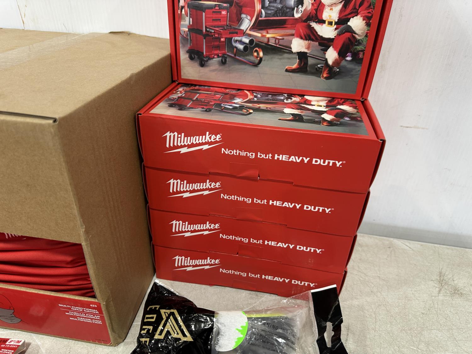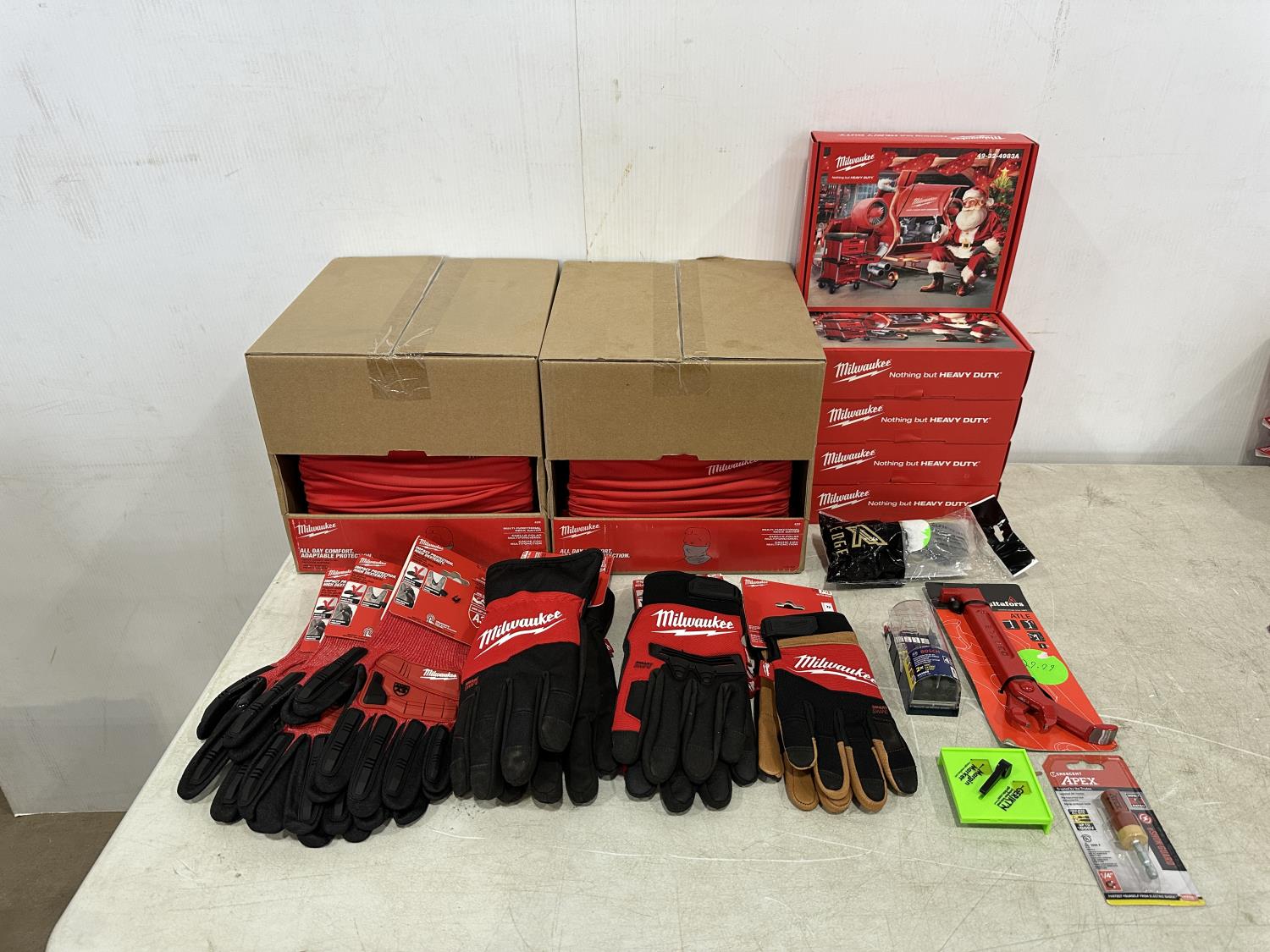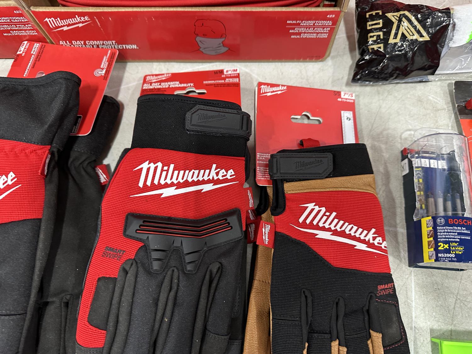 (20) Milwaukee multifunctional gaiters, (5) advent calendars, (3) pairs size XL gloves, (2) pairs size medium gloves, (1) pair size small gloves, safety glasses, blister organizer, 4 piece Bosch bits, nail puller, margin marker, bit holder