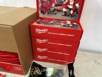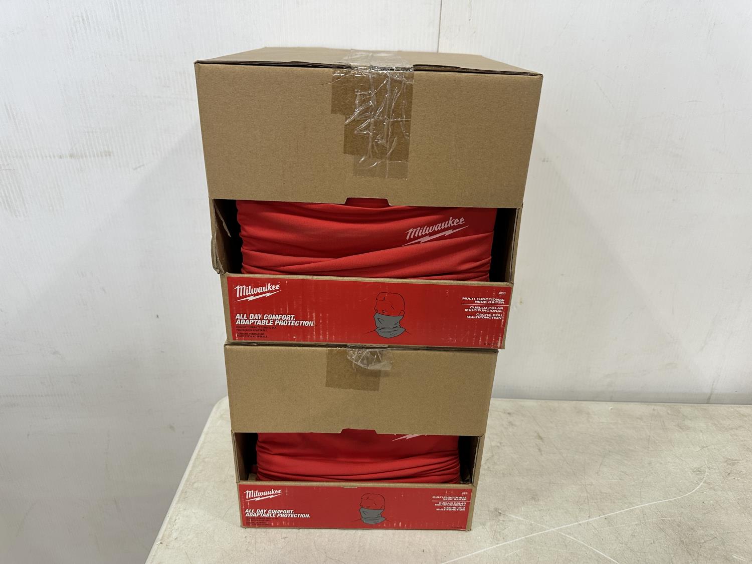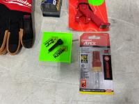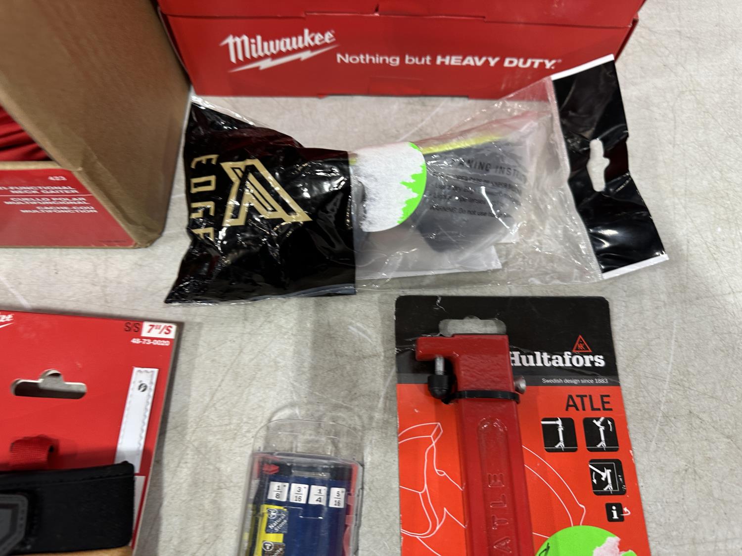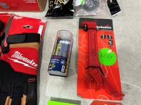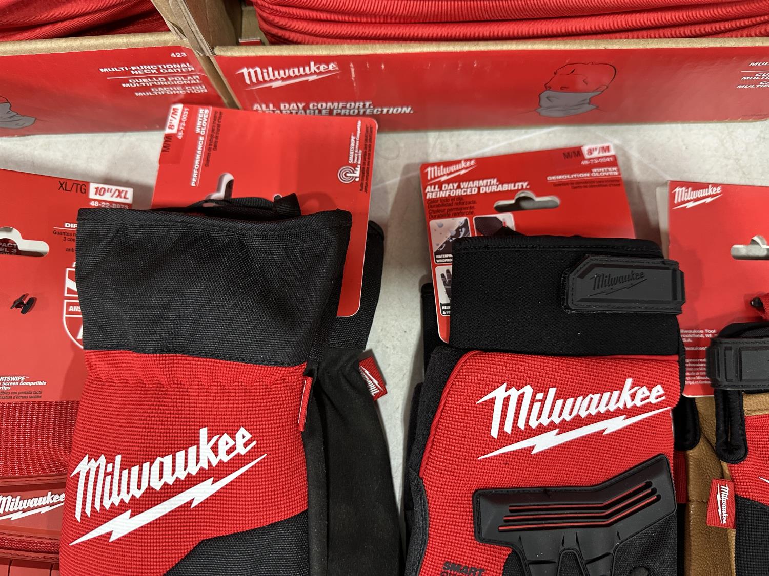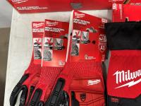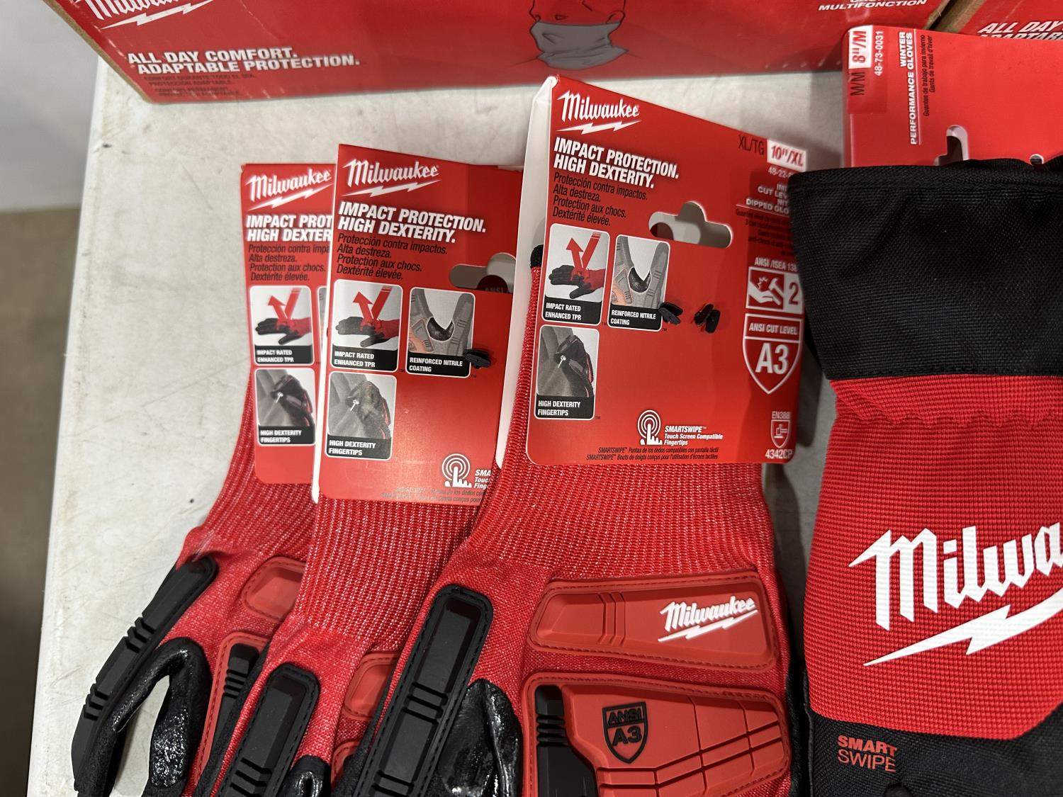 (20) Milwaukee multifunctional gaiters, (5) advent calendars, (3) pairs size XL gloves, (2) pairs size medium gloves, (1) pair size small gloves, safety glasses, blister organizer, 4 piece Bosch bits, nail puller, margin marker, bit holder