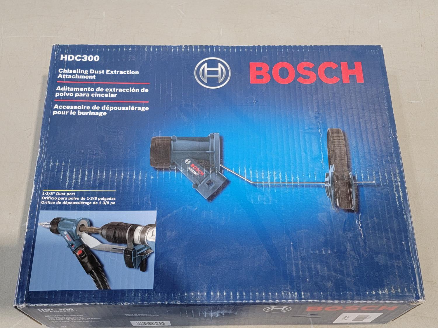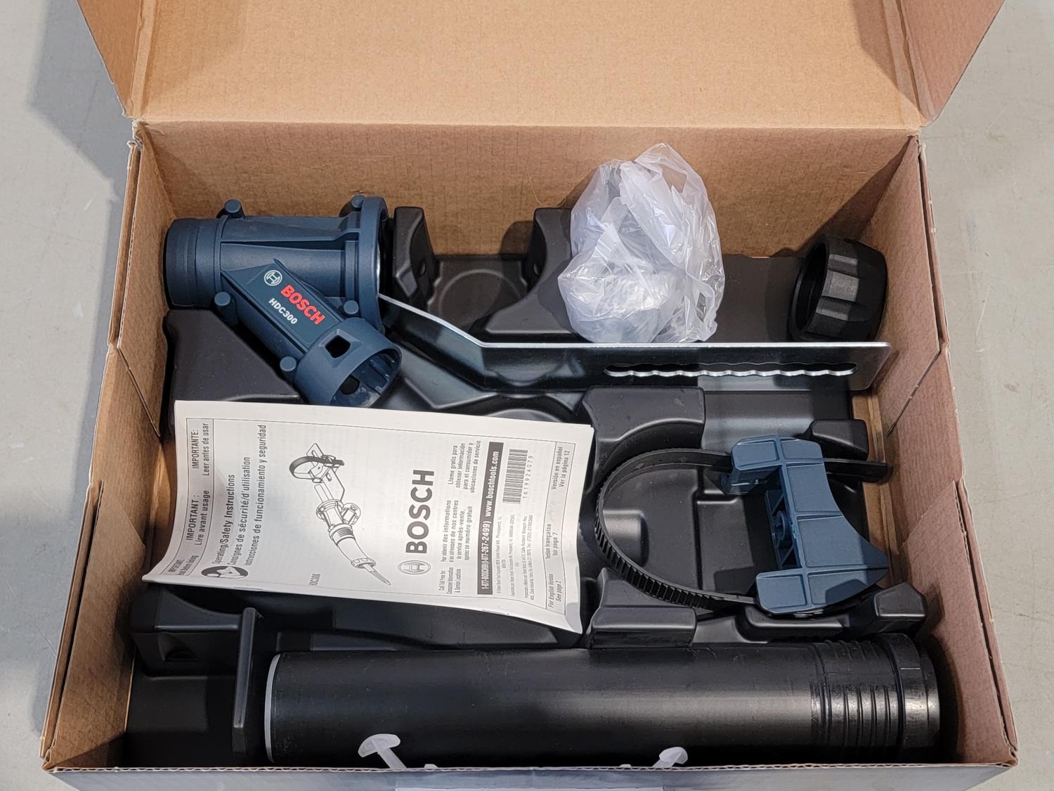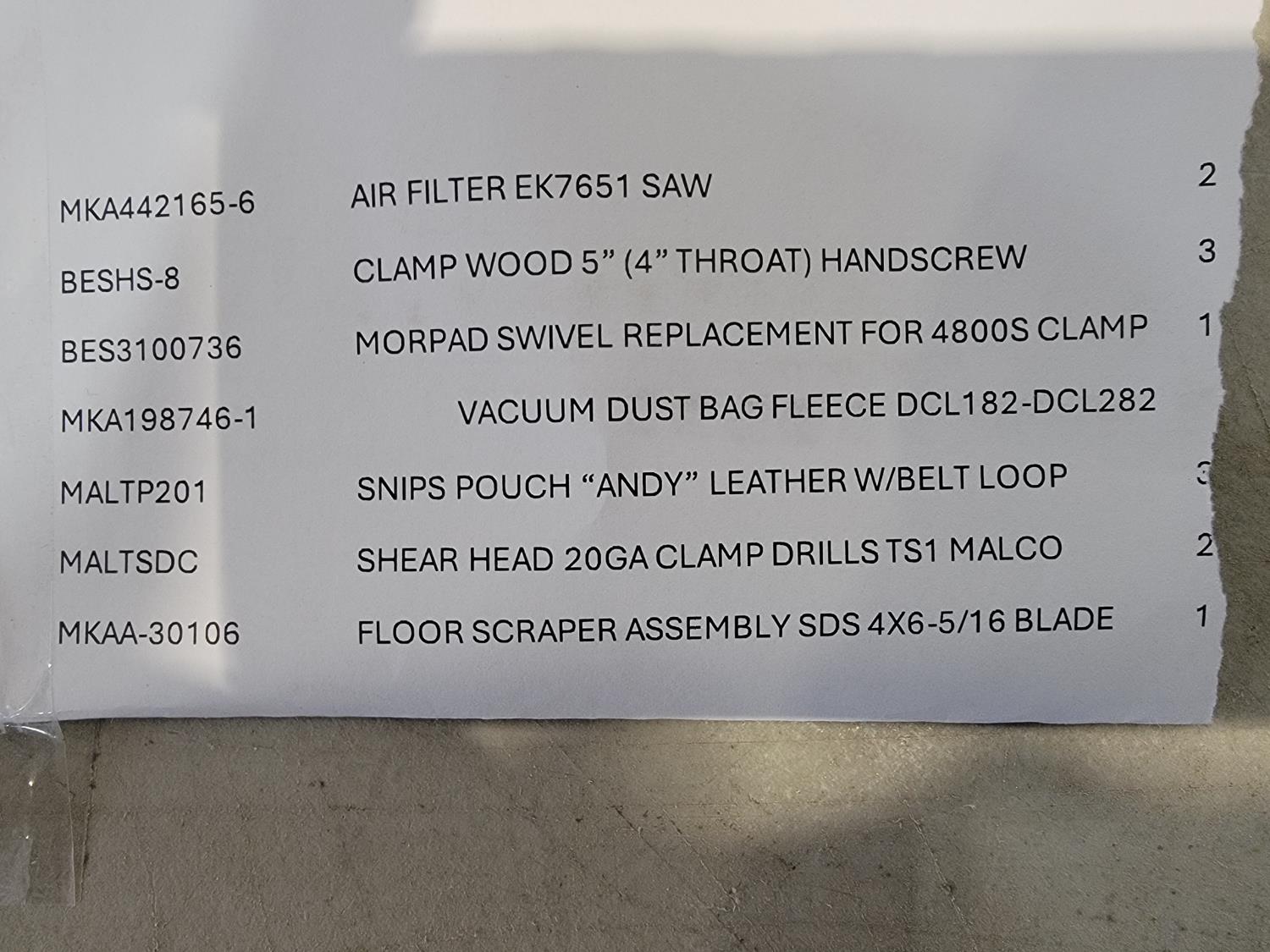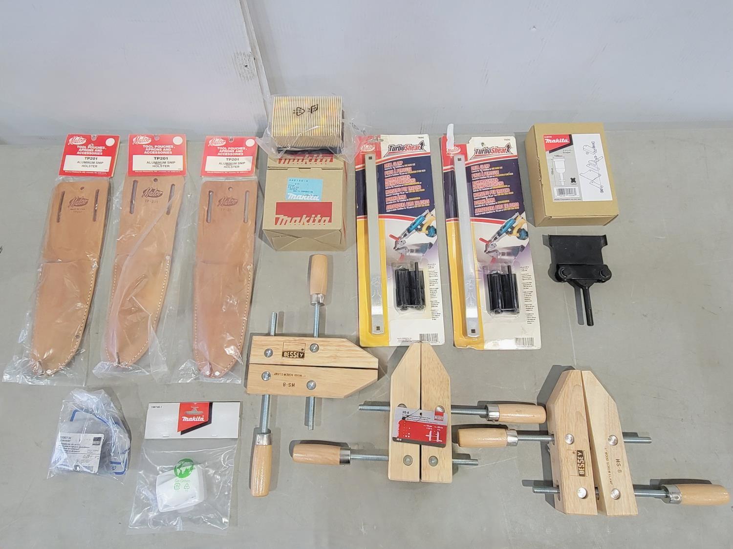 Aluminum snip holsters, wood screw clamps, drill clamps, plungers, 4-1/2 inch striker nails, 1-1/2 inch hardwood flooring nails, Bosch chiseling dust extraction attachment