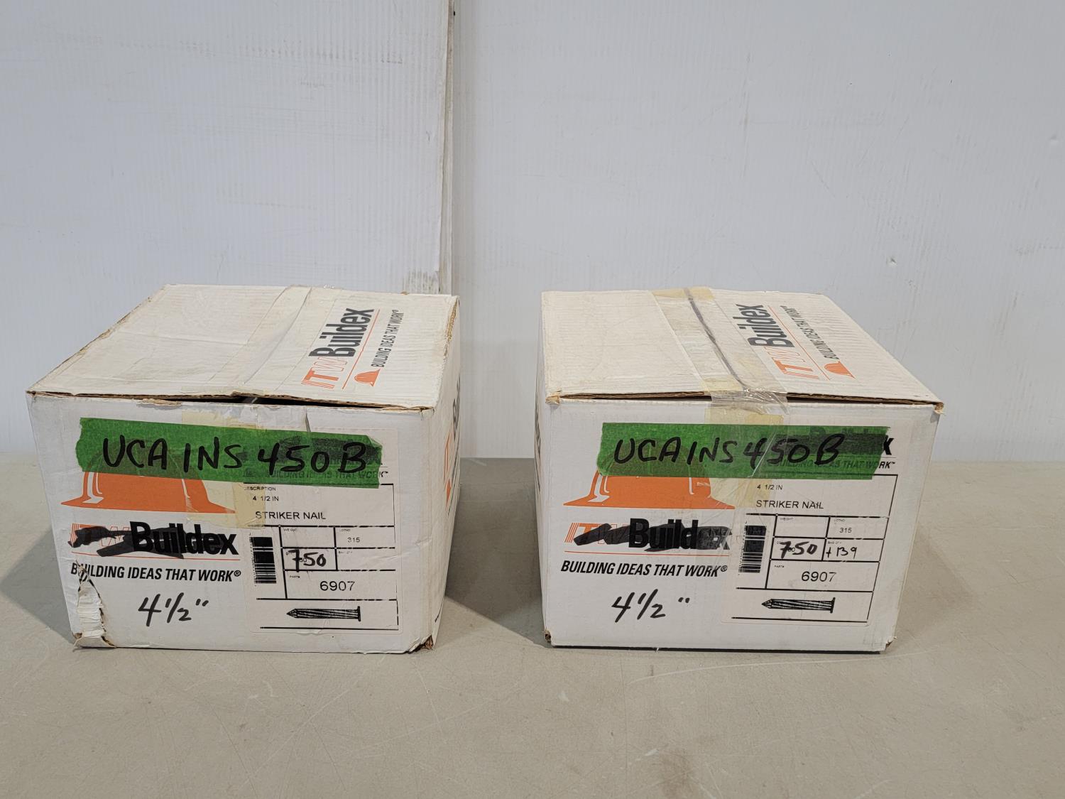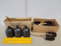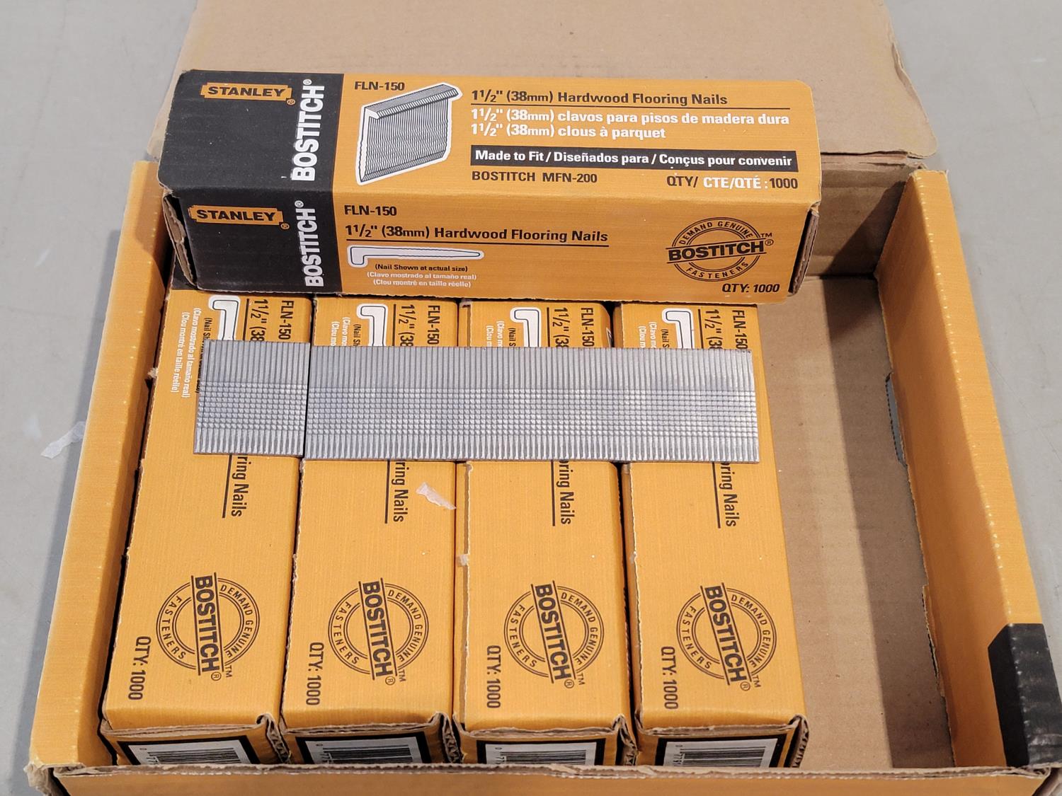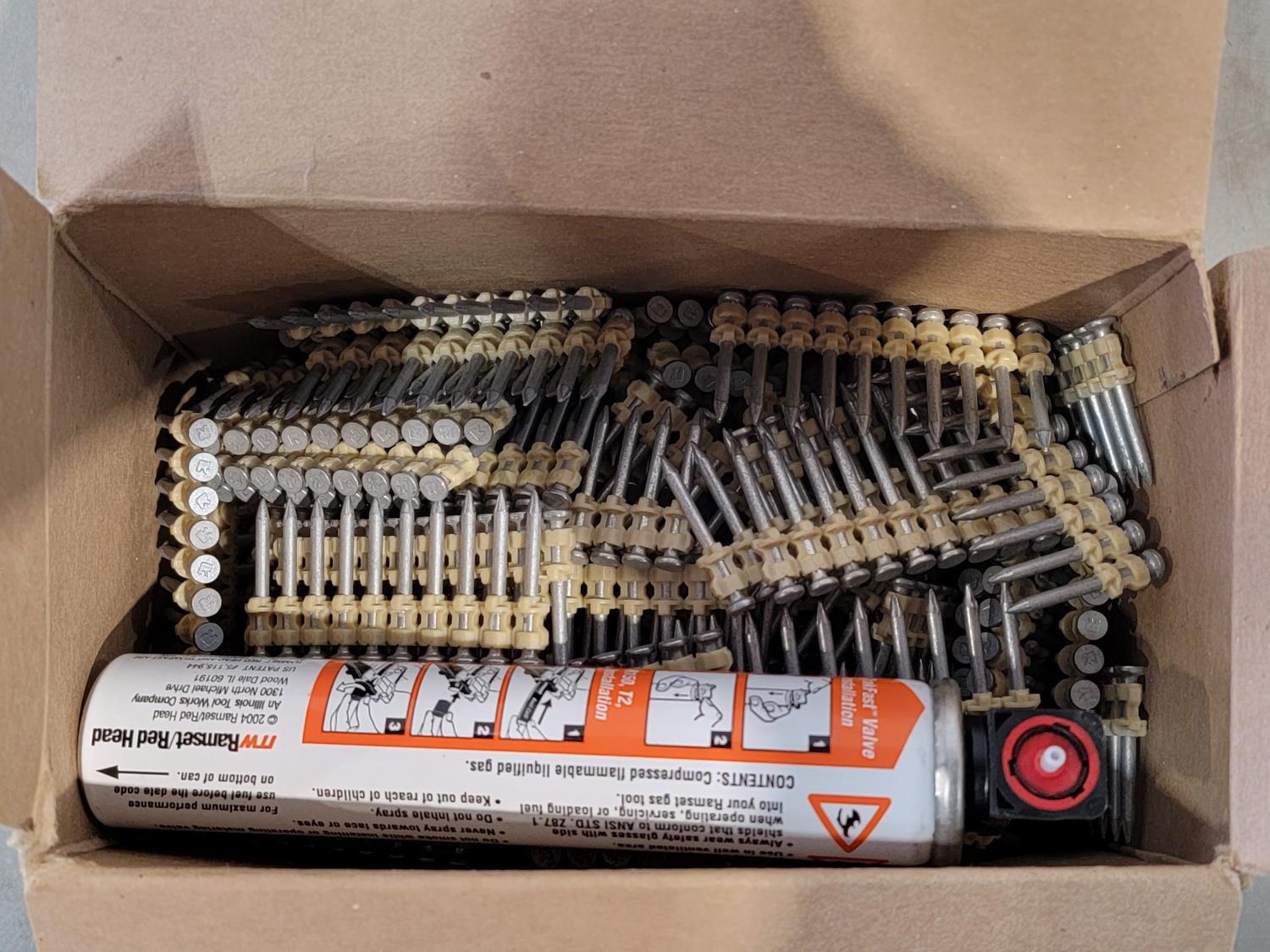 Aluminum snip holsters, wood screw clamps, drill clamps, plungers, 4-1/2 inch striker nails, 1-1/2 inch hardwood flooring nails, Bosch chiseling dust extraction attachment