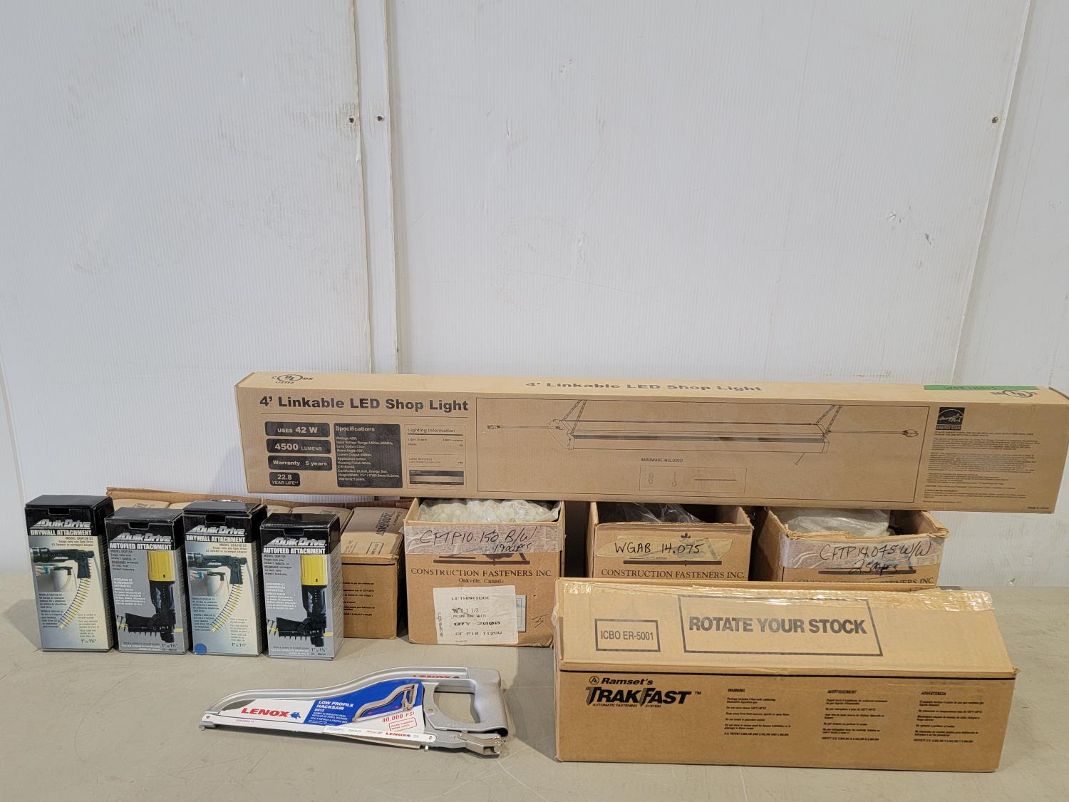 4 ft LED shop light, Quik Drive attachments, fasteners, low profile hacksaw