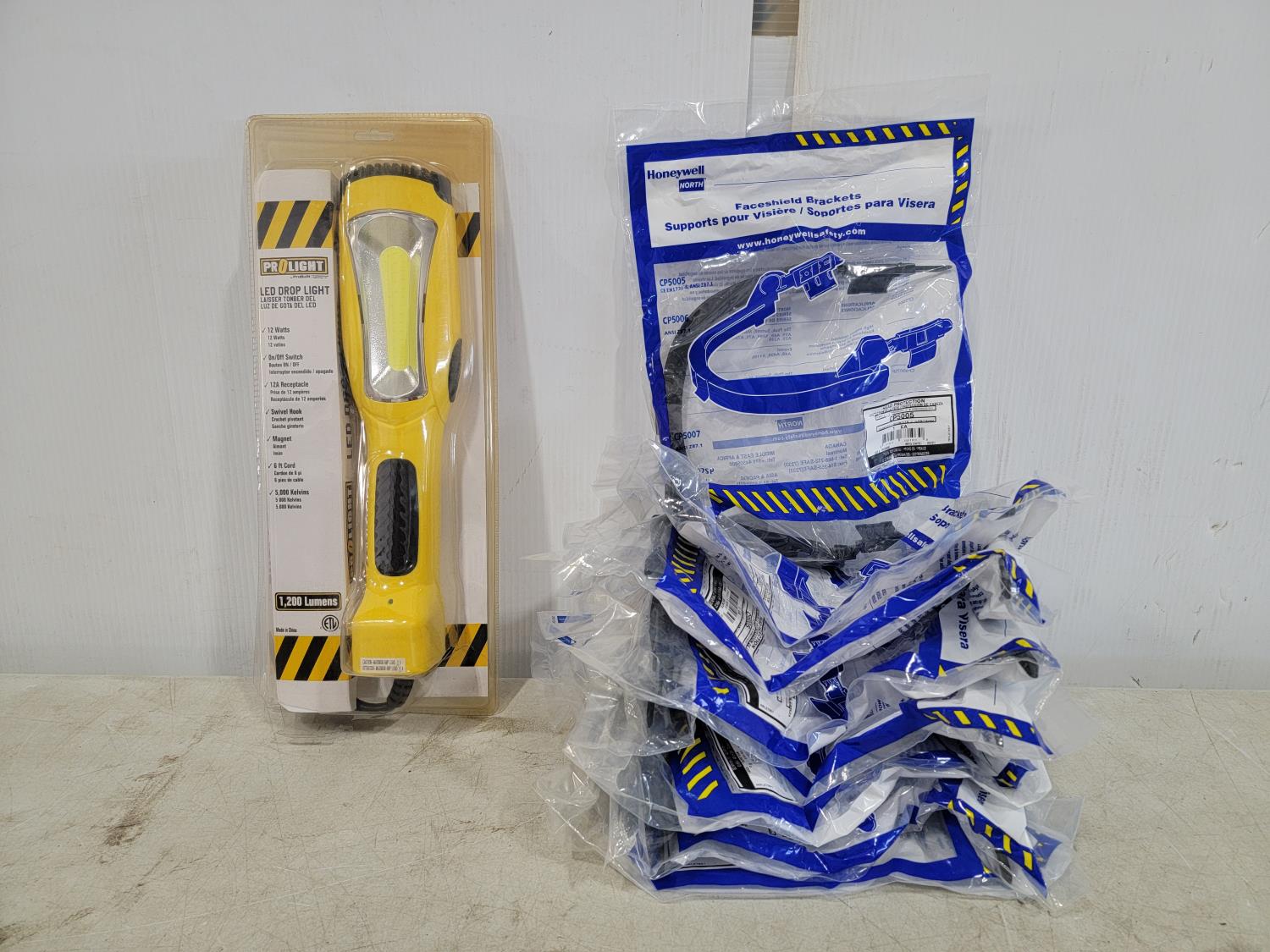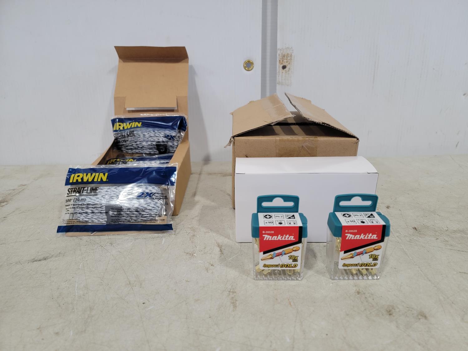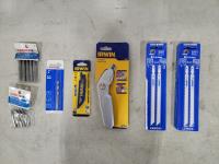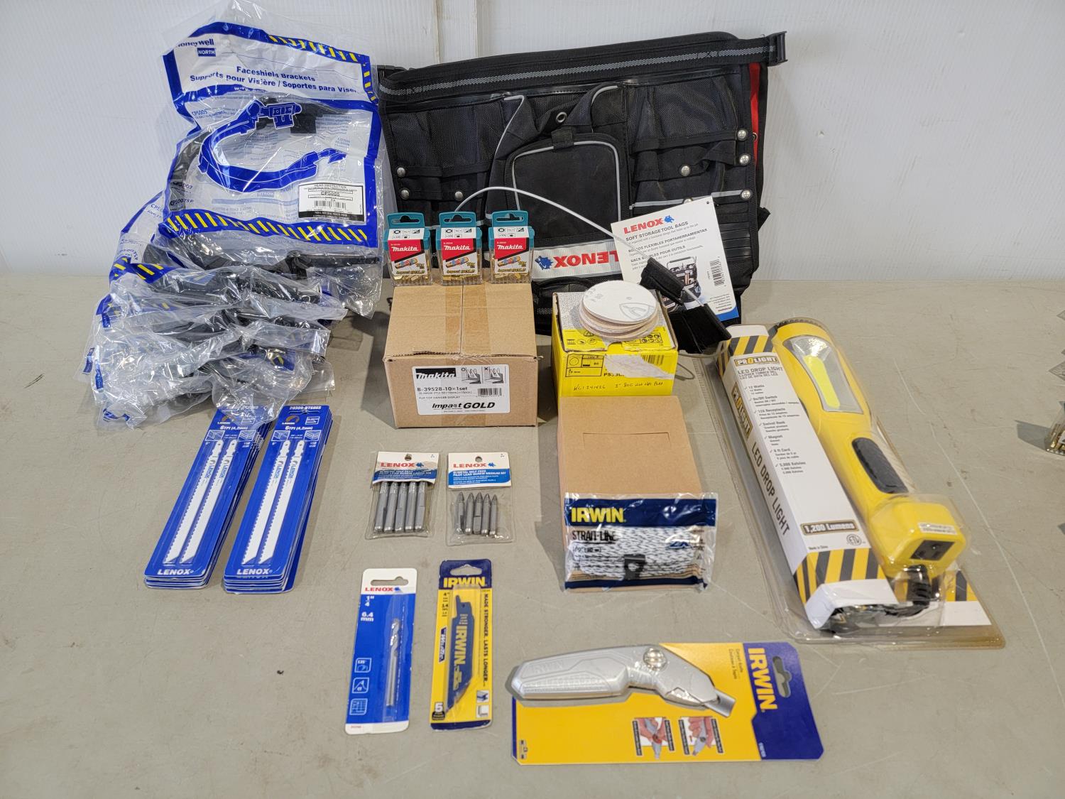 Jigsaw blades, carpet knife, faceshield brackets, bits, LED drop light, soft storage tool bag, abrasive discs, flip top hanger displays
