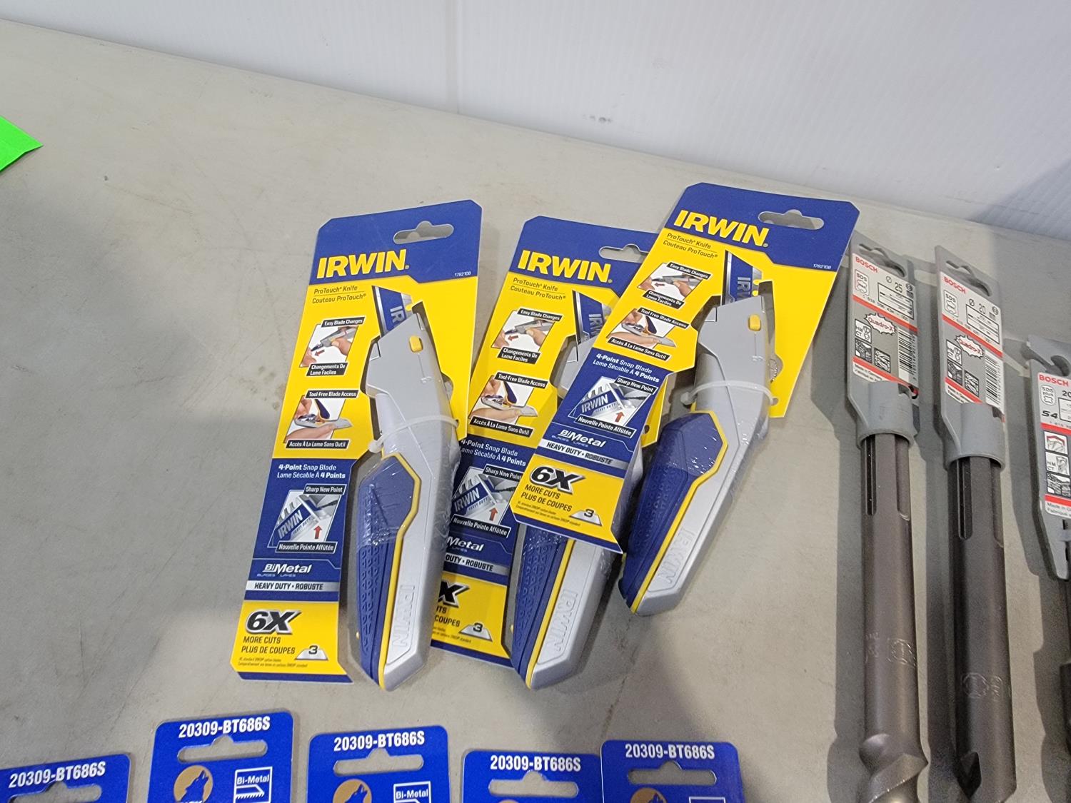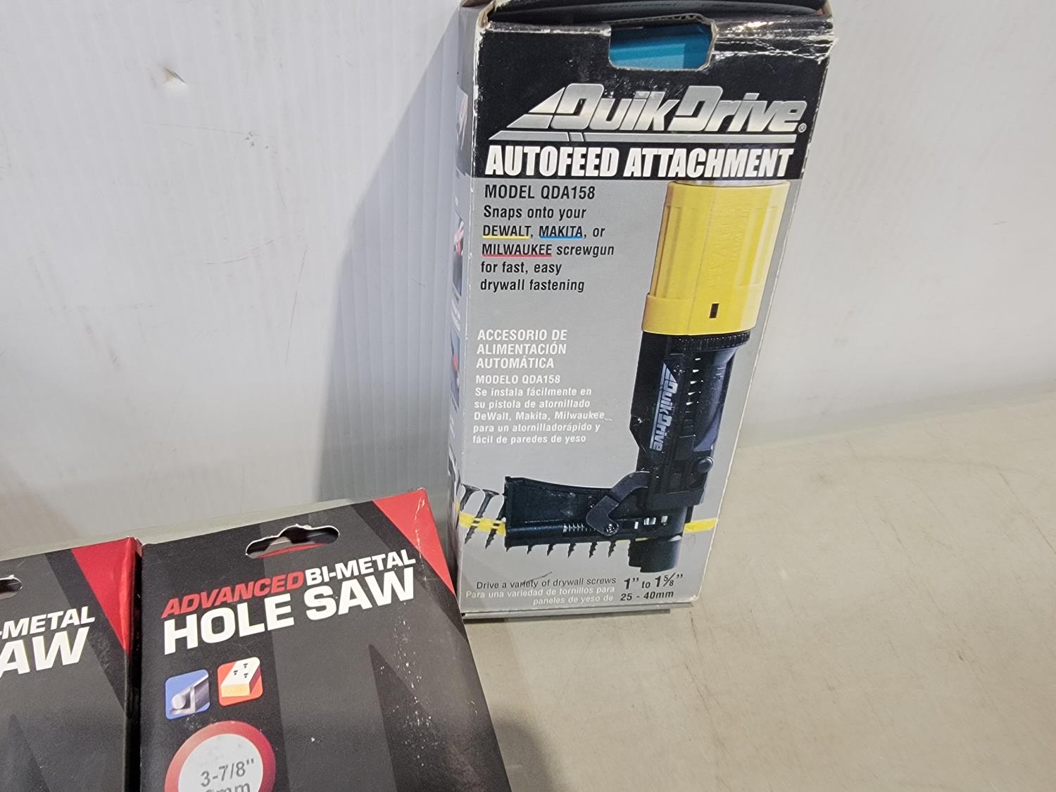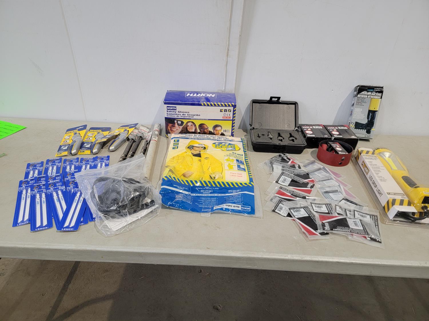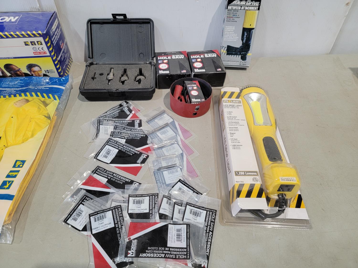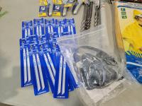 Jigsaw blades, carpet knives, bits, safety glasses, LED drop light, rainwear, hole saws, Quik Drive autofeed attachment