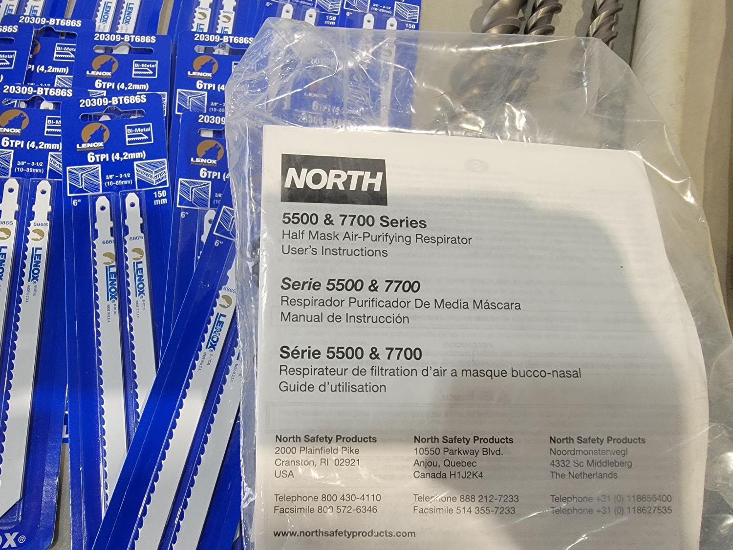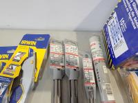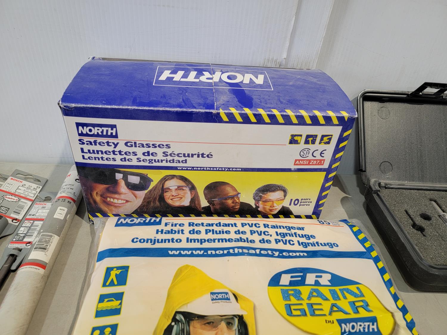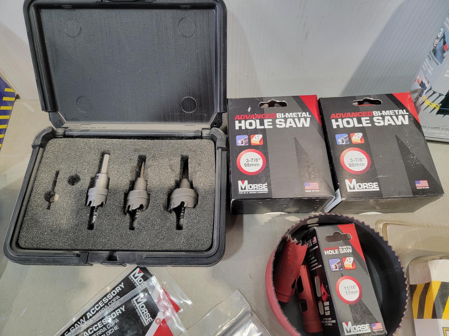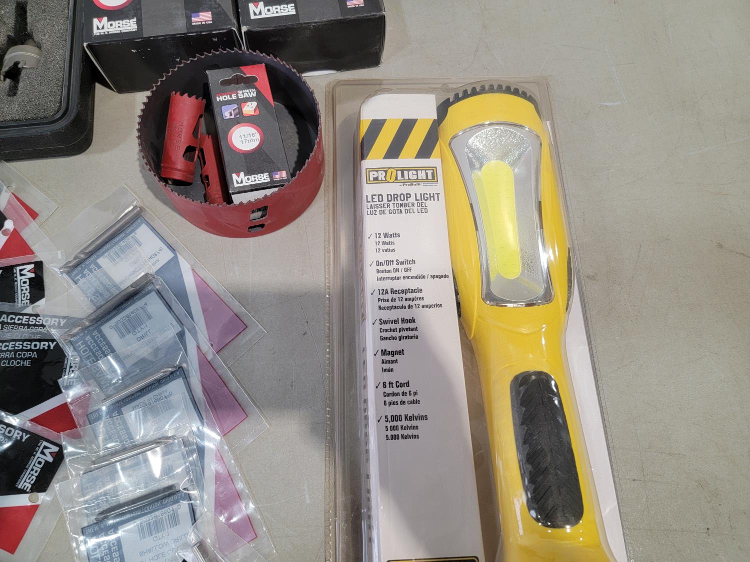 Jigsaw blades, carpet knives, bits, safety glasses, LED drop light, rainwear, hole saws, Quik Drive autofeed attachment