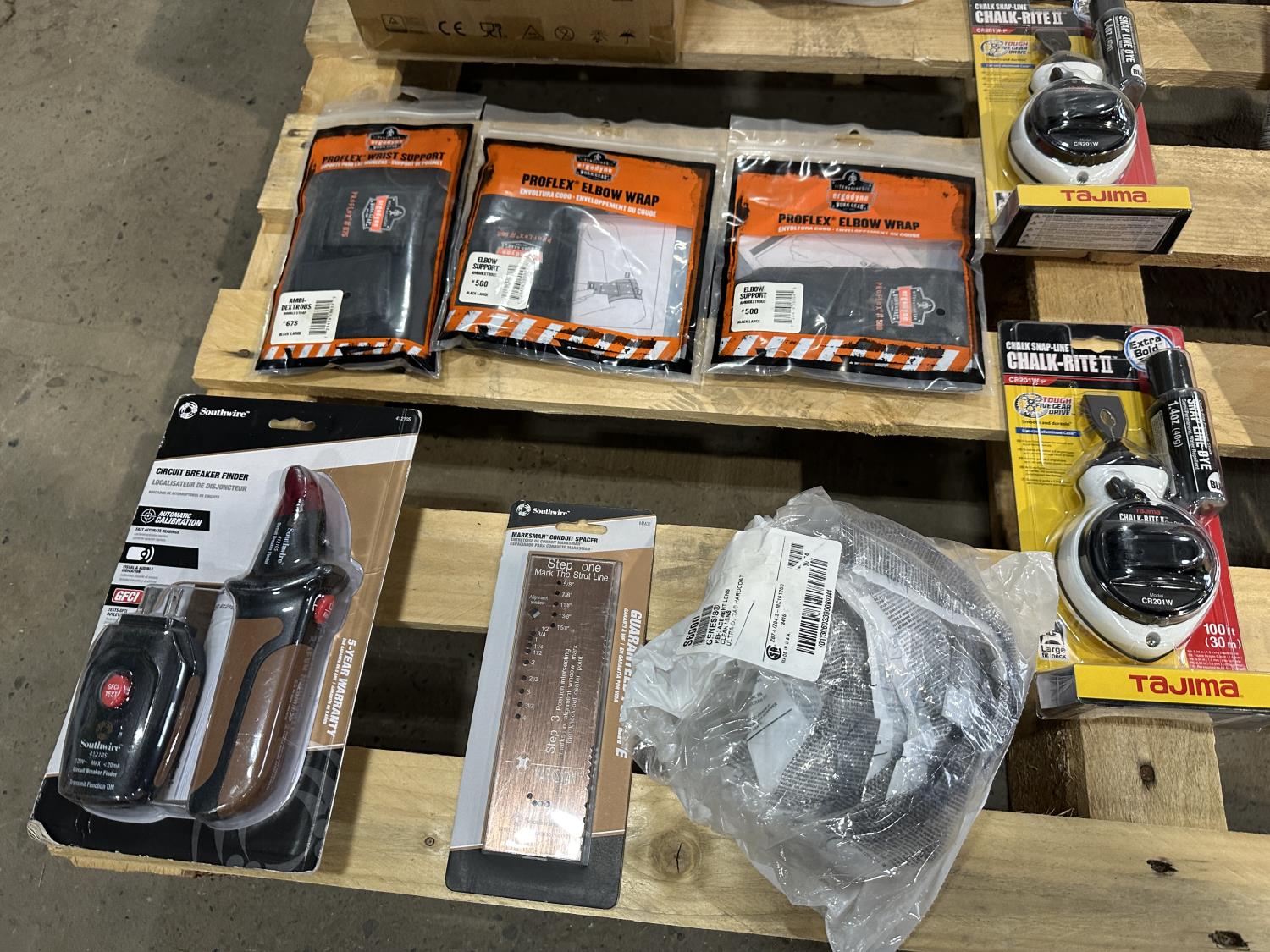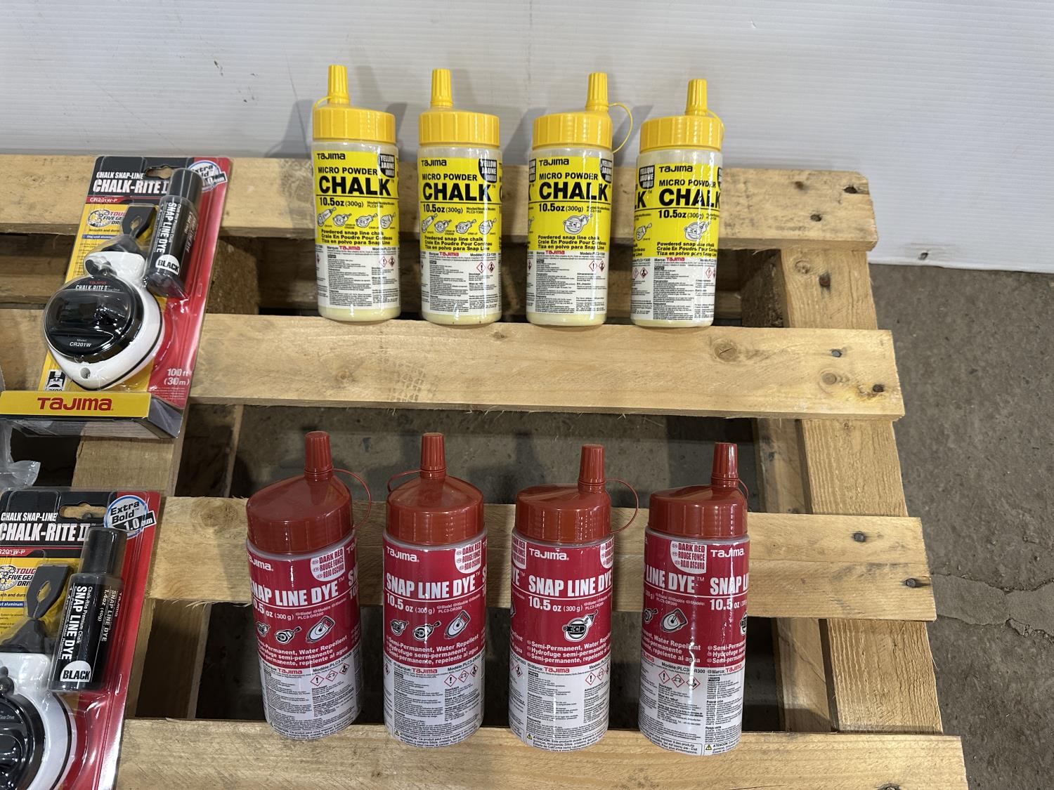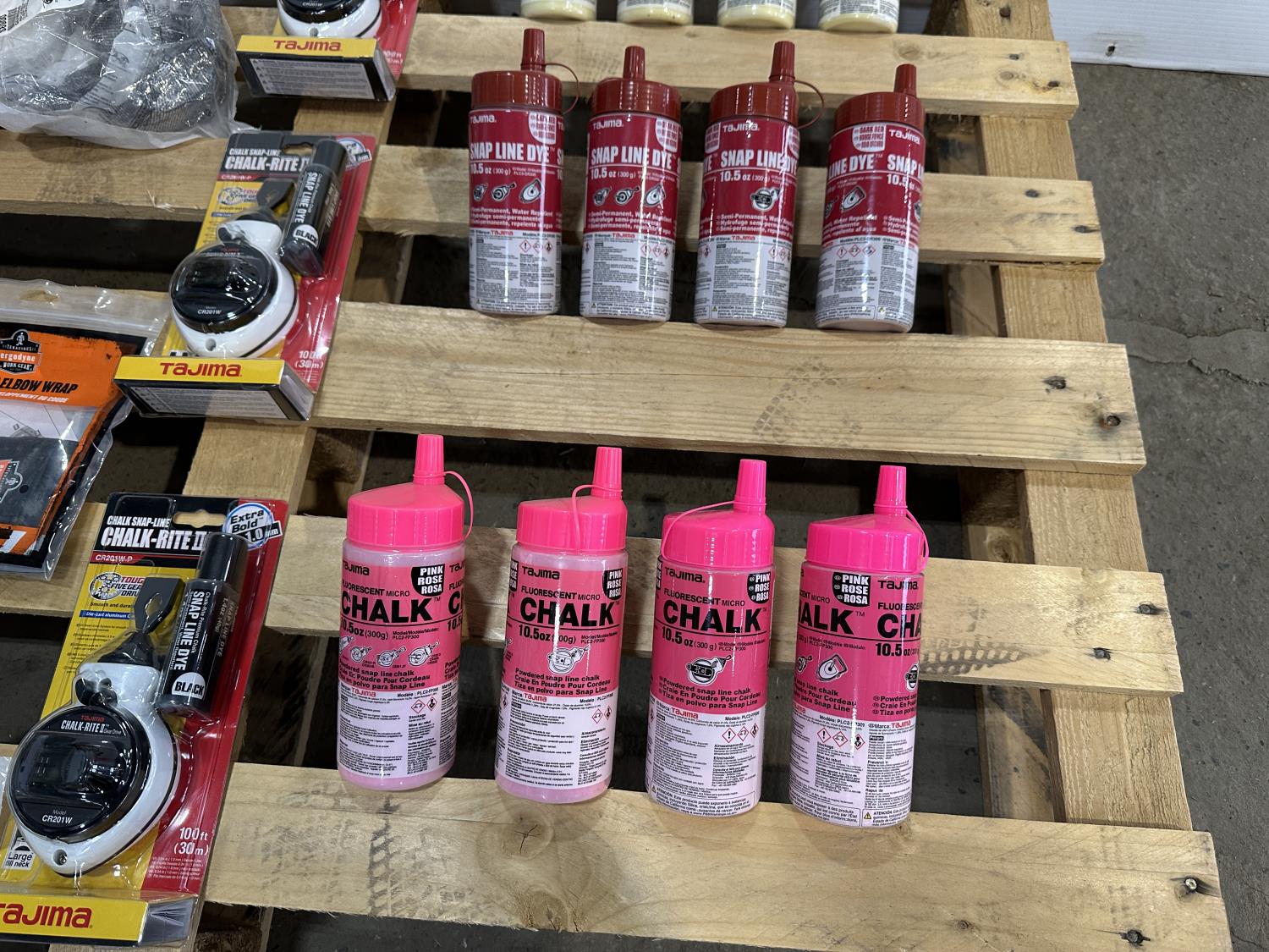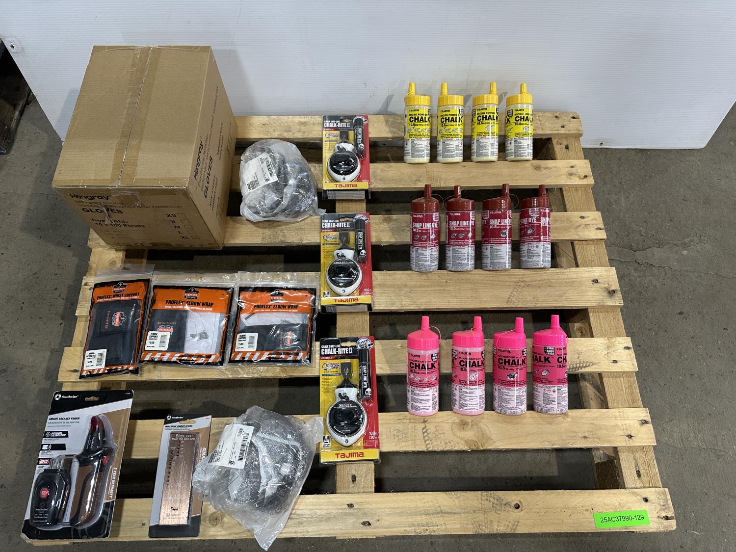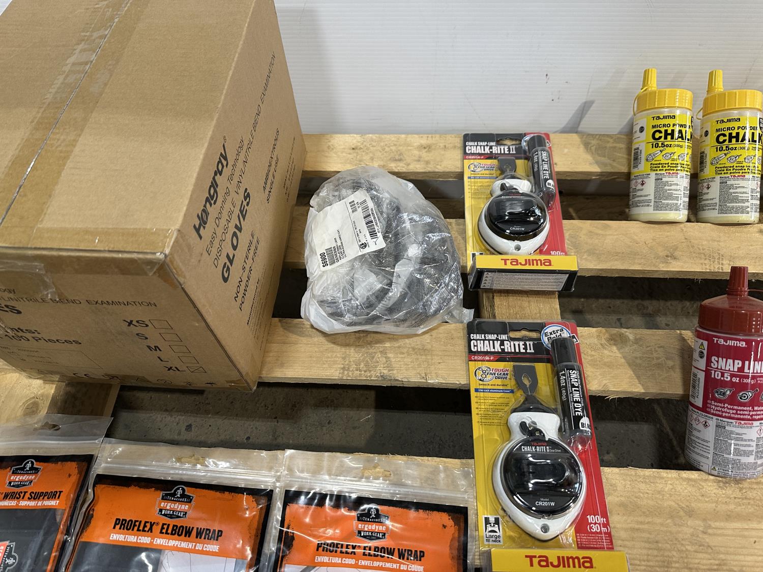 Chalk line powder, gloves, circuit breaker finder, safety lenses
