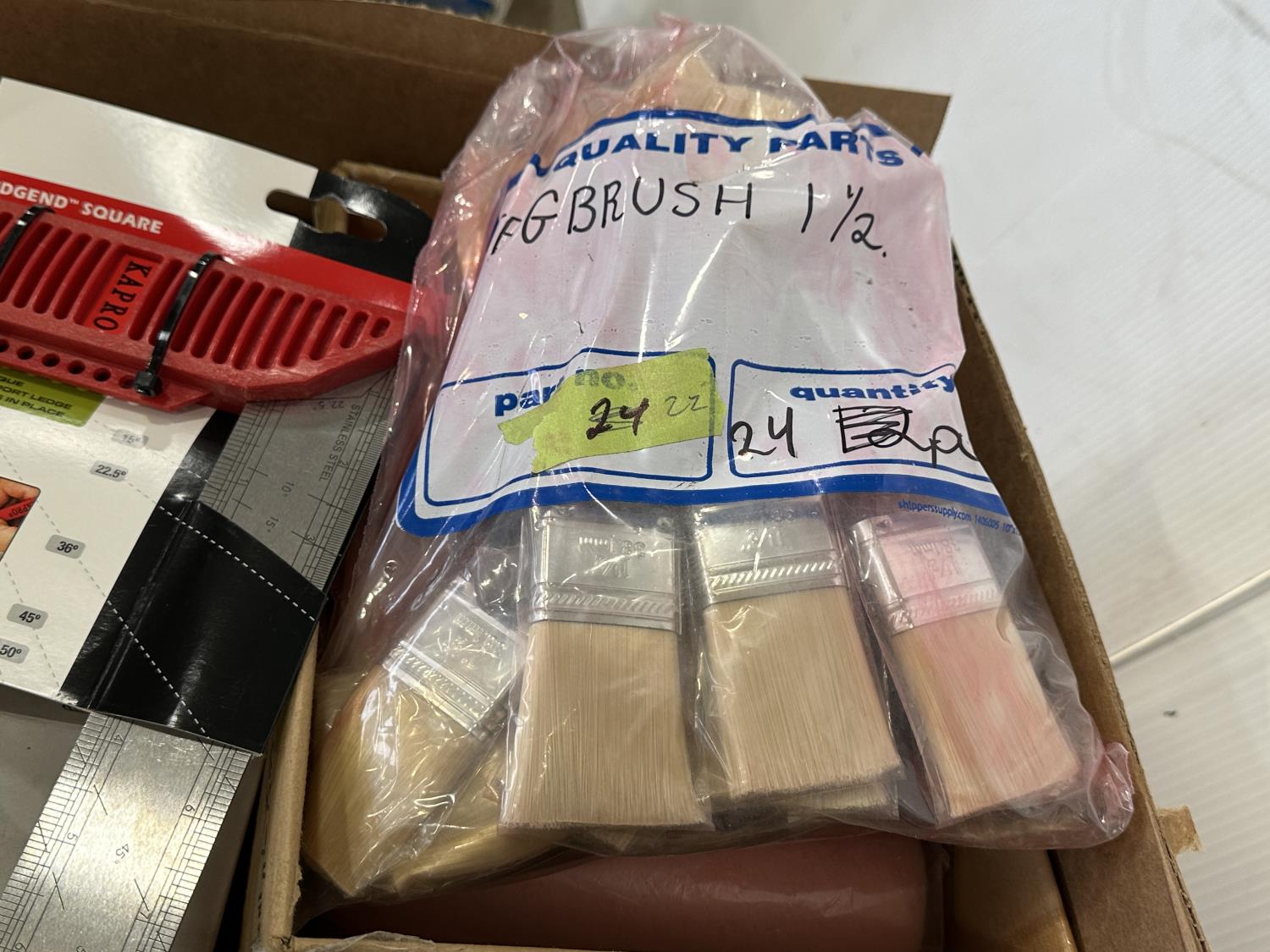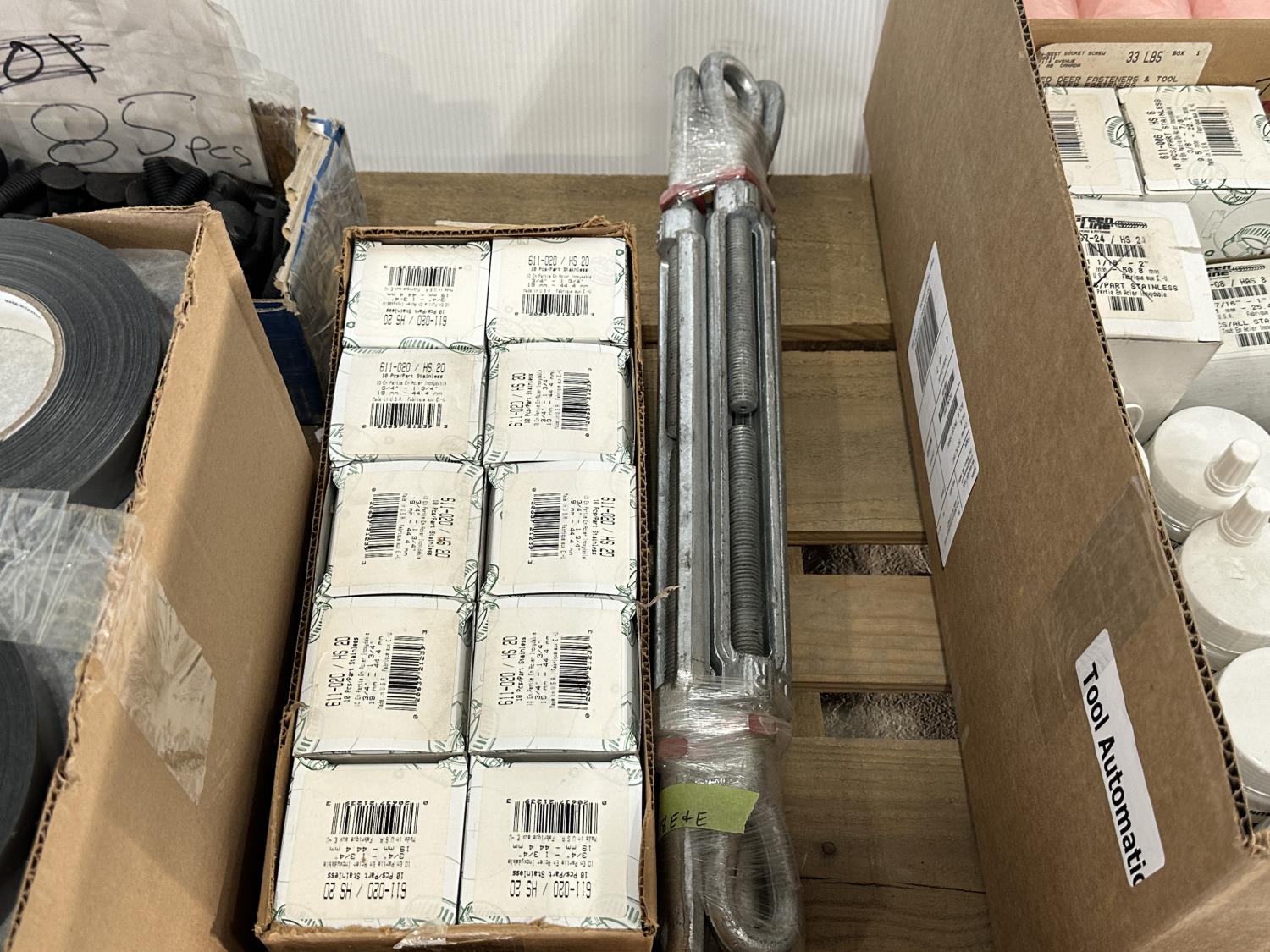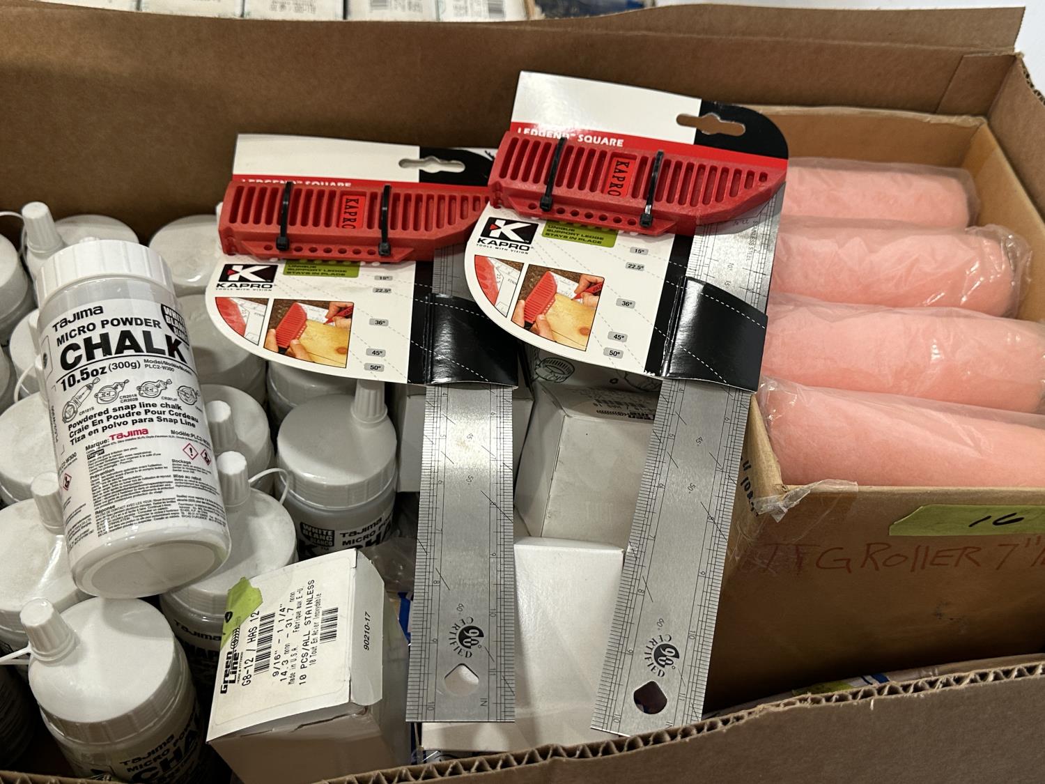 Gear clamps, silver tape, turnbuckles, bolts, chalk powder, rollers, (2) Ledgend squares, paint brushes