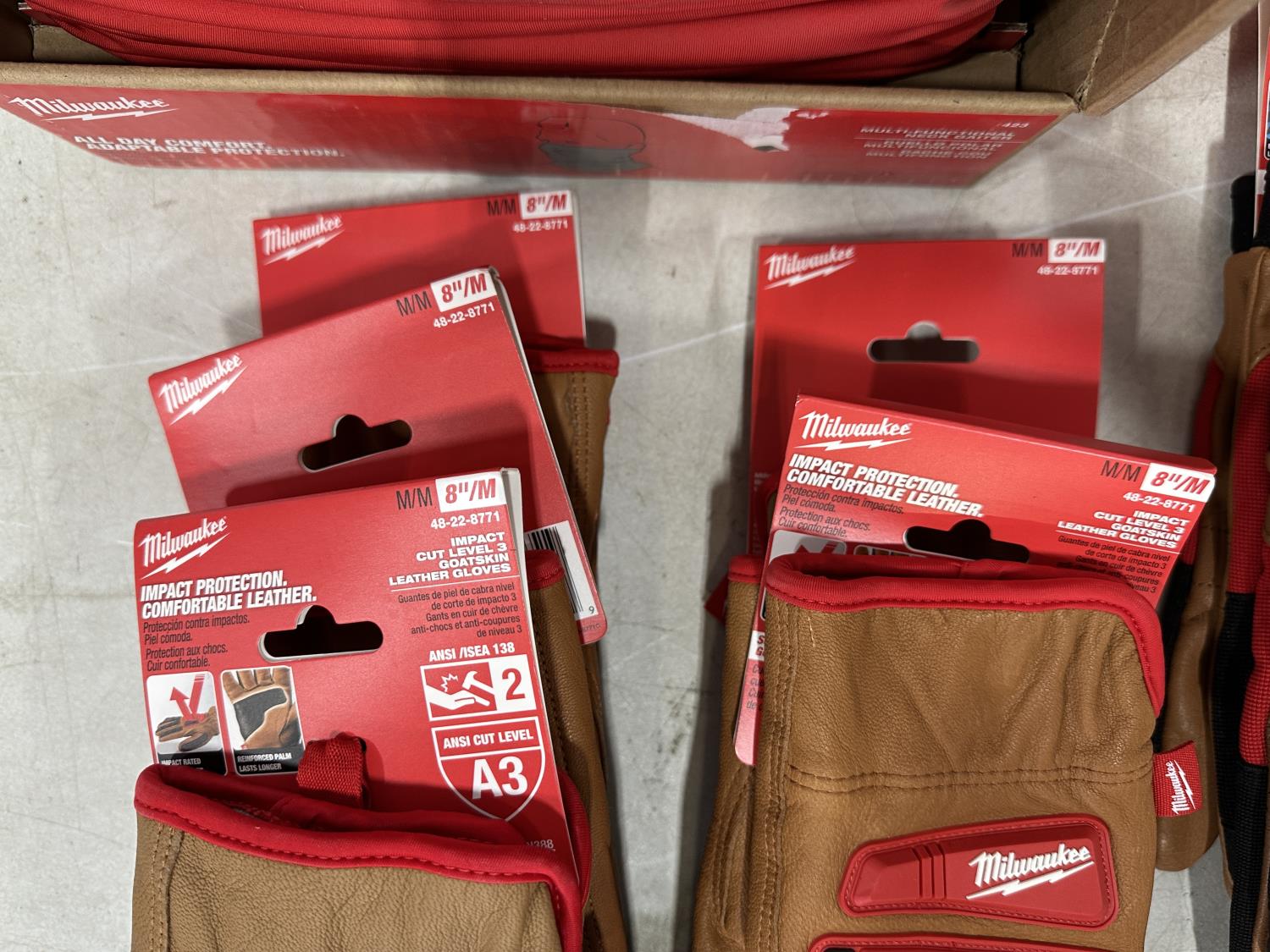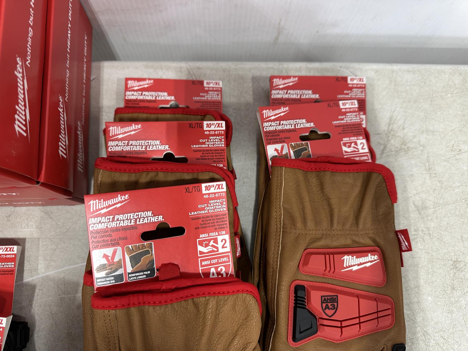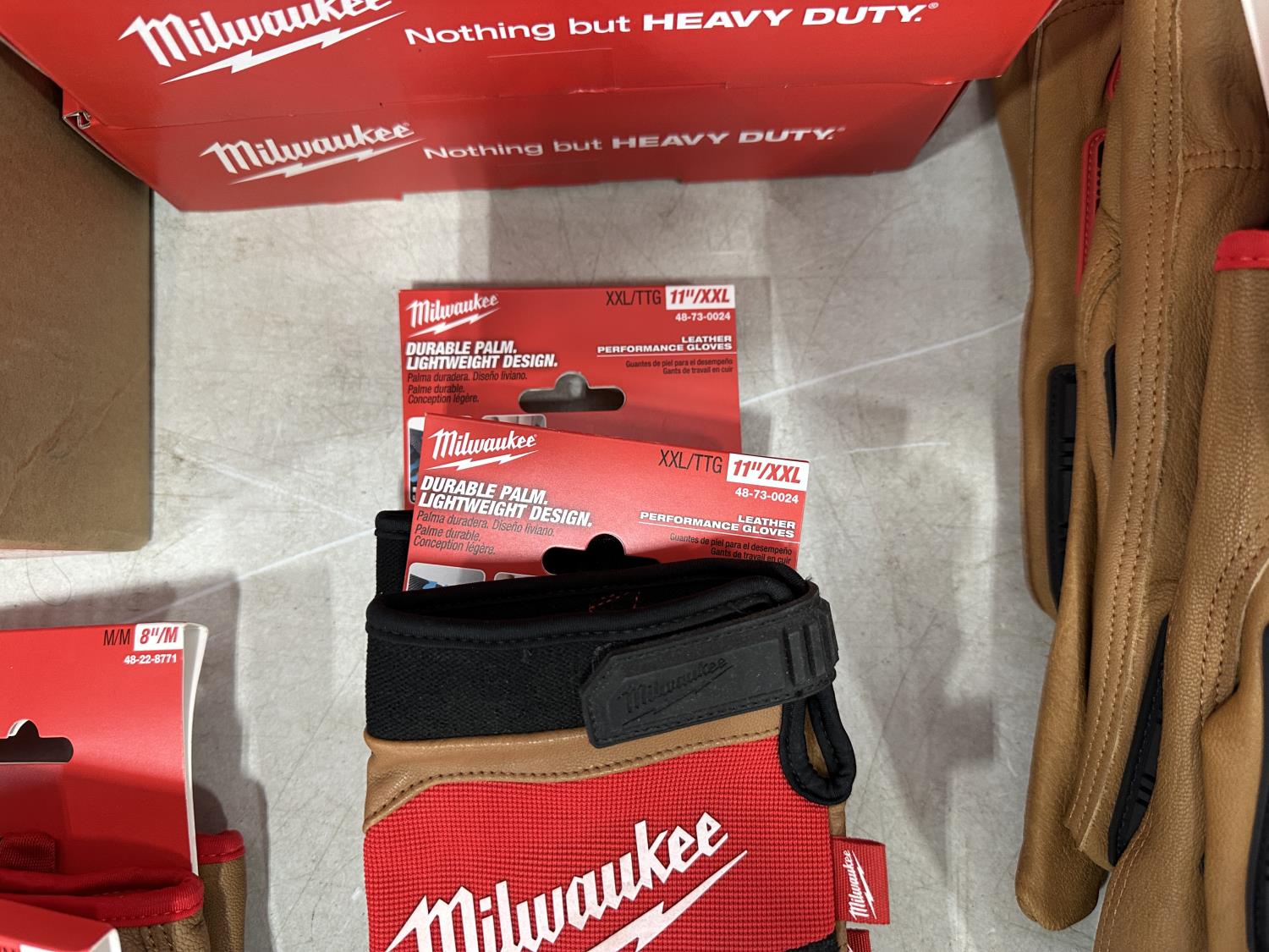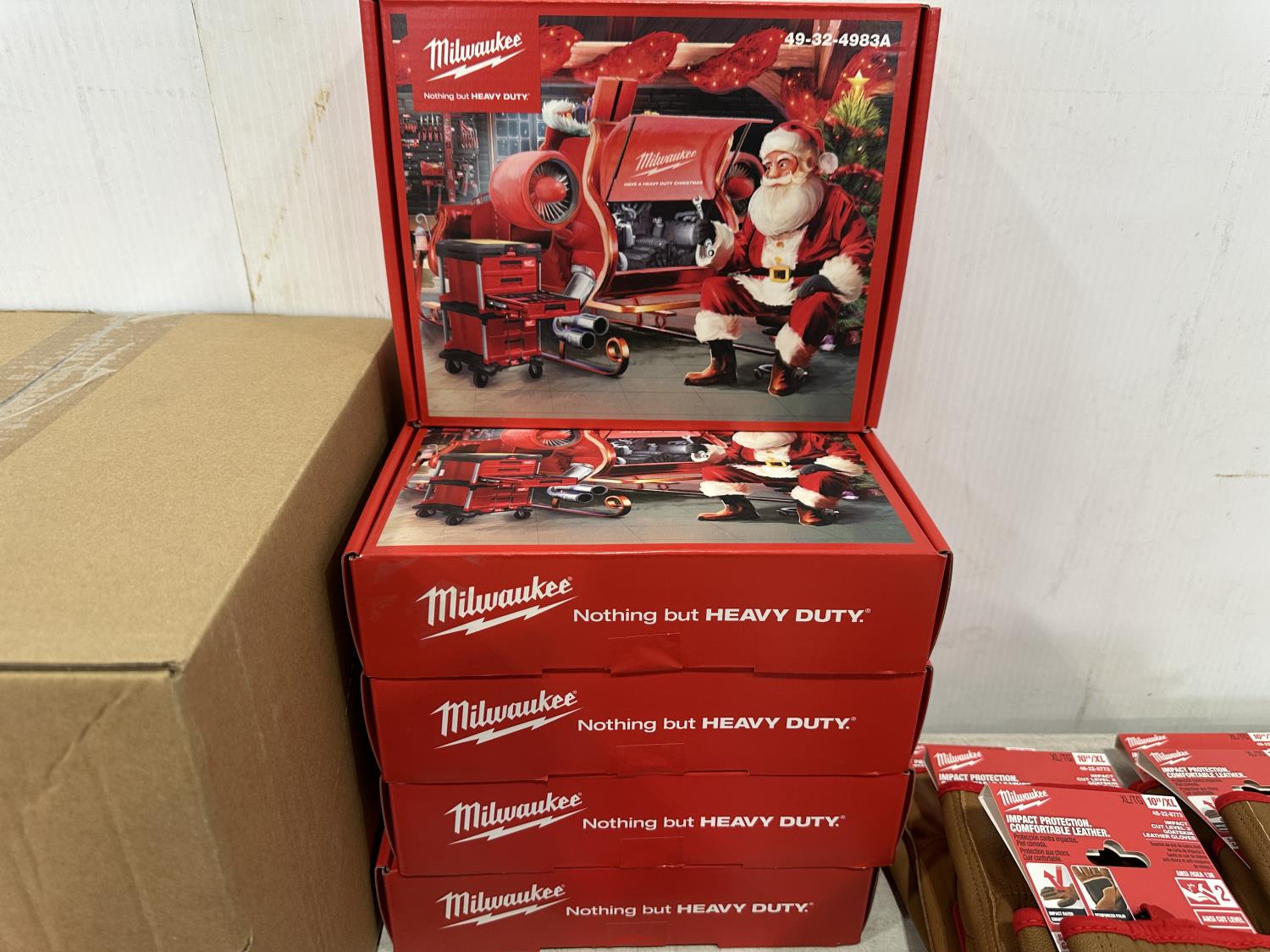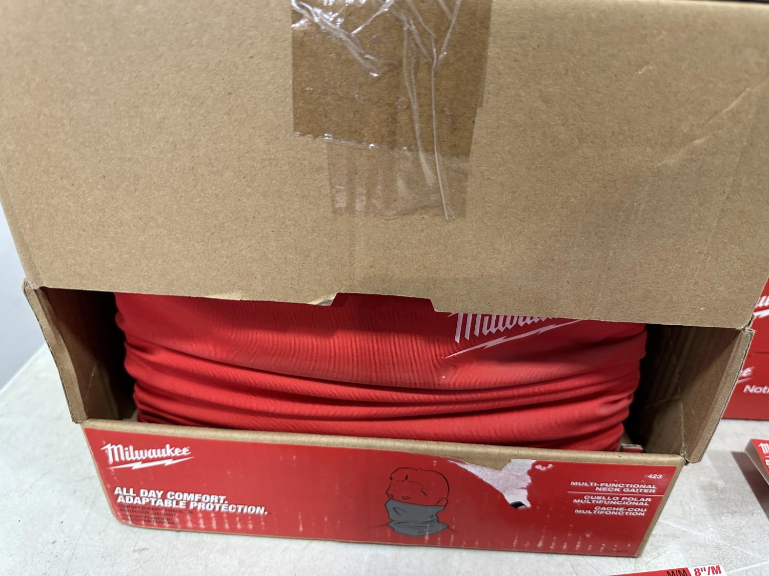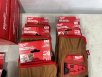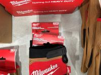 (10) Milwaukee gaiters, (5) advent calendars, (5) pairs of size medium gloves, (5) pairs of size XL gloves, (2) pairs of size XXL gloves