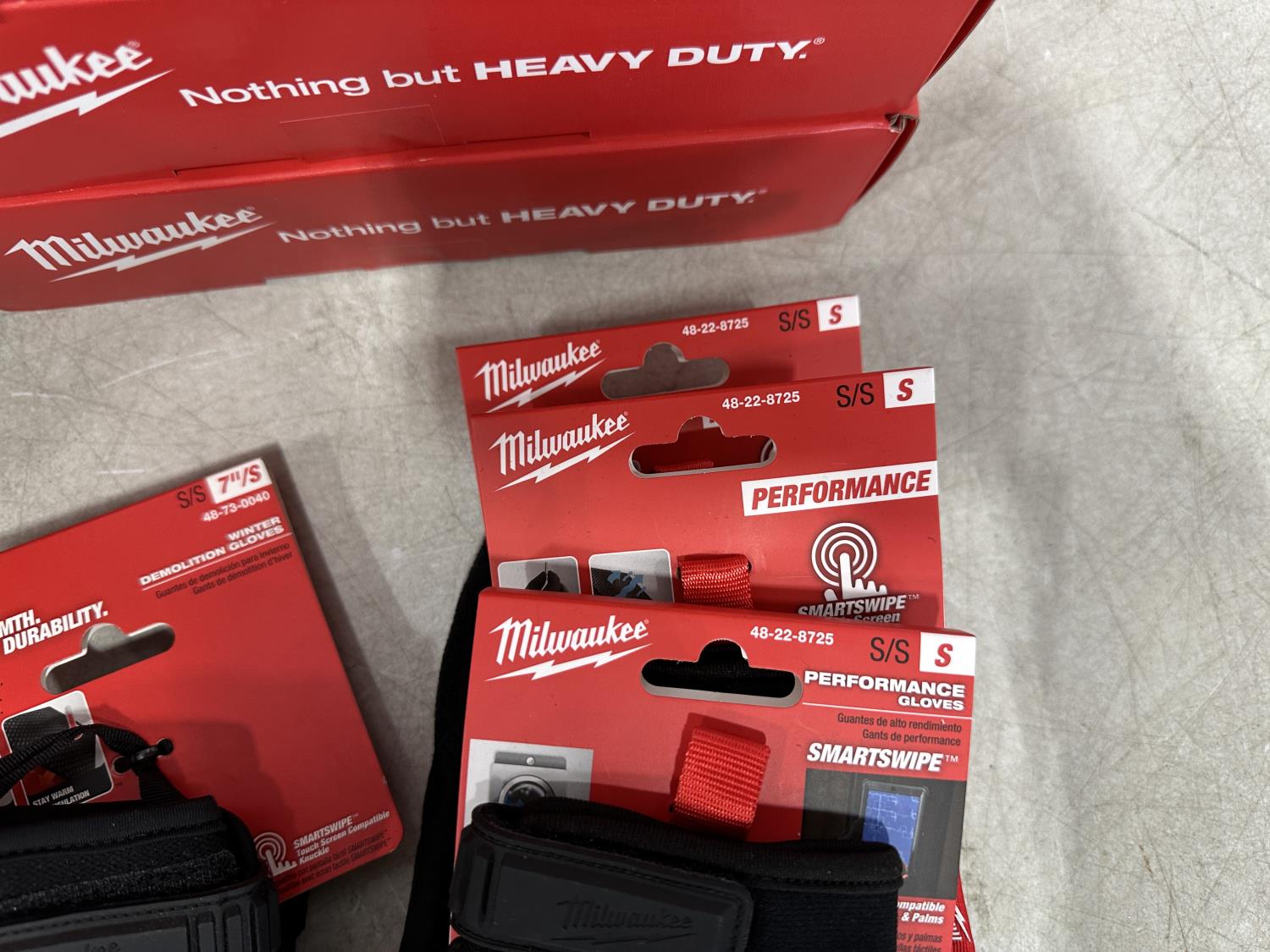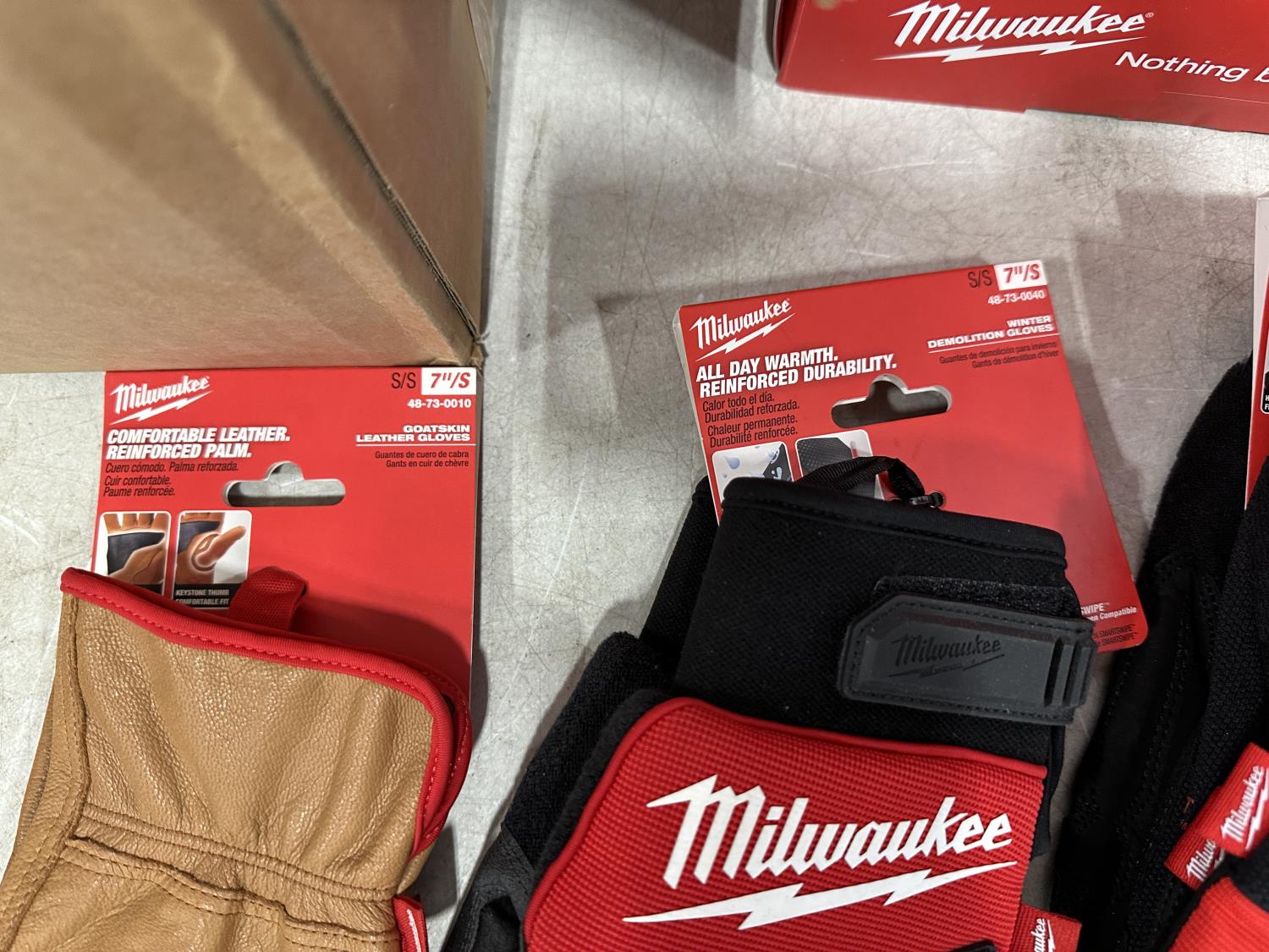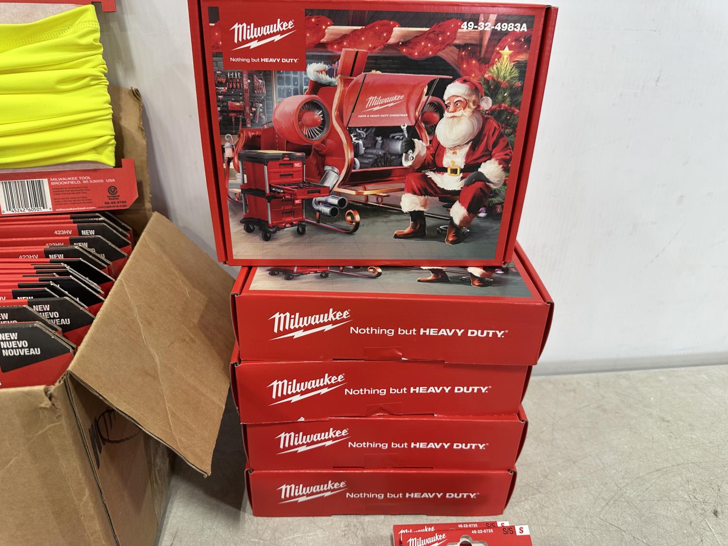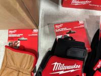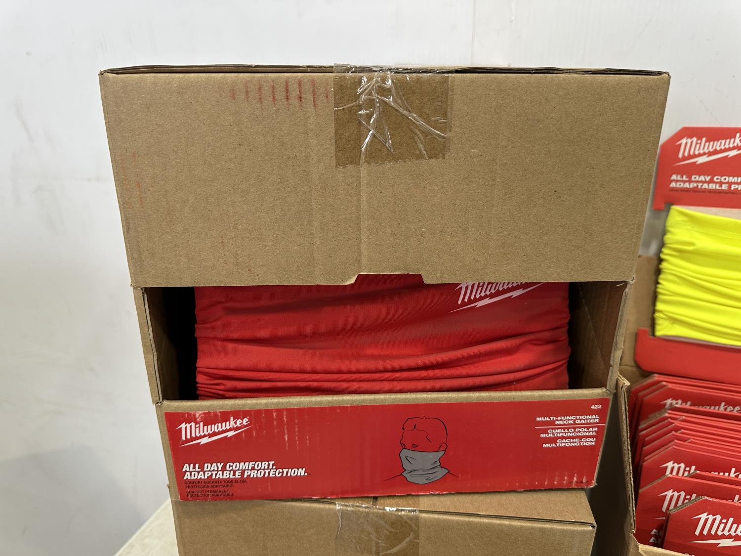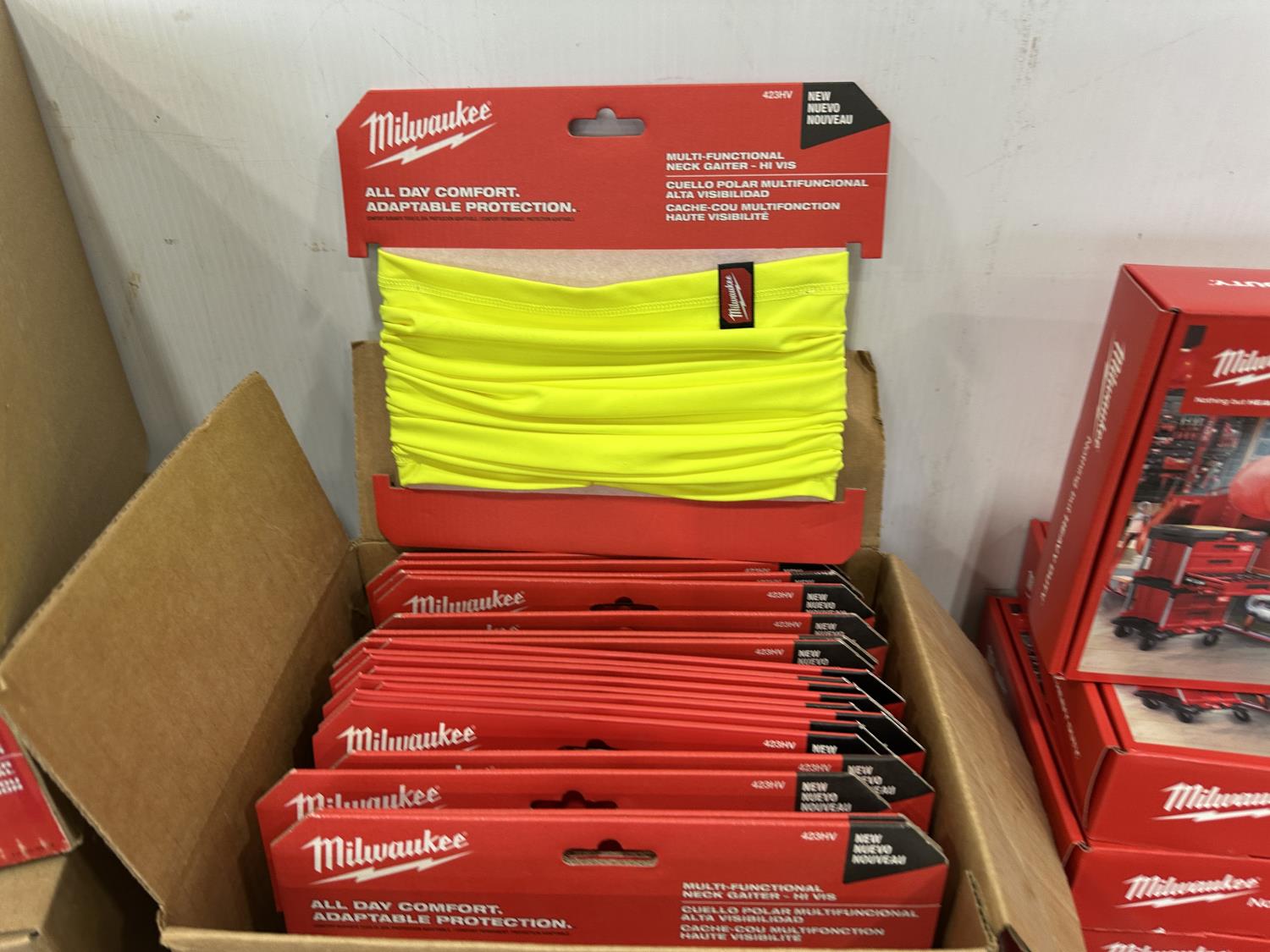 (5) Milwaukee advent calendars, (20) Milwaukee red gaiters, (20) yellow gaiters, (2) nail pullers, (4) Bosch hats, (4) blister bit organizers, (4) margin markers, (5) pairs of size small gloves