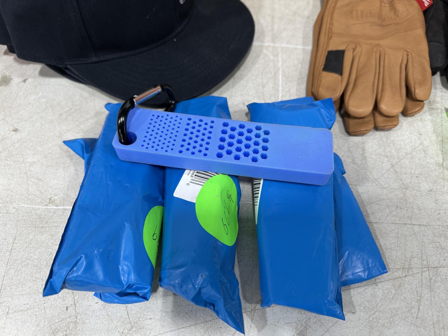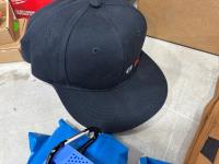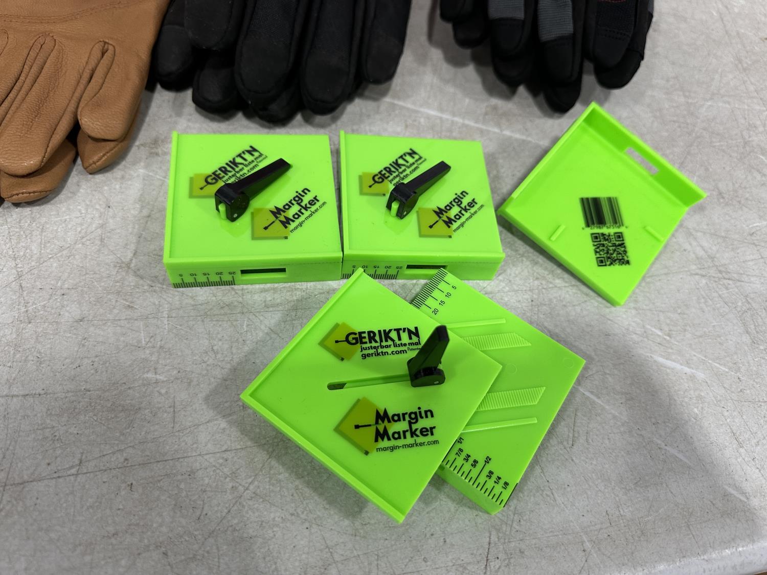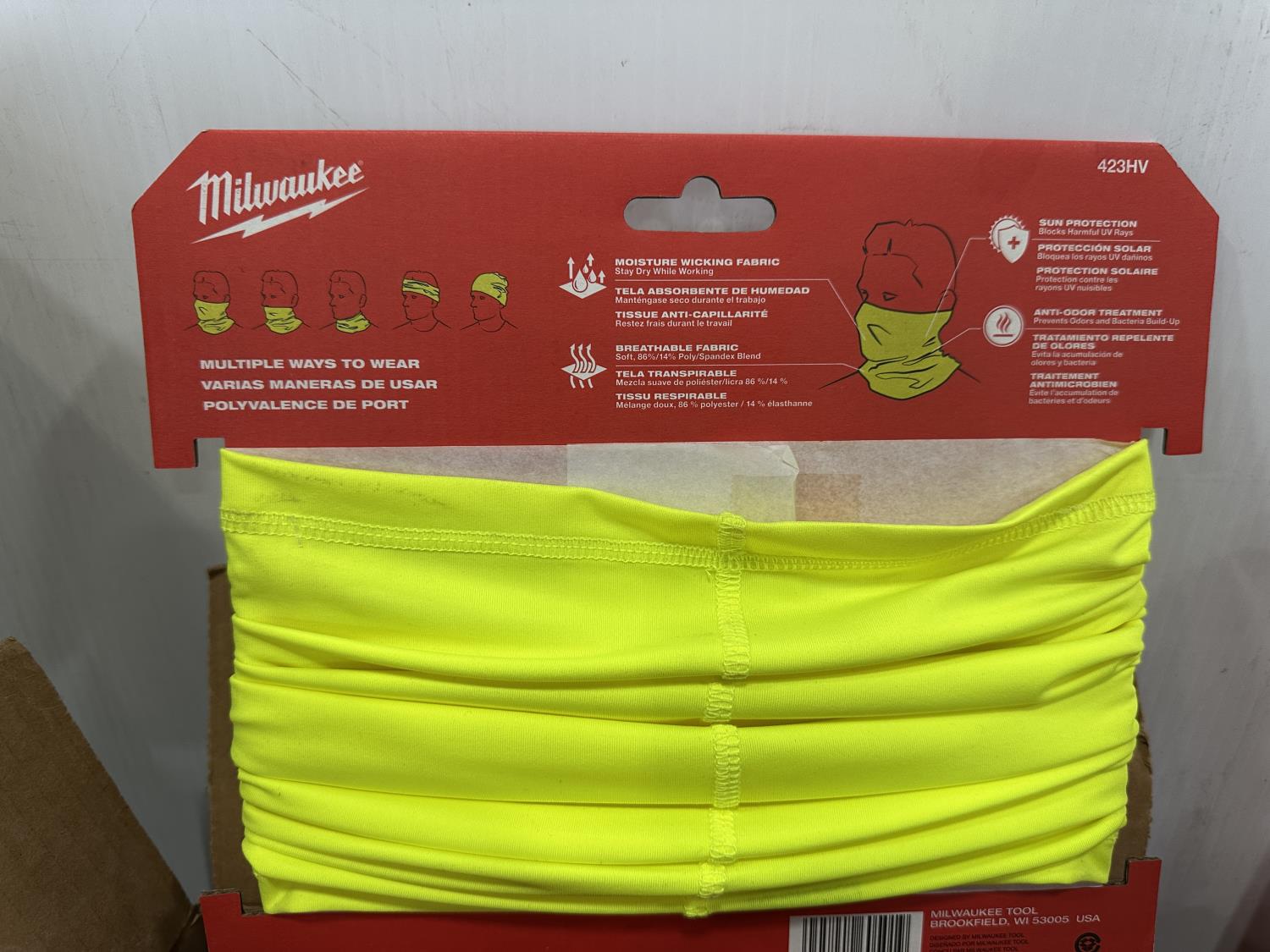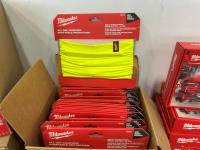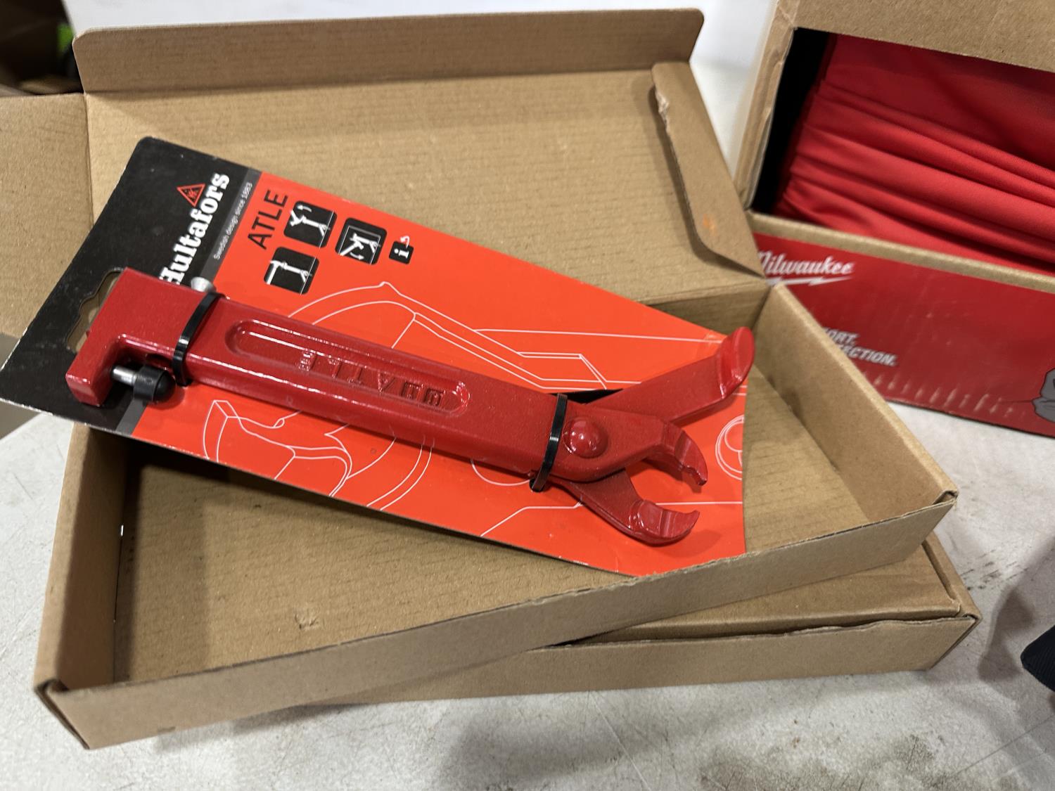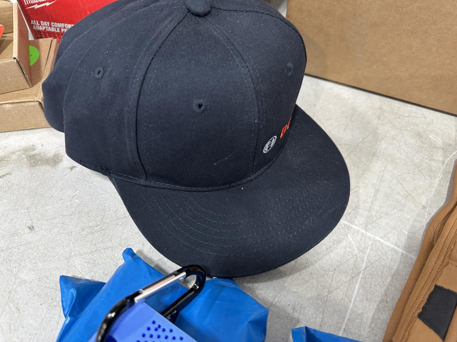 (5) Milwaukee advent calendars, (20) Milwaukee red gaiters, (20) yellow gaiters, (2) nail pullers, (4) Bosch hats, (4) blister bit organizers, (4) margin markers, (5) pairs of size small gloves