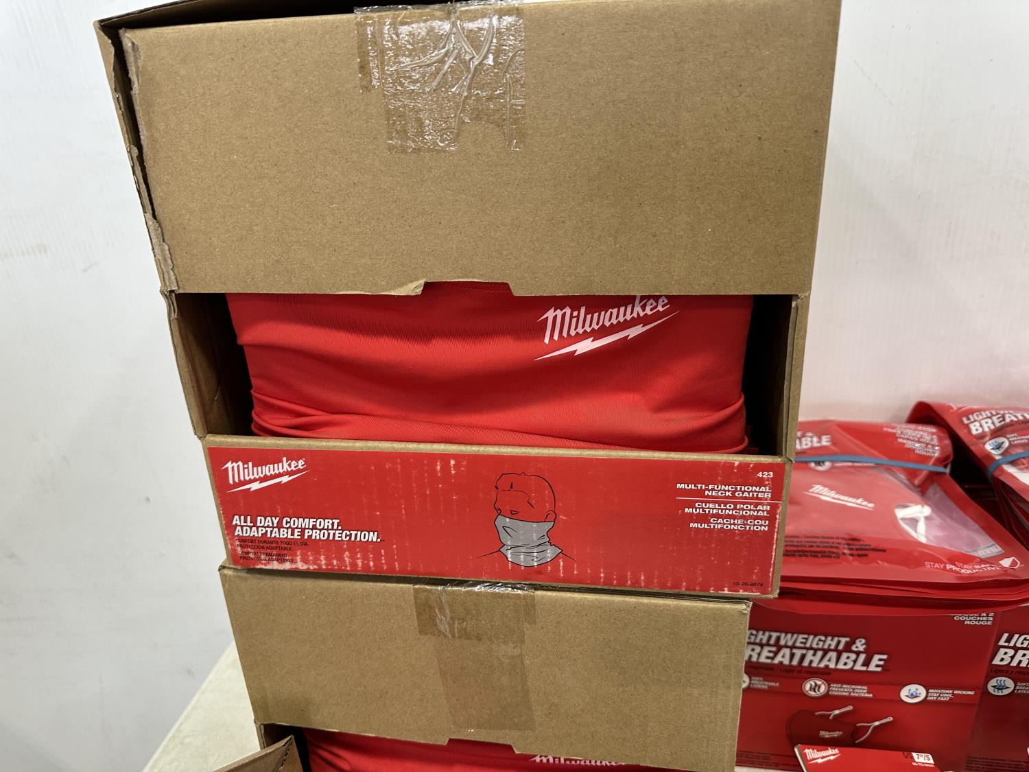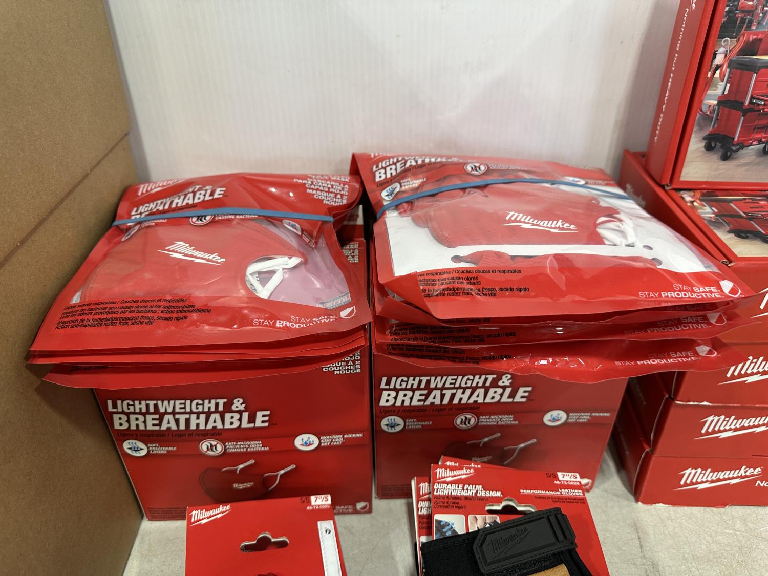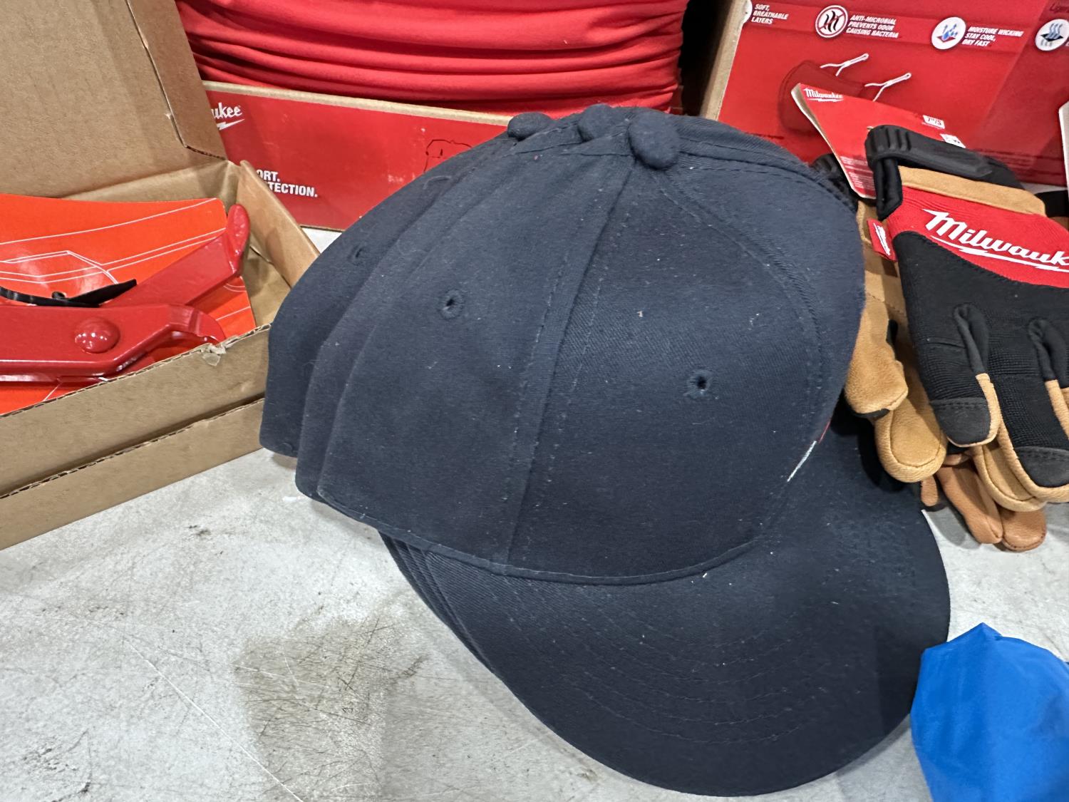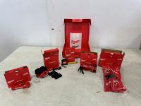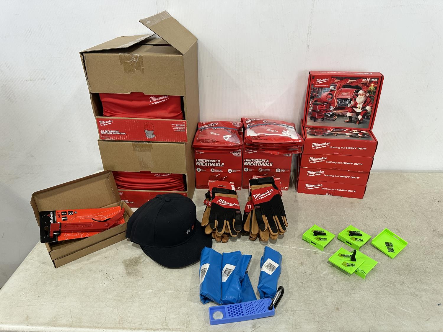 (5) Milwaukee advent calendars, (20) Milwaukee red gaiters, (37) face masks, (2) nail pullers, (4) Bosch hats, (4) blister bit organizers, (4) margin markers