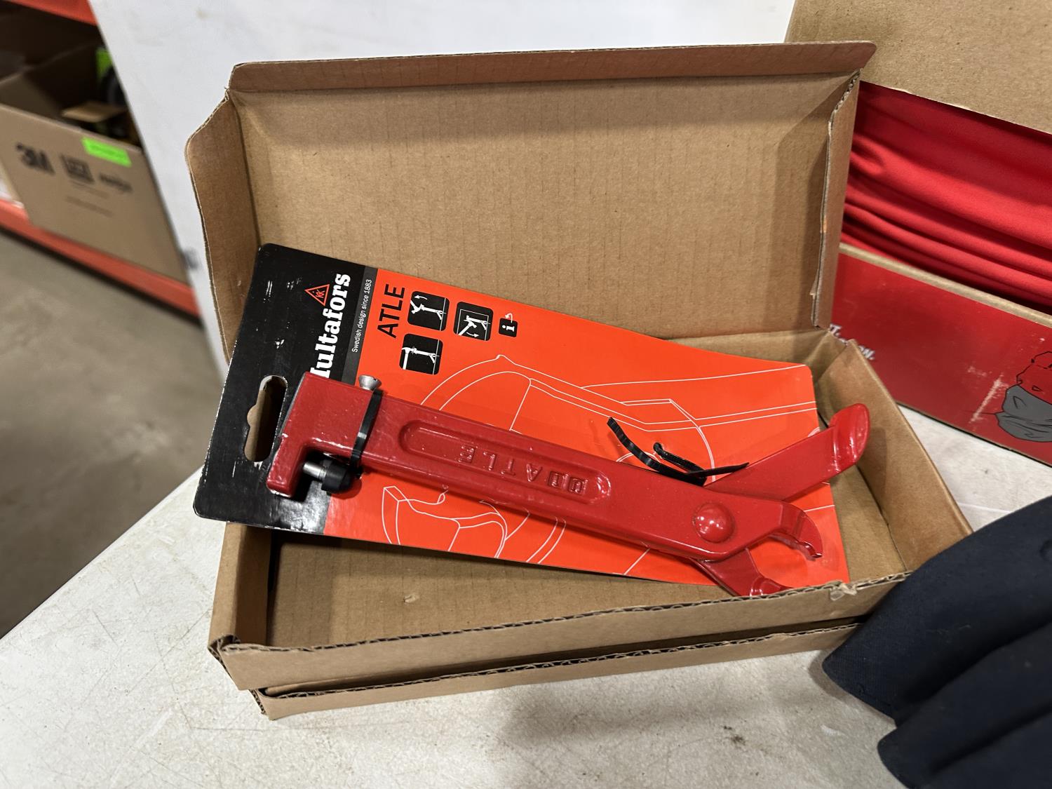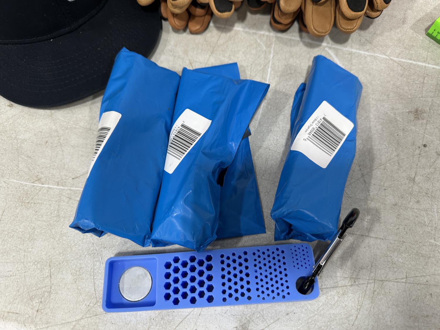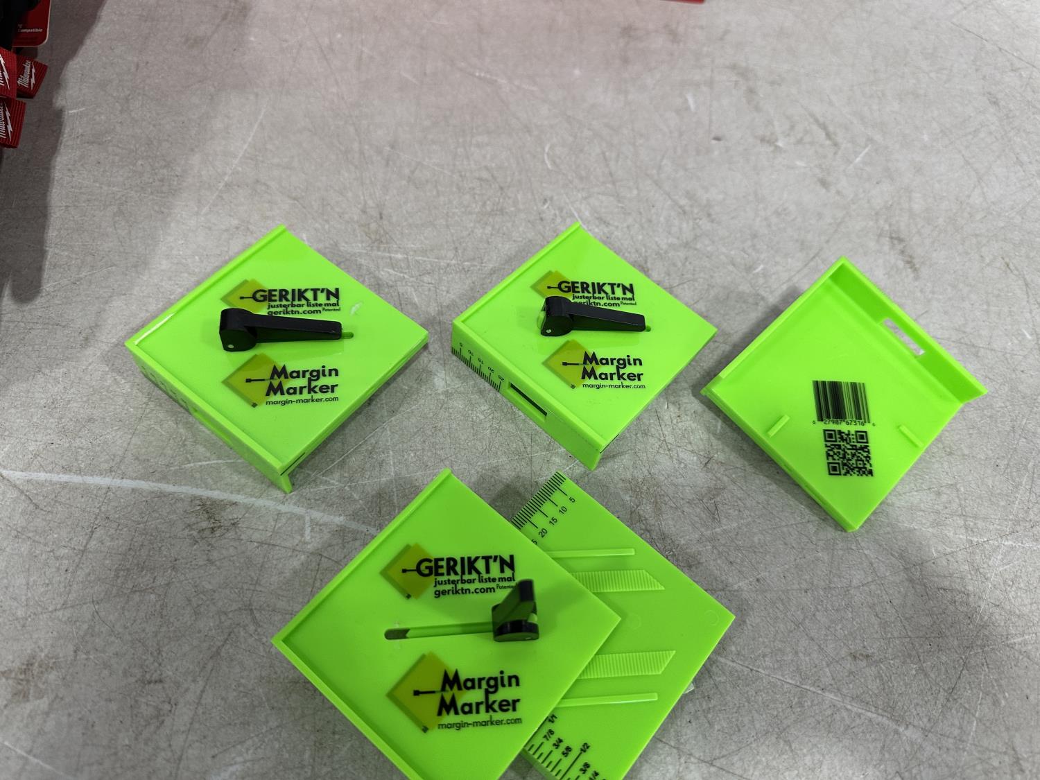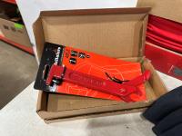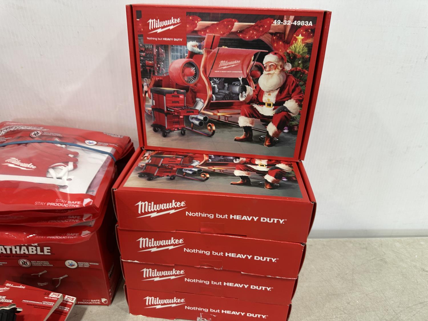 (5) Milwaukee advent calendars, (20) Milwaukee red gaiters, (37) face masks, (2) nail pullers, (4) Bosch hats, (4) blister bit organizers, (4) margin markers