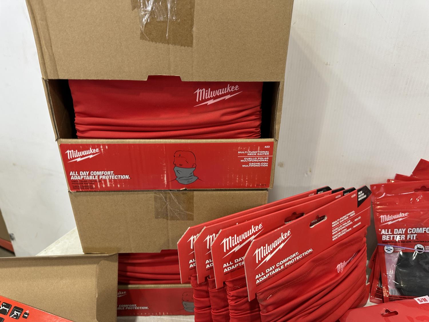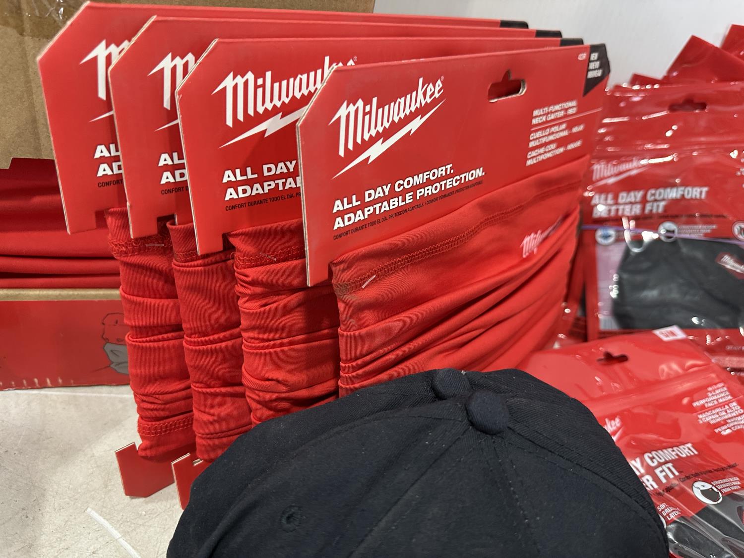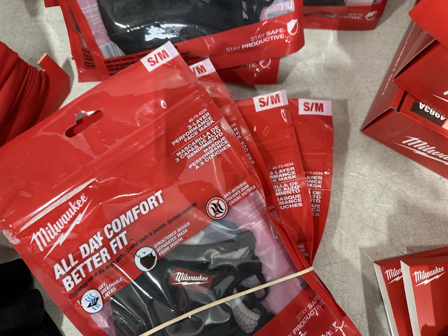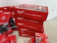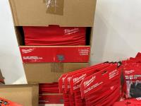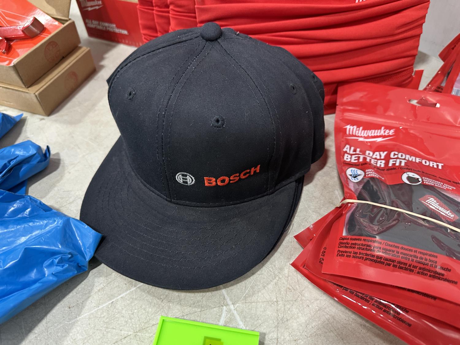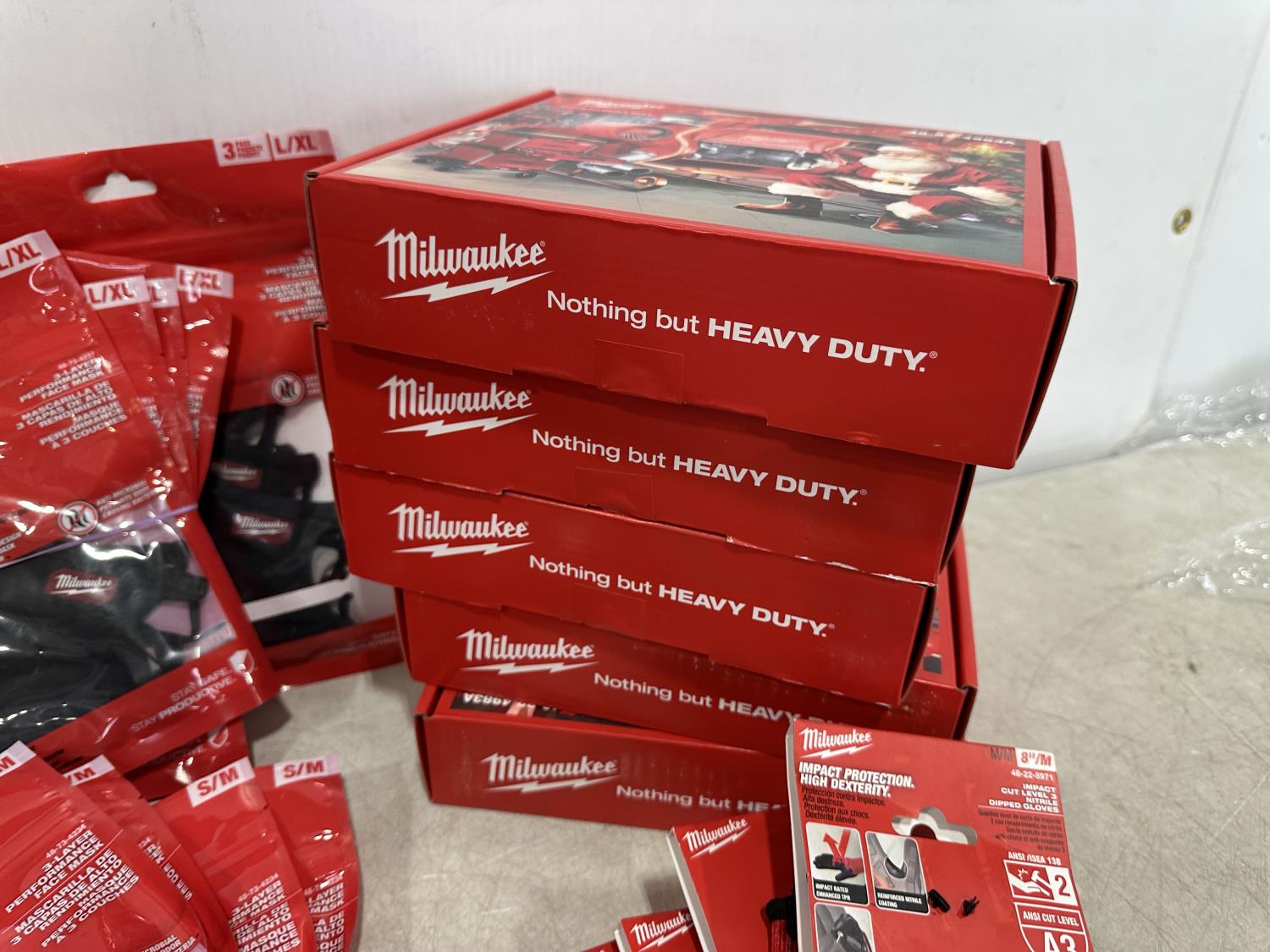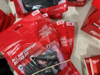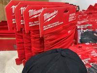 (5) Milwaukee advent calendars, (24) Milwaukee red gaiters, (11) face masks, (2) nail pullers, (4) Bosch hats, (4) blister bit organizers, (4) margin markers, (5) size medium gloves