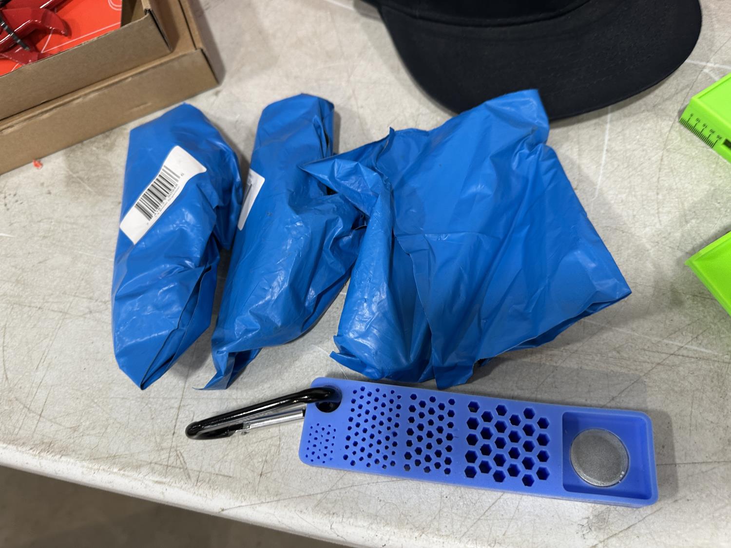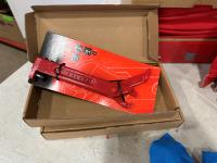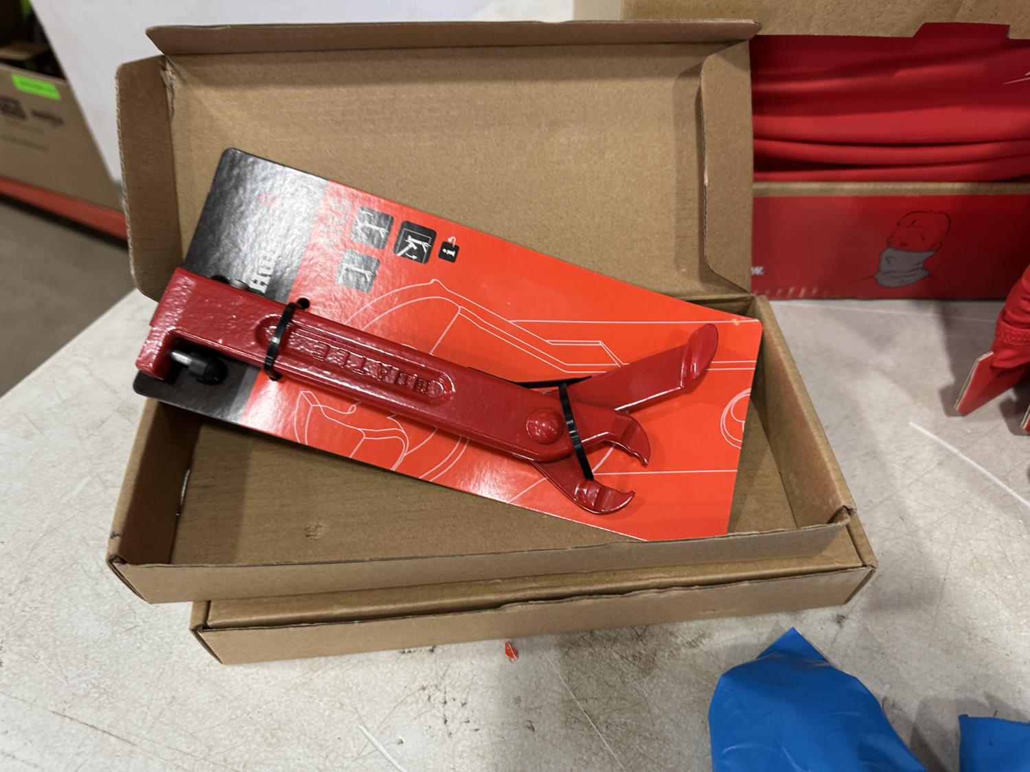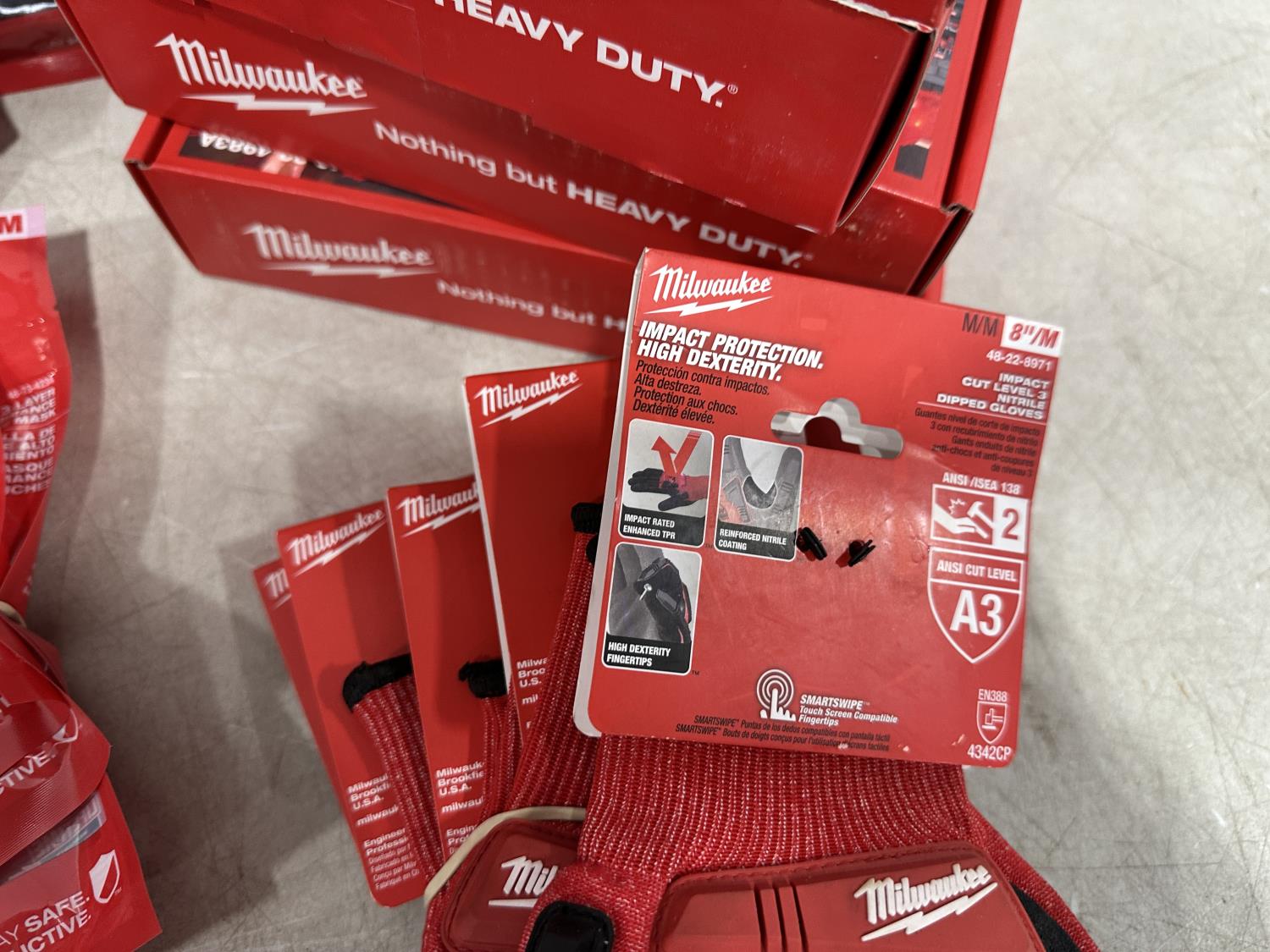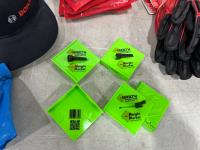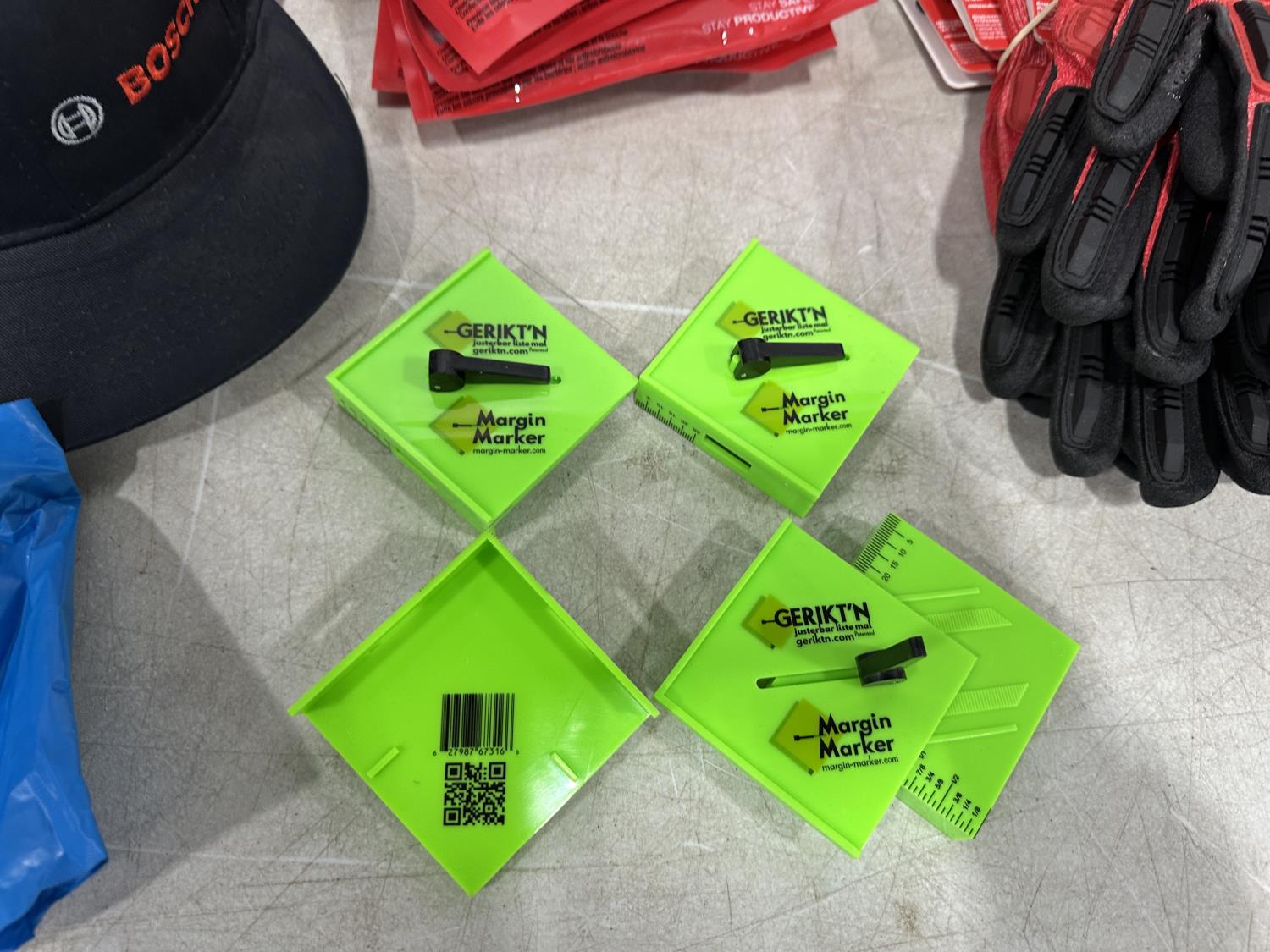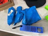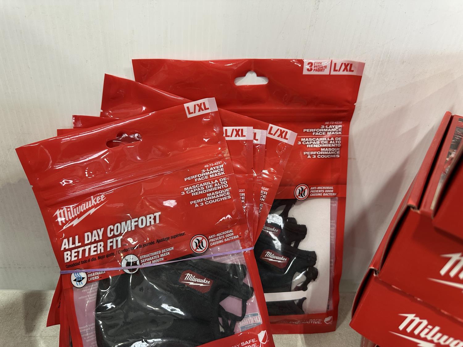 (5) Milwaukee advent calendars, (24) Milwaukee red gaiters, (11) face masks, (2) nail pullers, (4) Bosch hats, (4) blister bit organizers, (4) margin markers, (5) size medium gloves