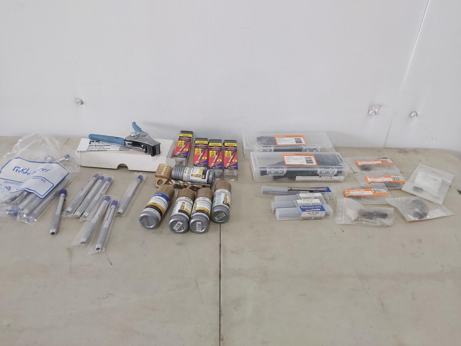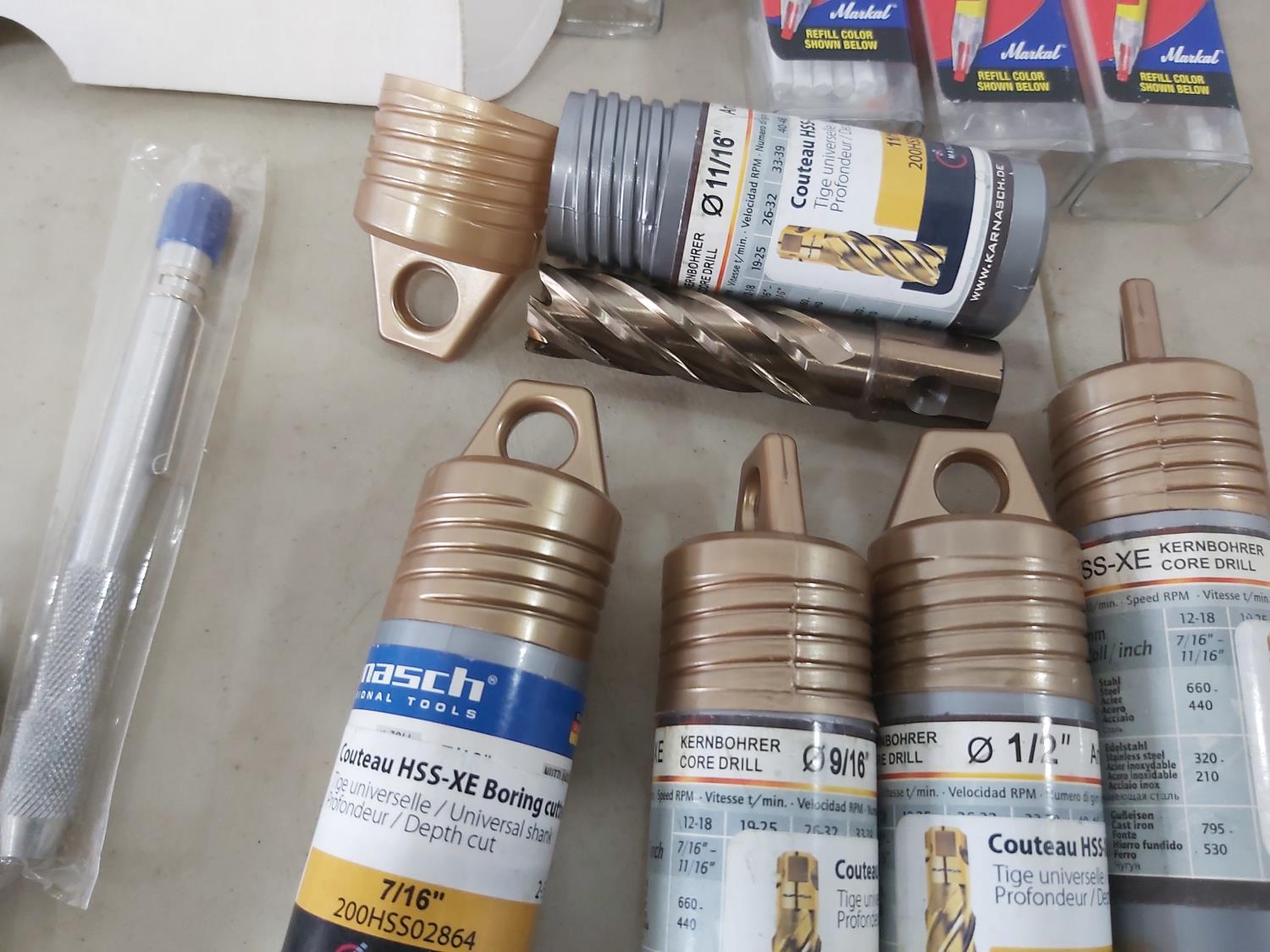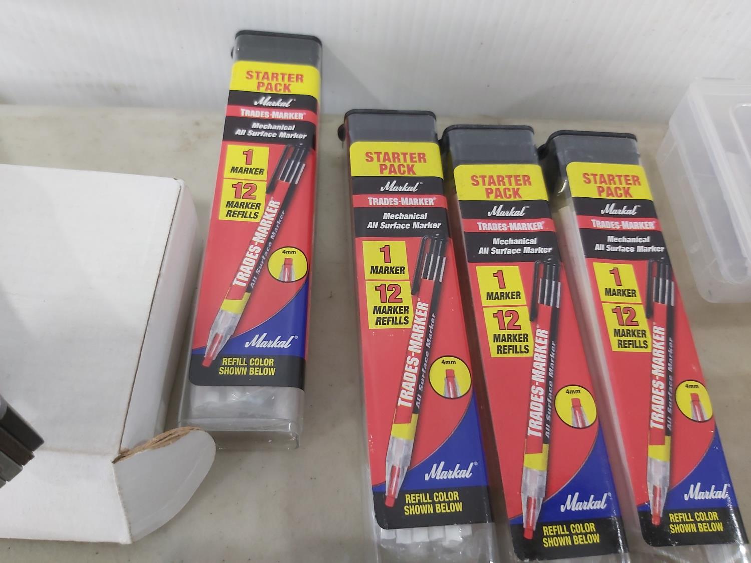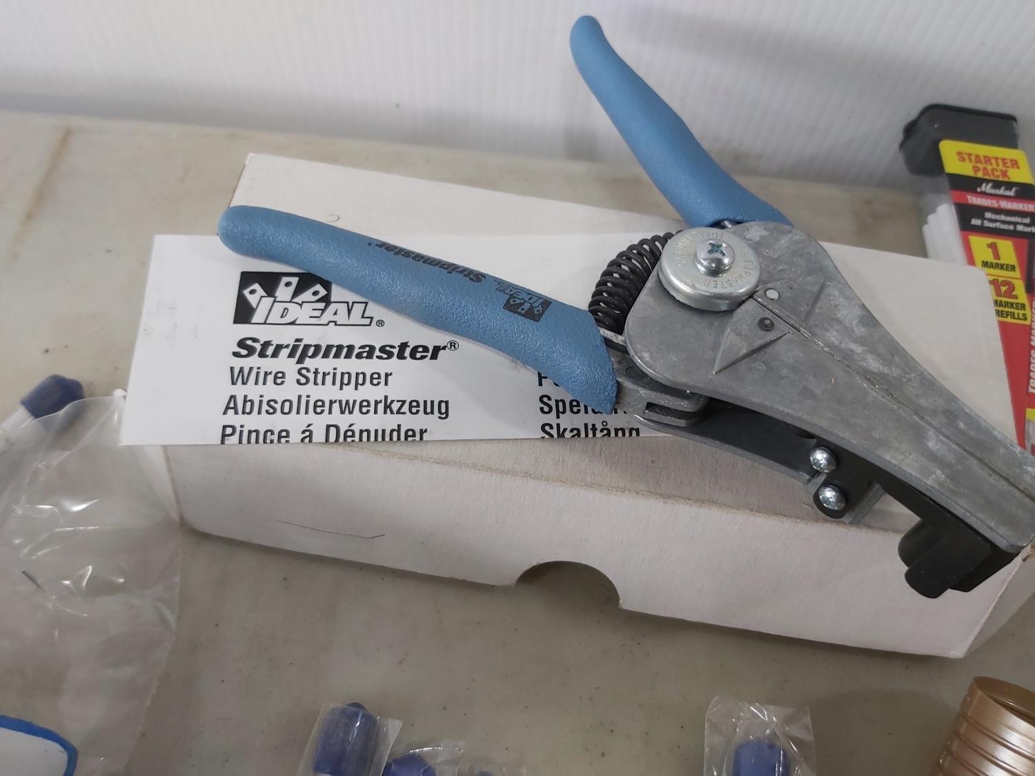 (19) chalk/soapstone holders, (4) Trademarker starter kits, (5) boring cutters, (4) ejector pins, (10) Surfox threaded train brushes, Ideal Stripmaster wire strippers, (6) carbon brush sets