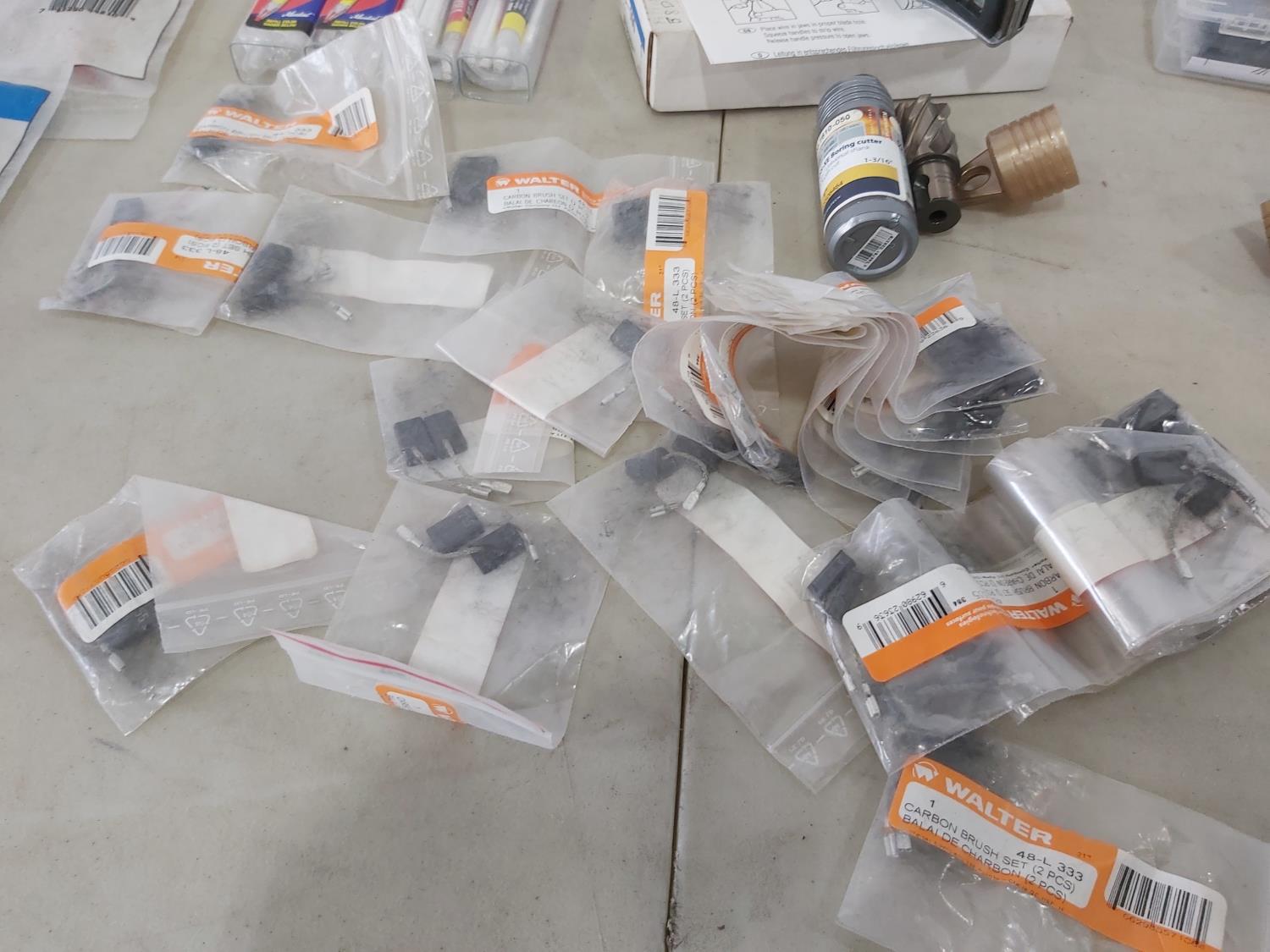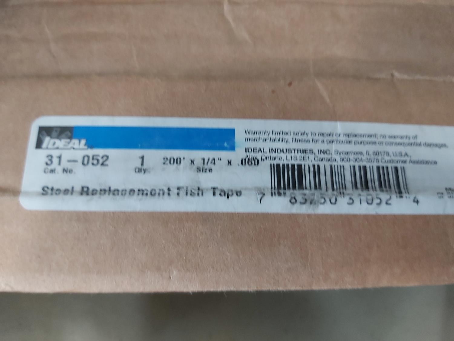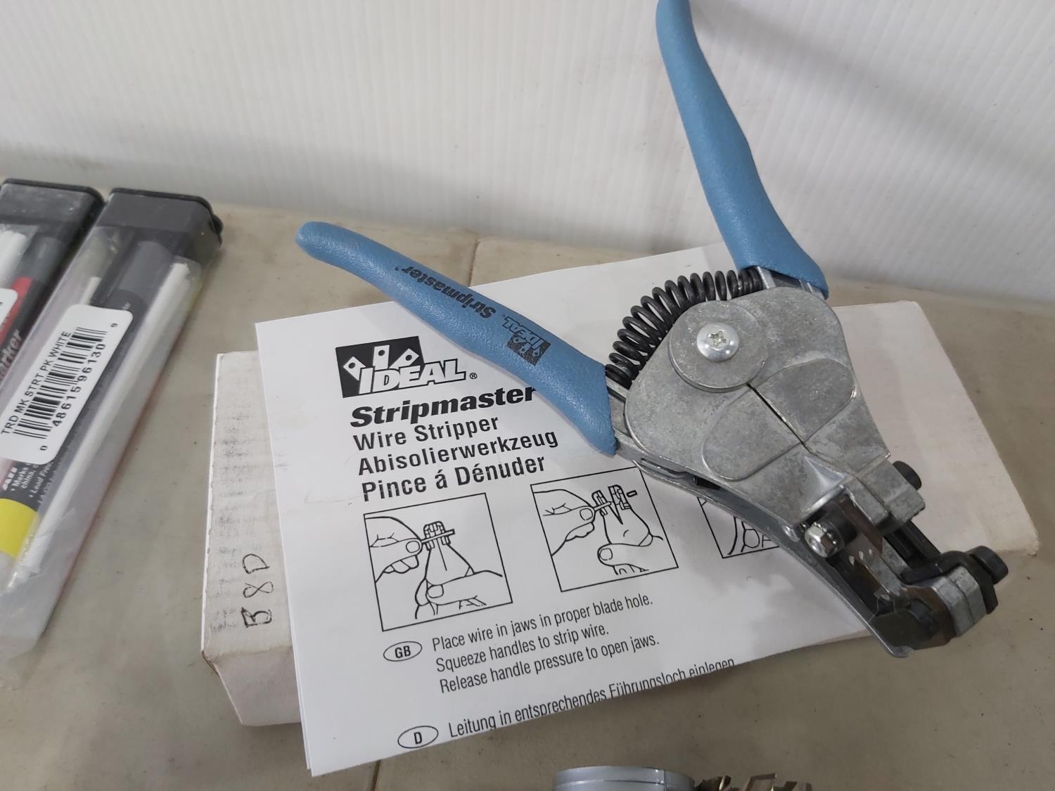 200 ft fish tape, qty of carbon brush sets, Surfox threaded round brush, Ideal Stripmaster wire stripper, (2) boring cutters, (4) Tradesmarker starter packs, (3) single pole breaker lockouts
