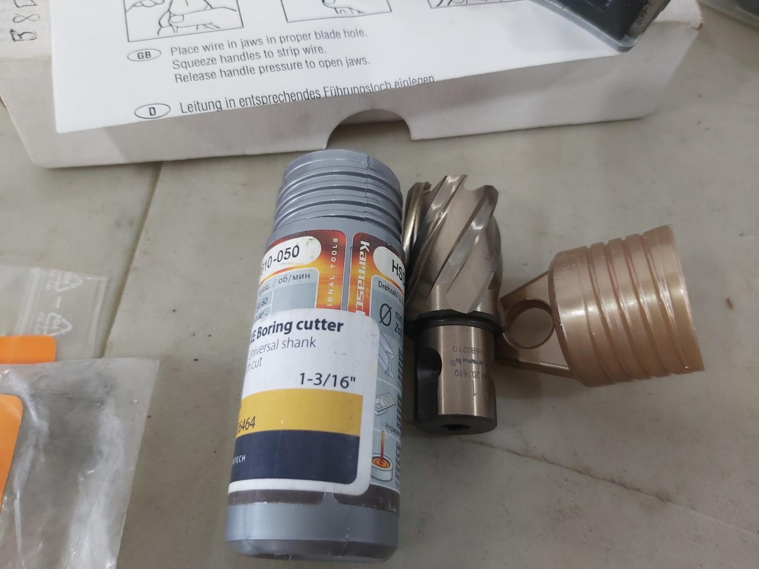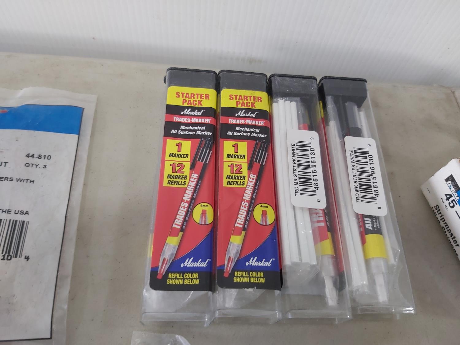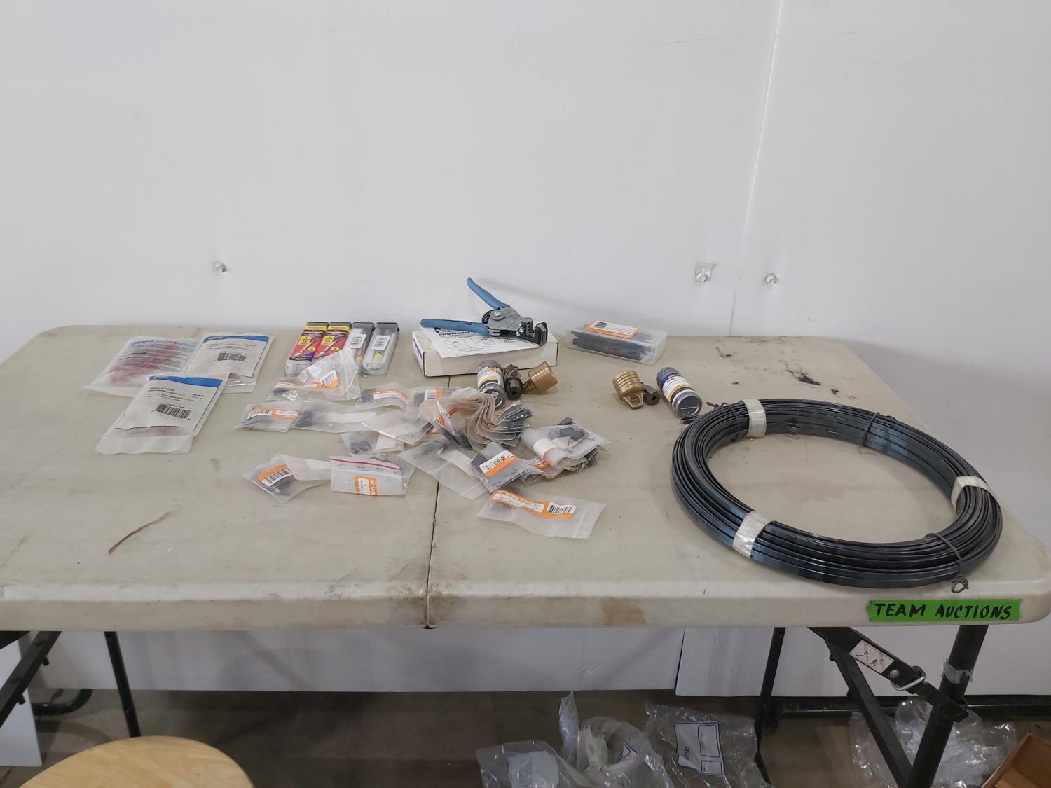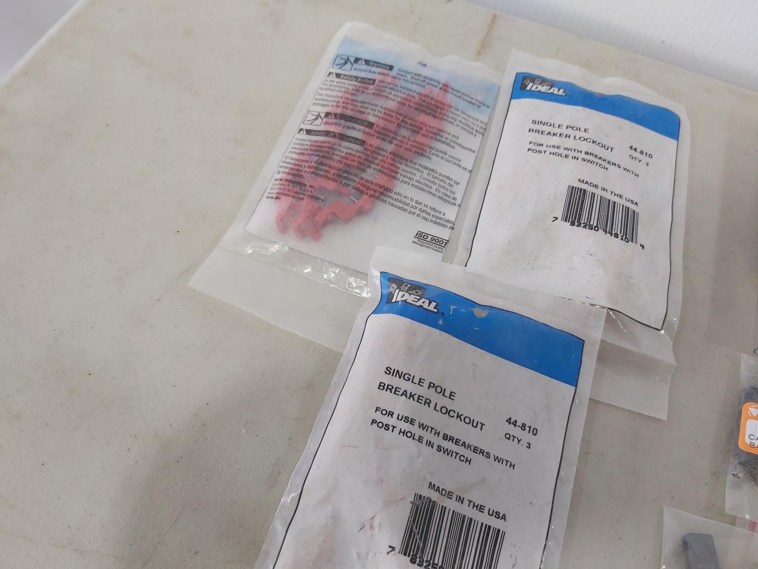 200 ft fish tape, qty of carbon brush sets, Surfox threaded round brush, Ideal Stripmaster wire stripper, (2) boring cutters, (4) Tradesmarker starter packs, (3) single pole breaker lockouts