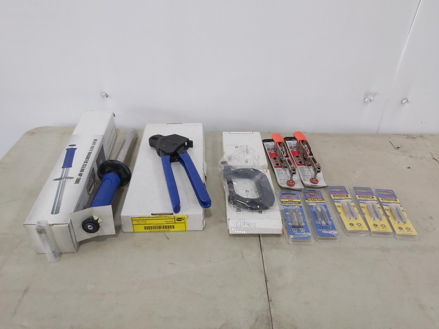 Magnetic clean up tool, 1/2 inch pex crimper tool, (2) 2 inch c-clamps, (2) auto adjust toggle clamps, (10) hex bits